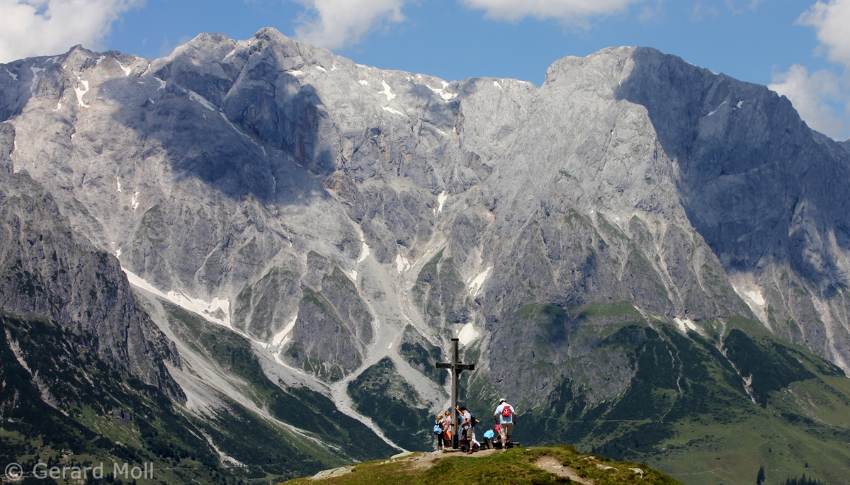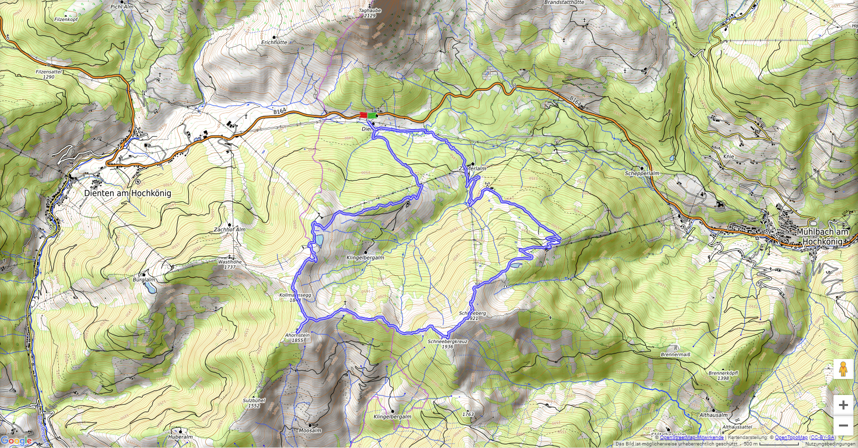 Diese herrliche Aussichtstour hat ihren Anfang bei dem Birgkarhaus am Dientener Sattel (1370 m). Über die Tiergartenalm und Kollmannsegg (1848 m) erreicht man den Ahornstein (1855 m). Am Klausalmkreuz vorbei erreichen wir den höchsten Punkt der Tour, das Schneebergkreuz (1938 m). Nur eine kurze Strecke trennt uns vom Schneeberg (1921 m). Über die Karbachalm und die Fellersbachalm kehren wir zum Dientener Sattel zurück.
