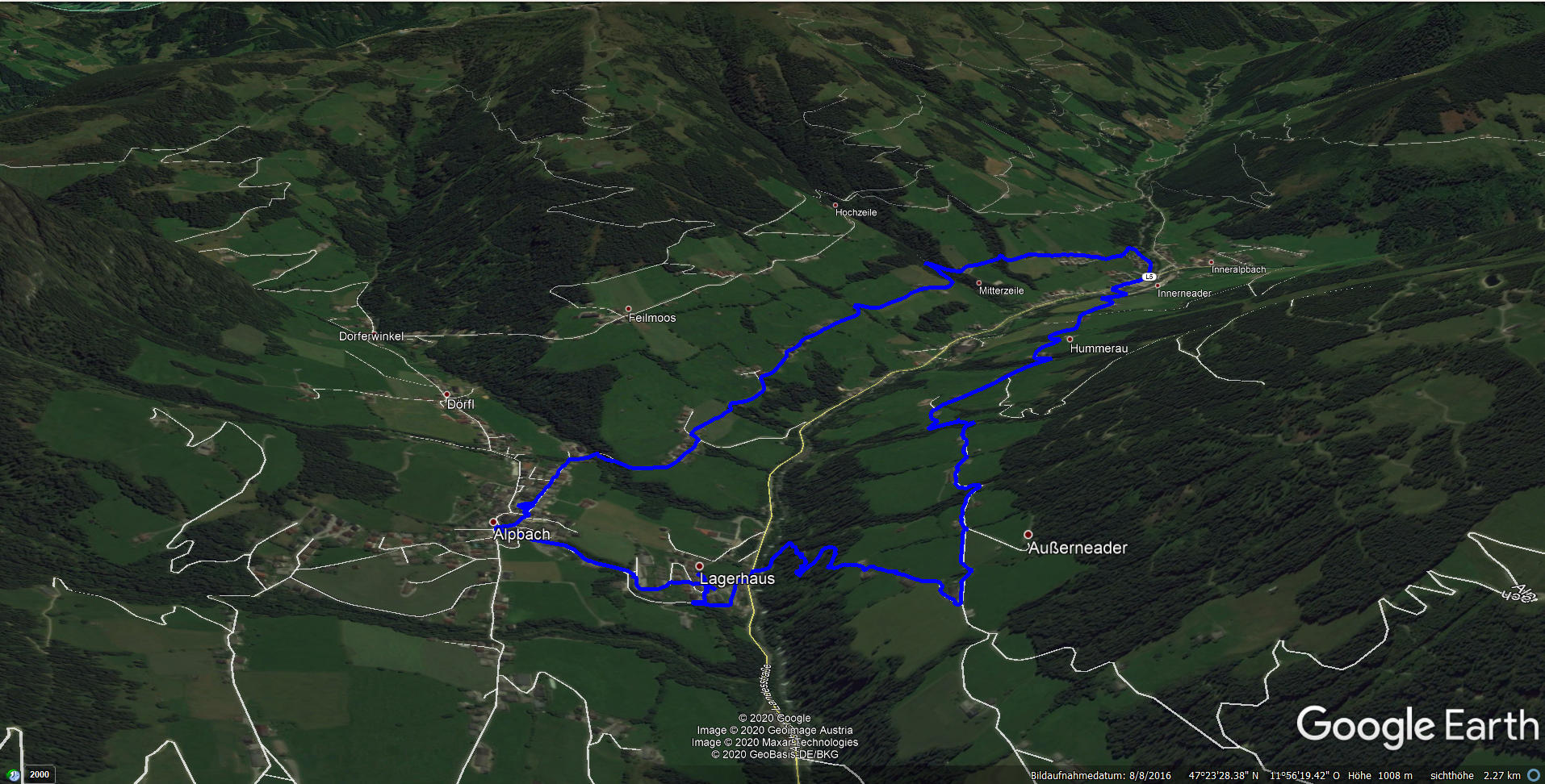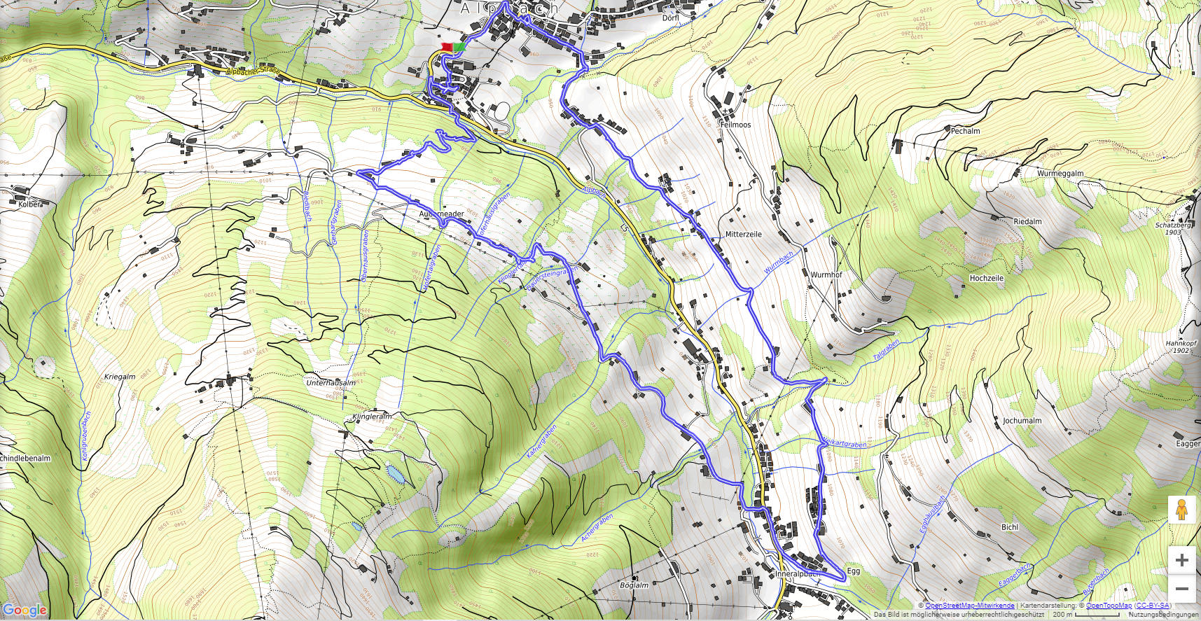 Wir haben etwas unterhalb der Ortsmitte von Alpbach geparkt und sind zuerst wieder zur Hauptstraße abgestiegen. Von dort führt der Weg zuerst steiler bis Oberhaus, dann geht es gemütlich und mit herrlichen Aussichten bis Inneralpbach. Ein weiterer Aufstieg bringt uns bis nahe an die Stettauer Mühle, von der wir ins Zentrum von Alpbach hinüber wandern.
