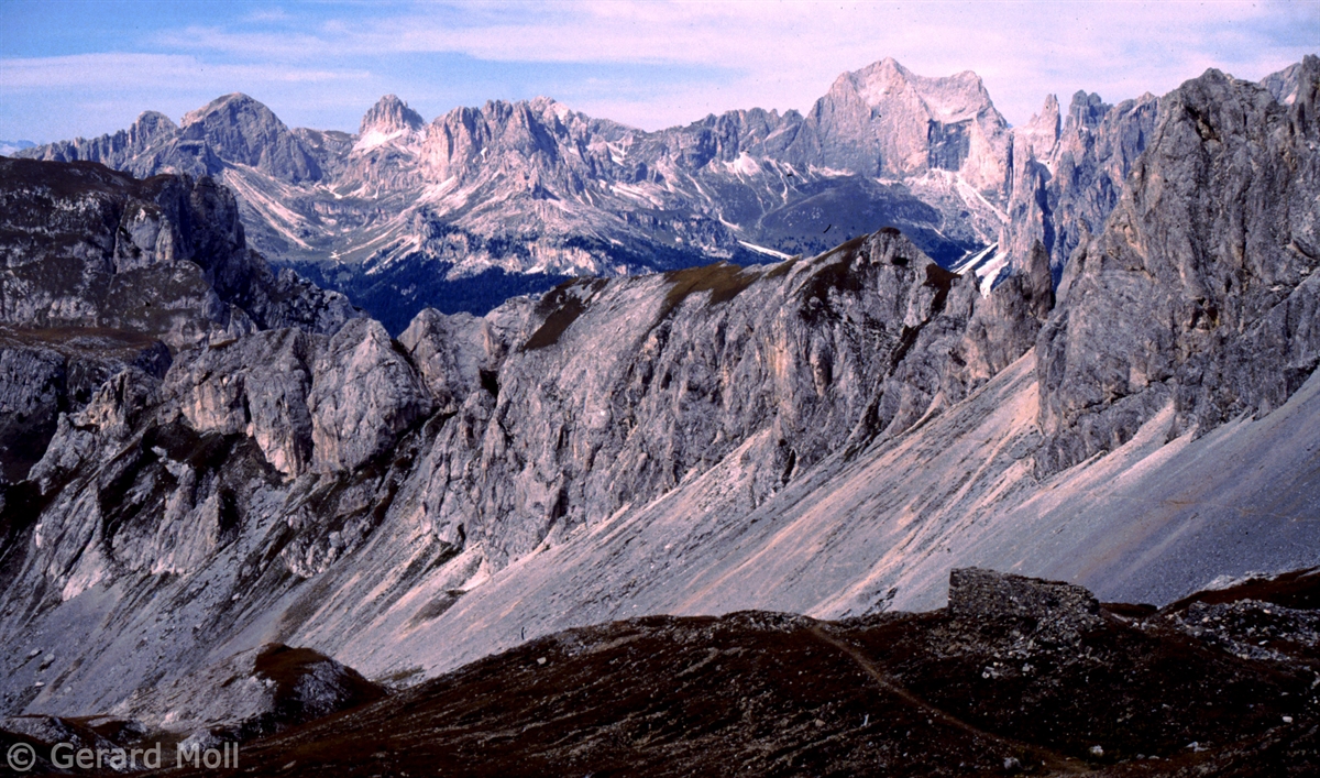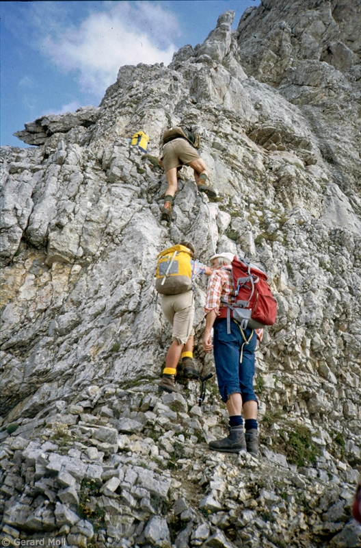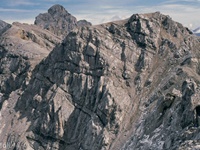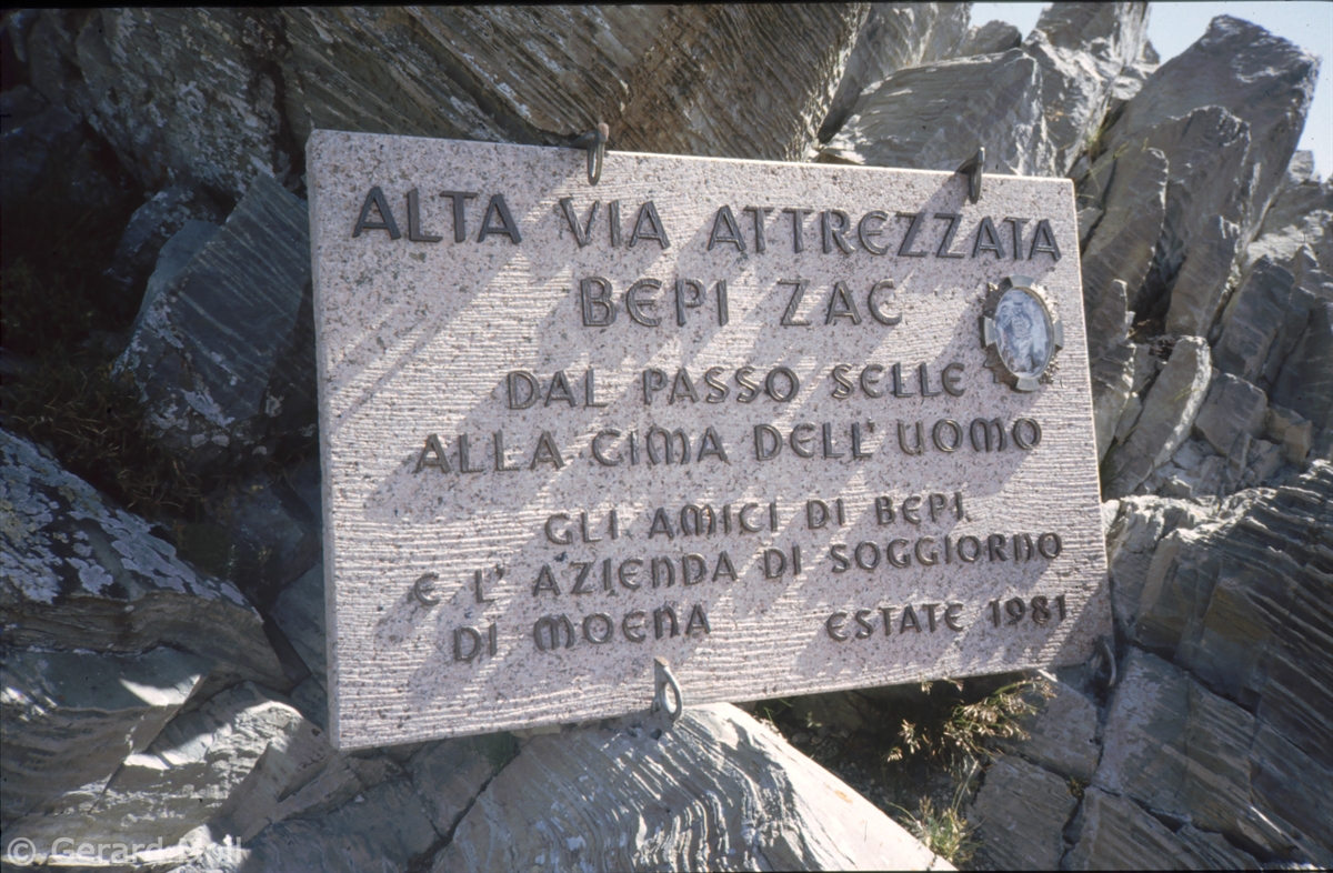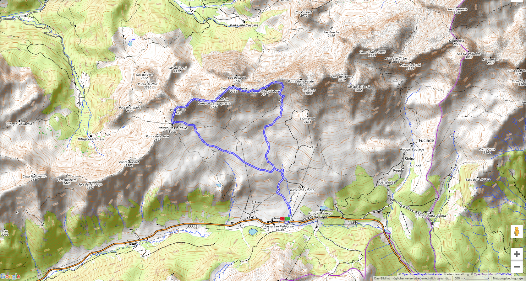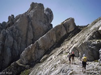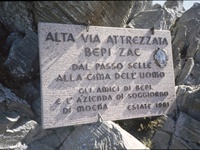 Vom Pellegrinopass (1907 m) steigen wir durch Wiesen zum Rifugio Passo delle Selle (2528 m). Hier beginnt die gesicherte Alta Via Beppi Zac, die uns auf gesicherten, alten Kriegsteigen über den Costabellakamm führt. Bei unserer Begehung gab es noch den Klettersteig zur Cima dell Uomo (3010 m), der aber später wegen zu grosser Steinschlaggefahr abgebaut wurde.