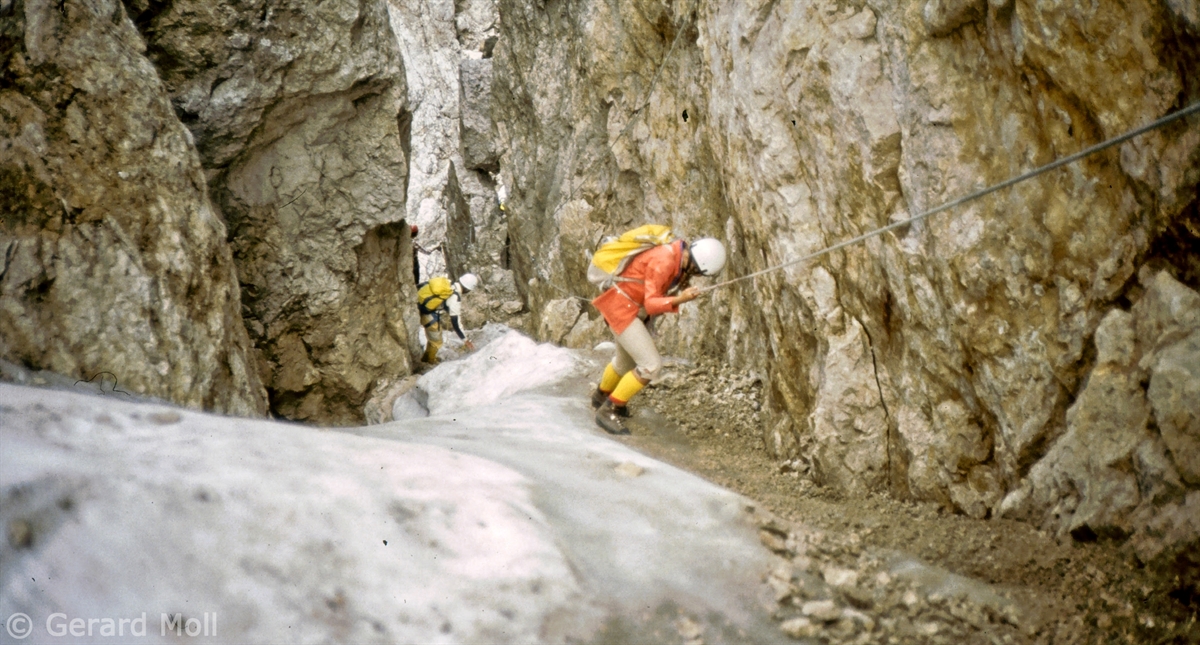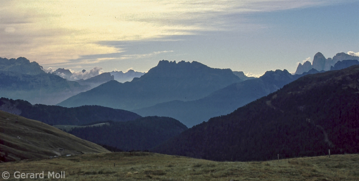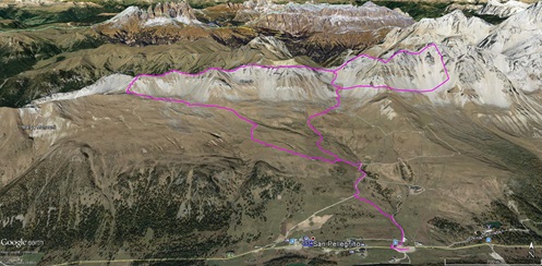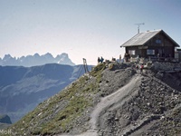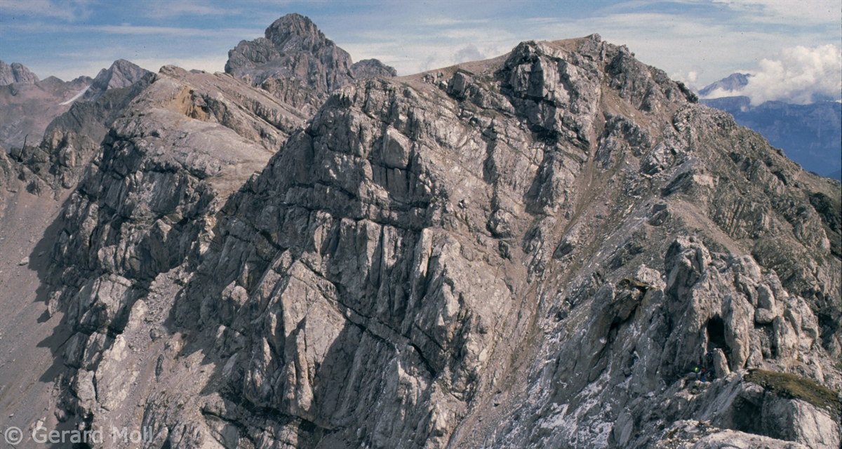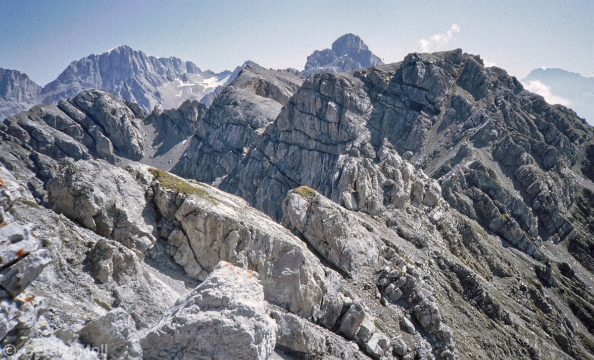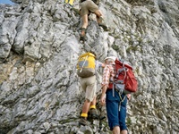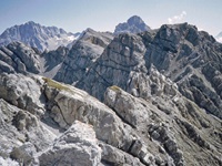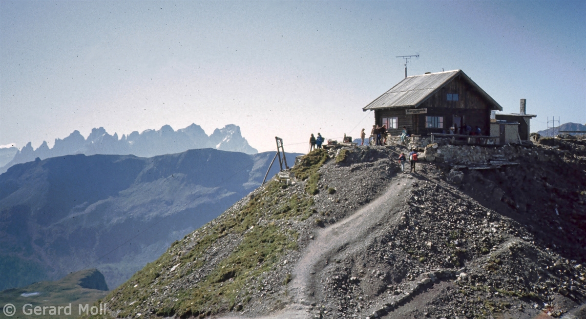 Vom Pellegrinopass (1907 m) steigen wir durch Wiesen zum Rifugio Passo delle Selle (2528 m). Hier beginnt die gesicherte Alta Via Beppi Zac, die uns auf gesicherten, alten Kriegsteigen über den Costabellakamm führt. Bei unserer Begehung gab es noch den Klettersteig zur Cima dell Uomo (3010 m), der aber später wegen zu grosser Steinschlaggefahr abgebaut wurde.