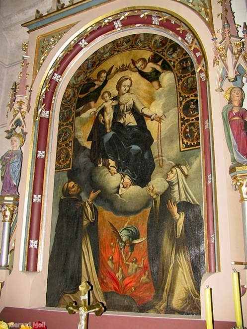 Bild in Lightbox öffnen (open image in lightbox). Die neugotische Pfarrkirche zu den hll. Jakob und Katharina Kirche erhielt ihre heutige Gestalt Ende des 19. Jahrhunderts. Einge Teile verweisen noch auf ihren Ursprung im 14. Jahrhundert. Sehenswert ist der Seitenaltar mit Mariendarstellung und Rosenkranz-Medaillons.