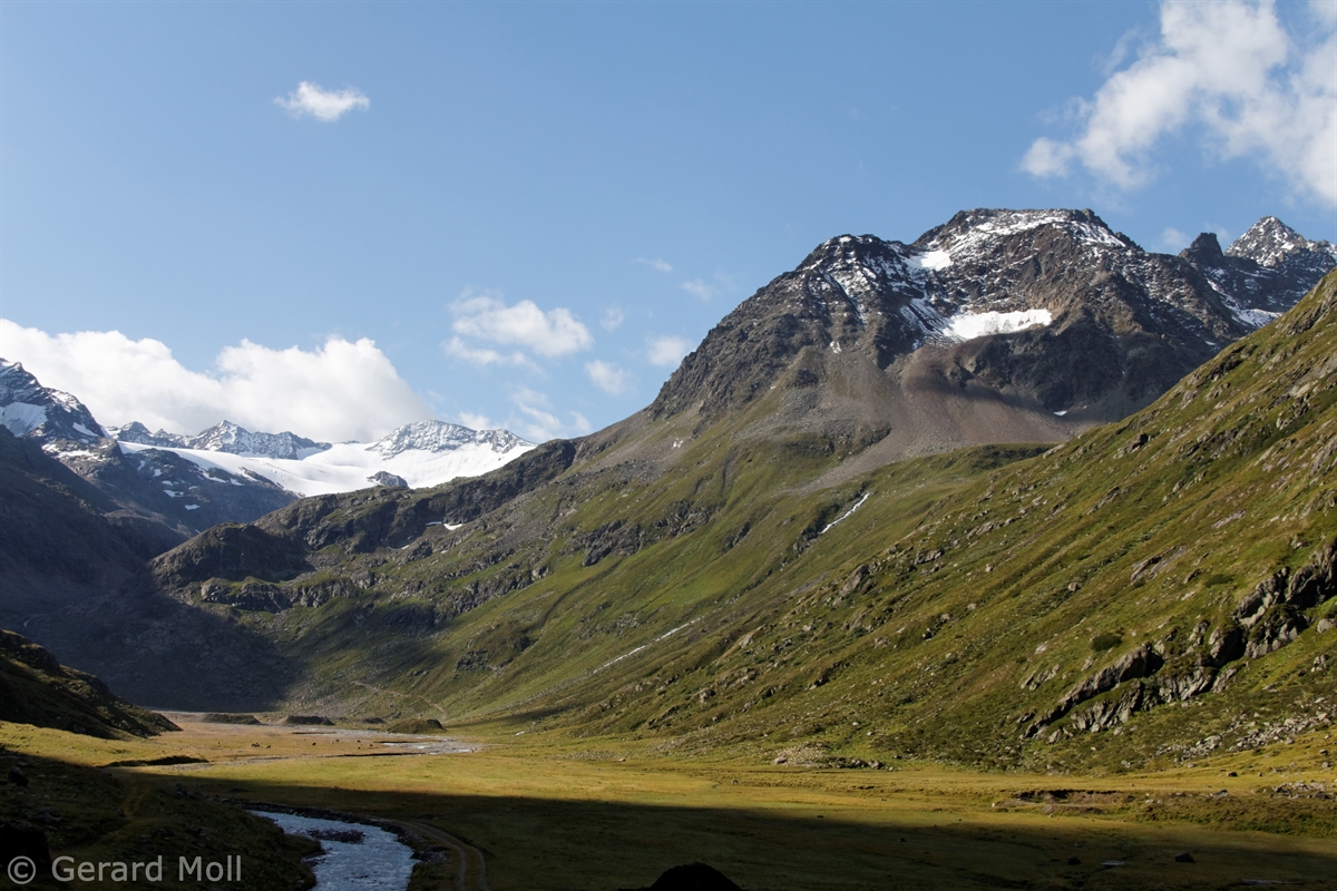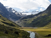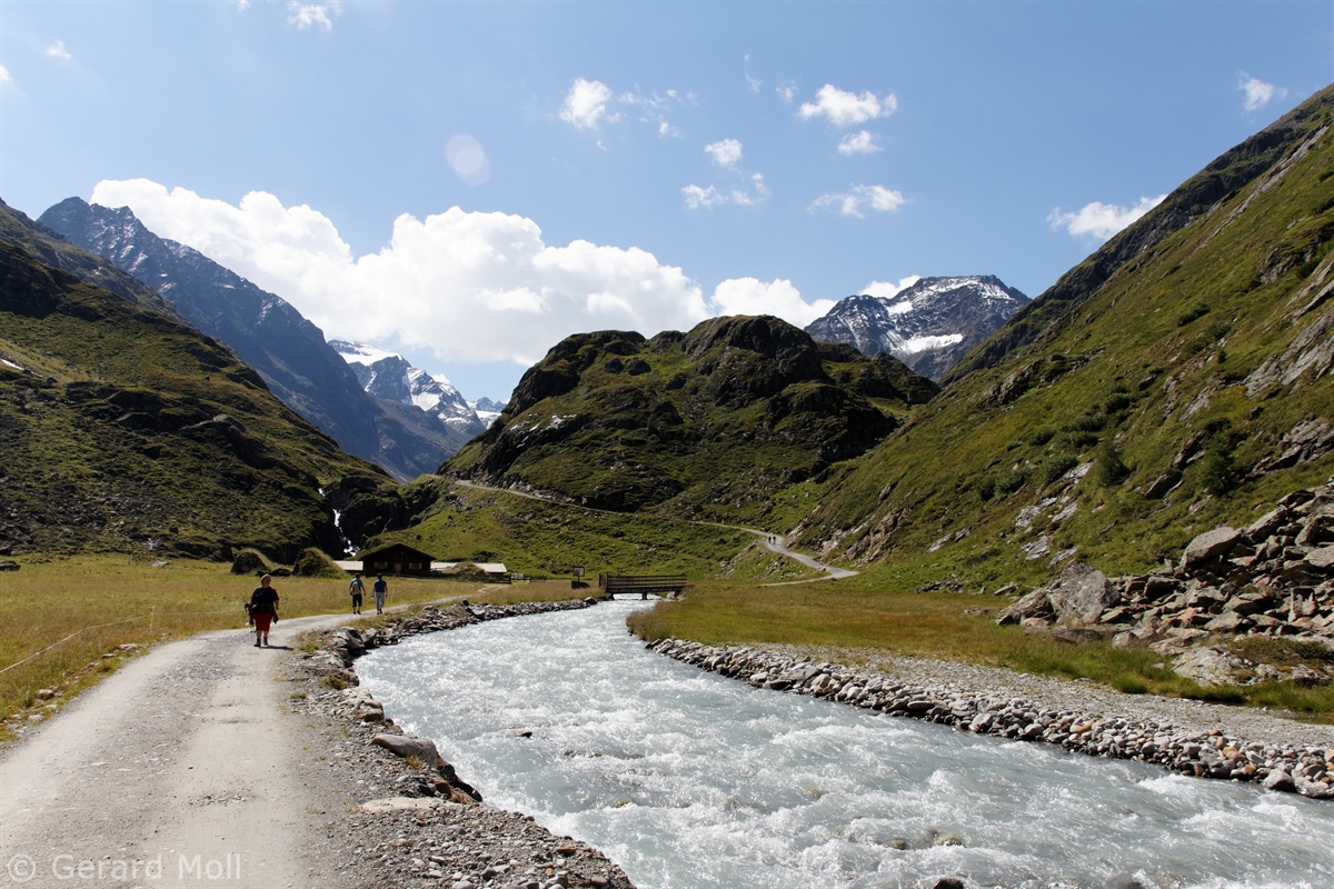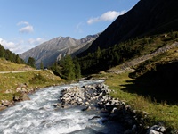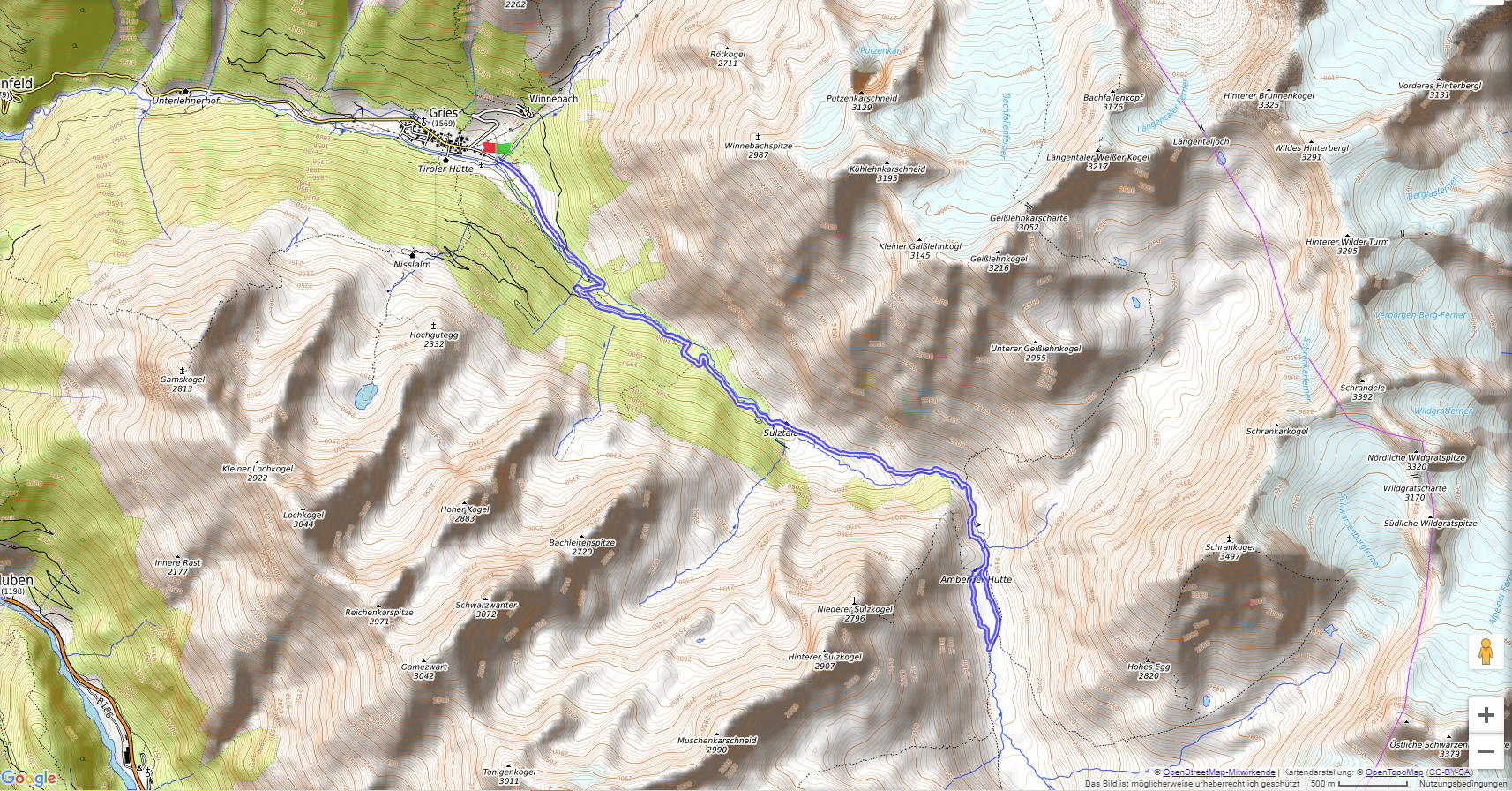 Von Längenfeld im Ötztal gelangt man nach Gries (1569 m). Vorbei an der Sulztalalm wandern wir auf einem Fahrweg hinauf zur Amberger Hütte am Fuß des mächtigen Schrankogel (3497 m, zweithöchster Gipfel der Stubaier Alpen).