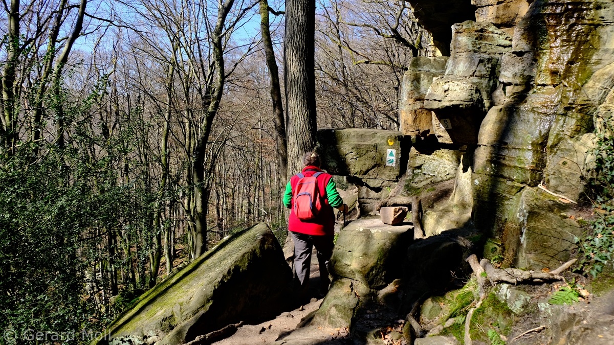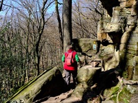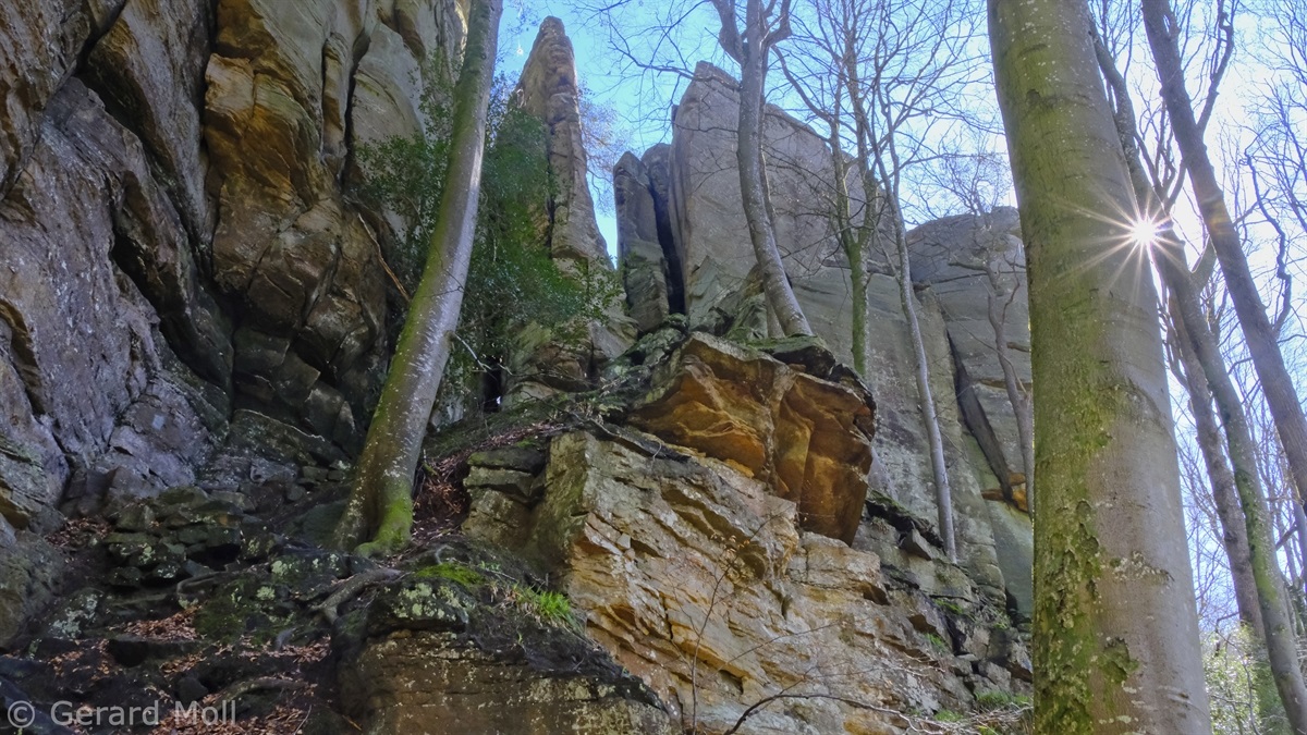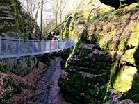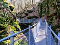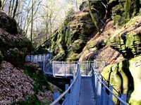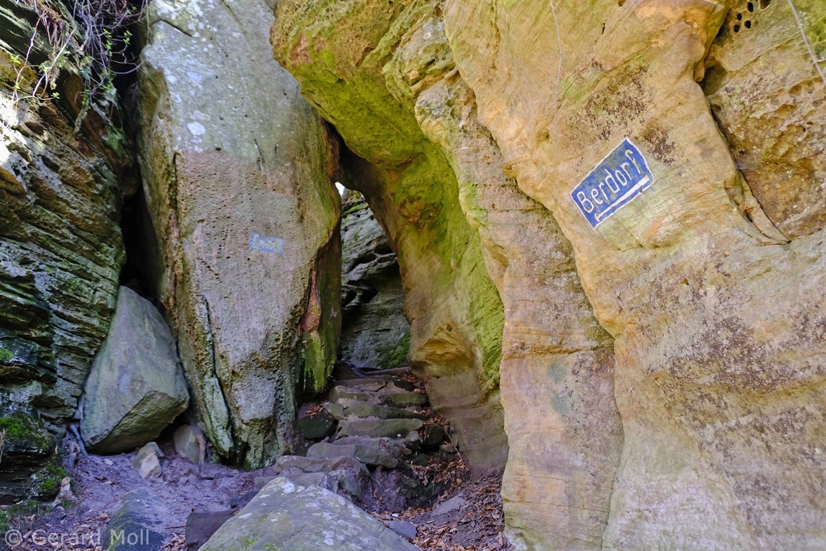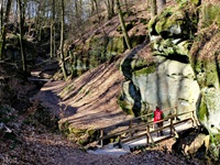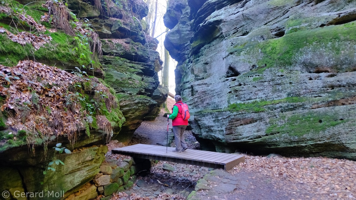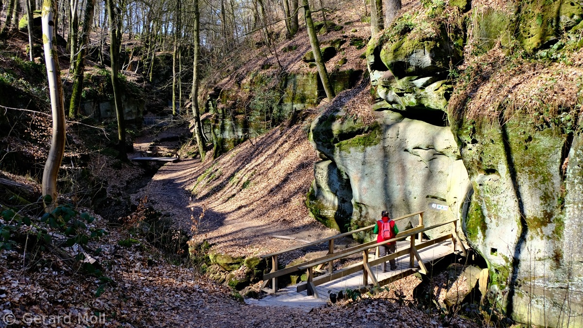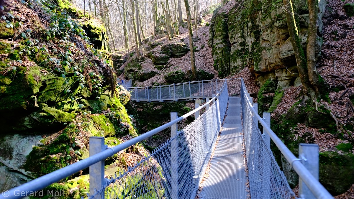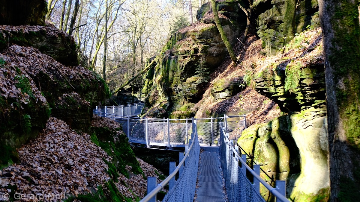 Wir sind im Zentrum Berdorfs gestartet. Der beste Ausgangspunkt ist jedoch der grosse Parkplatz am Freizeitzentrum Martbusch. Der Weg führt über spektakuläre Hängebrücken in das Tal des Roitsbaches und hinunter an den Fuß der beeindruckenden Felswände. Immer wieder locken uns Abstecher zum Roitsbachplateau, zur Teufelsinsel oder zur Räuberhöhle. In den Felswänden der "Wanterbaach" sind fast immer Kletterer zu beobachten. An den "Siwweschlëff" vorbei erreichen wir den Aussichtspunkt "Kasselt". Von hier aus gelangen wir bequem zum Ausgangspunkt zurück.