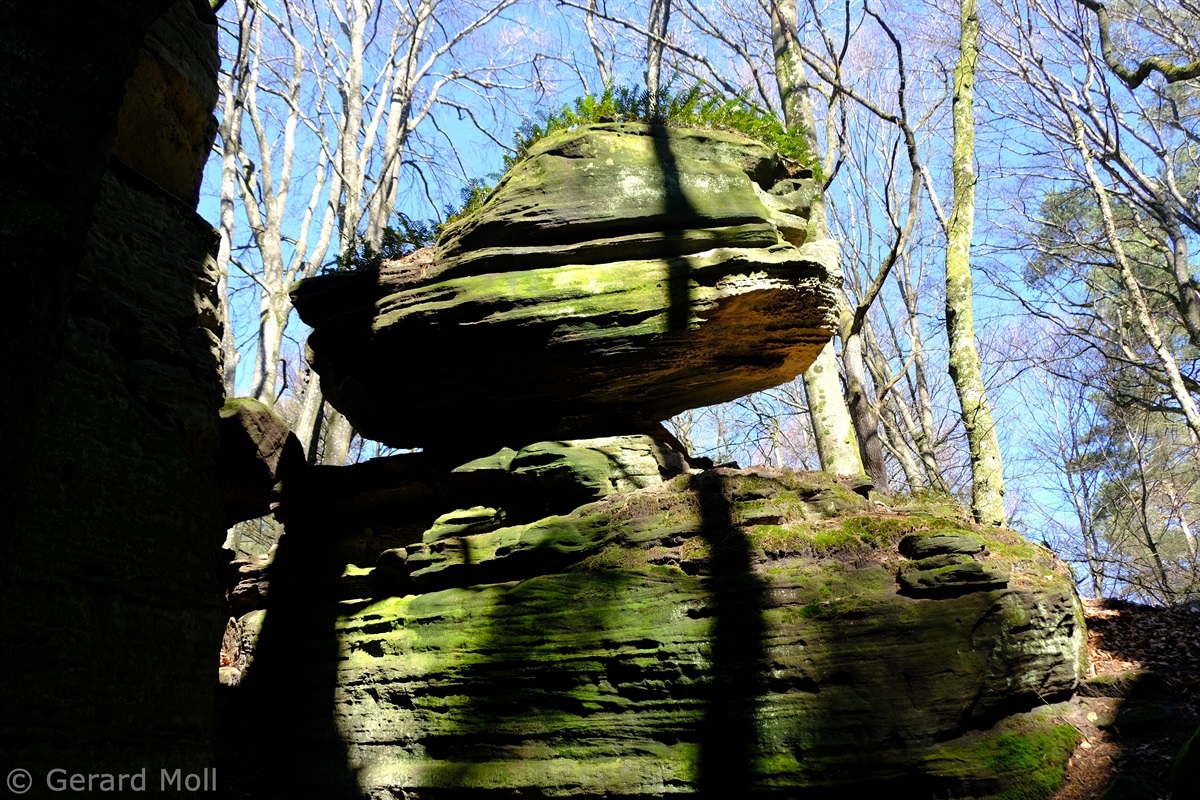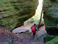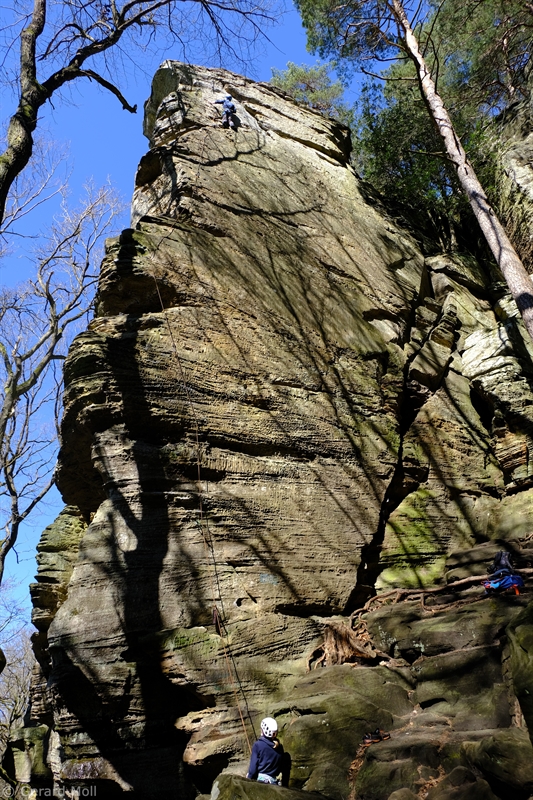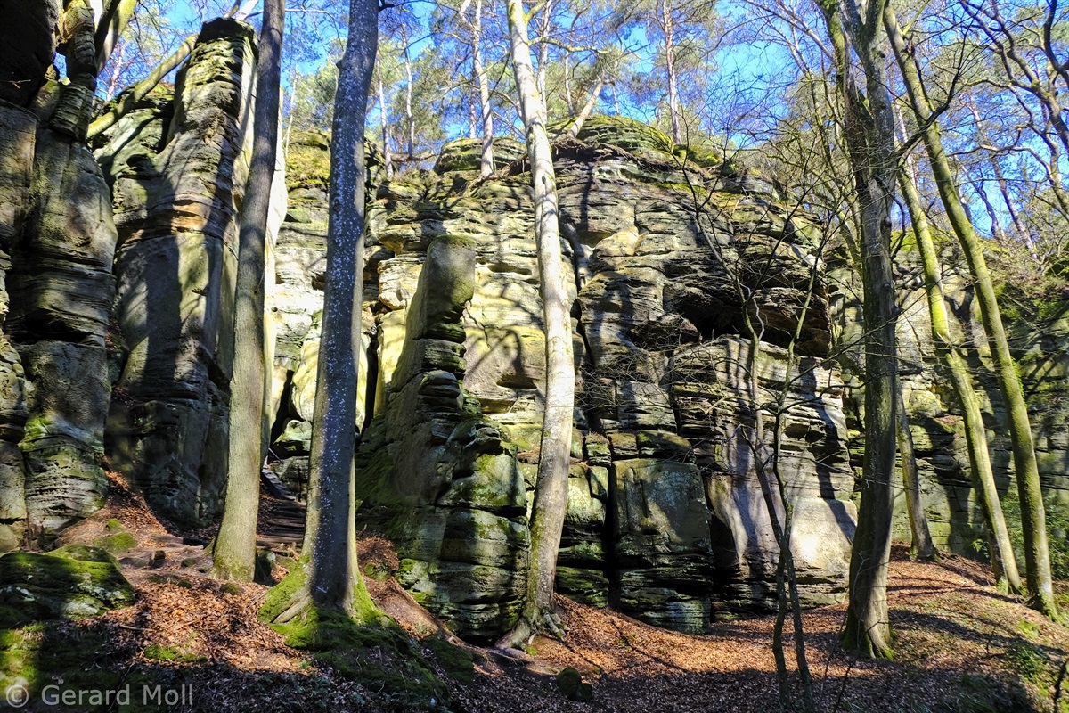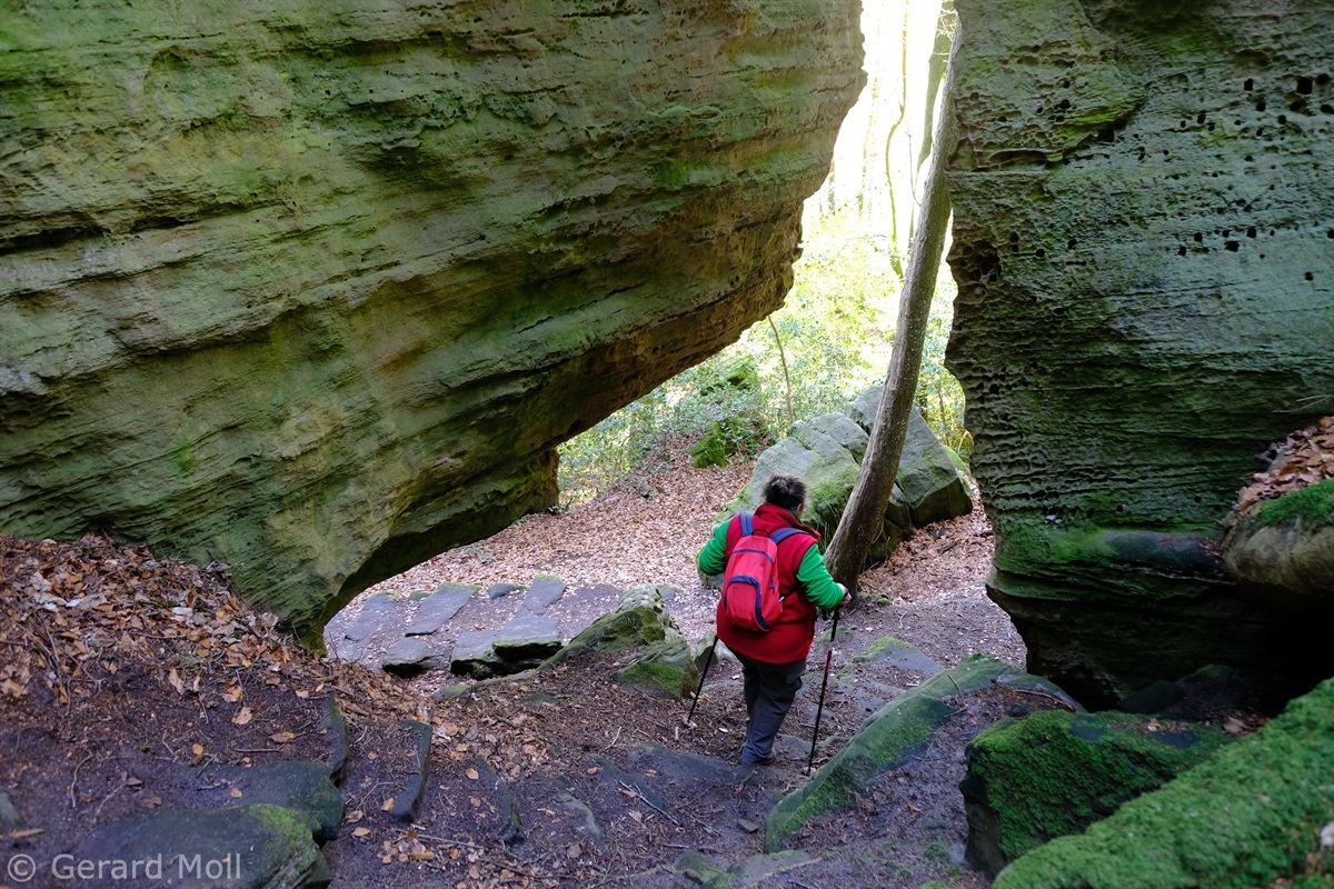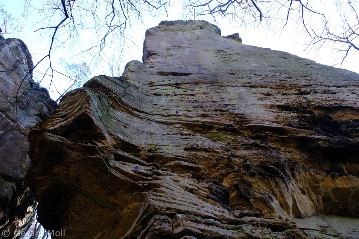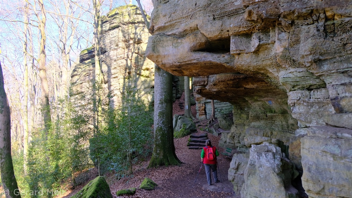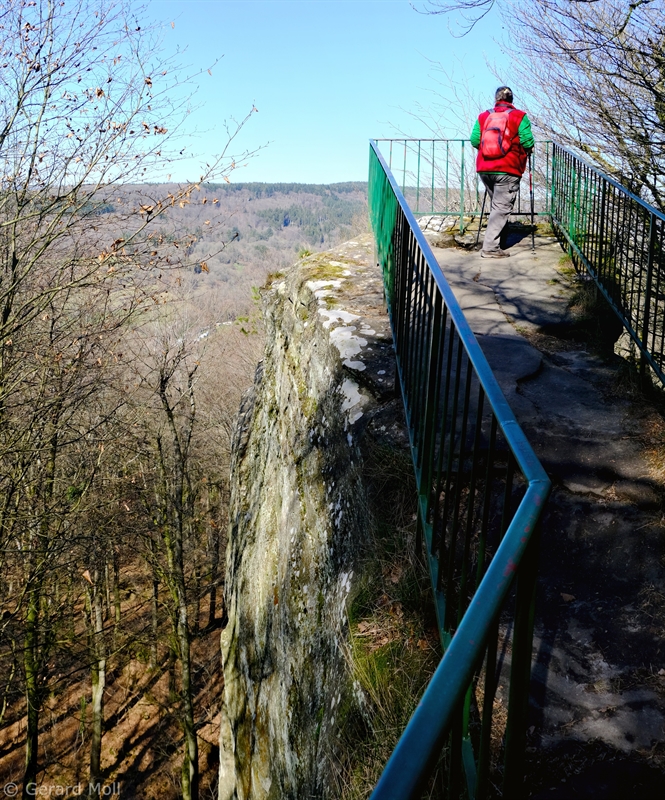 Wir sind im Zentrum Berdorfs gestartet. Der beste Ausgangspunkt ist jedoch der grosse Parkplatz am Freizeitzentrum Martbusch. Der Weg führt über spektakuläre Hängebrücken in das Tal des Roitsbaches und hinunter an den Fuß der beeindruckenden Felswände. Immer wieder locken uns Abstecher zum Roitsbachplateau, zur Teufelsinsel oder zur Räuberhöhle. In den Felswänden der "Wanterbaach" sind fast immer Kletterer zu beobachten. An den "Siwweschlëff" vorbei erreichen wir den Aussichtspunkt "Kasselt". Von hier aus gelangen wir bequem zum Ausgangspunkt zurück.