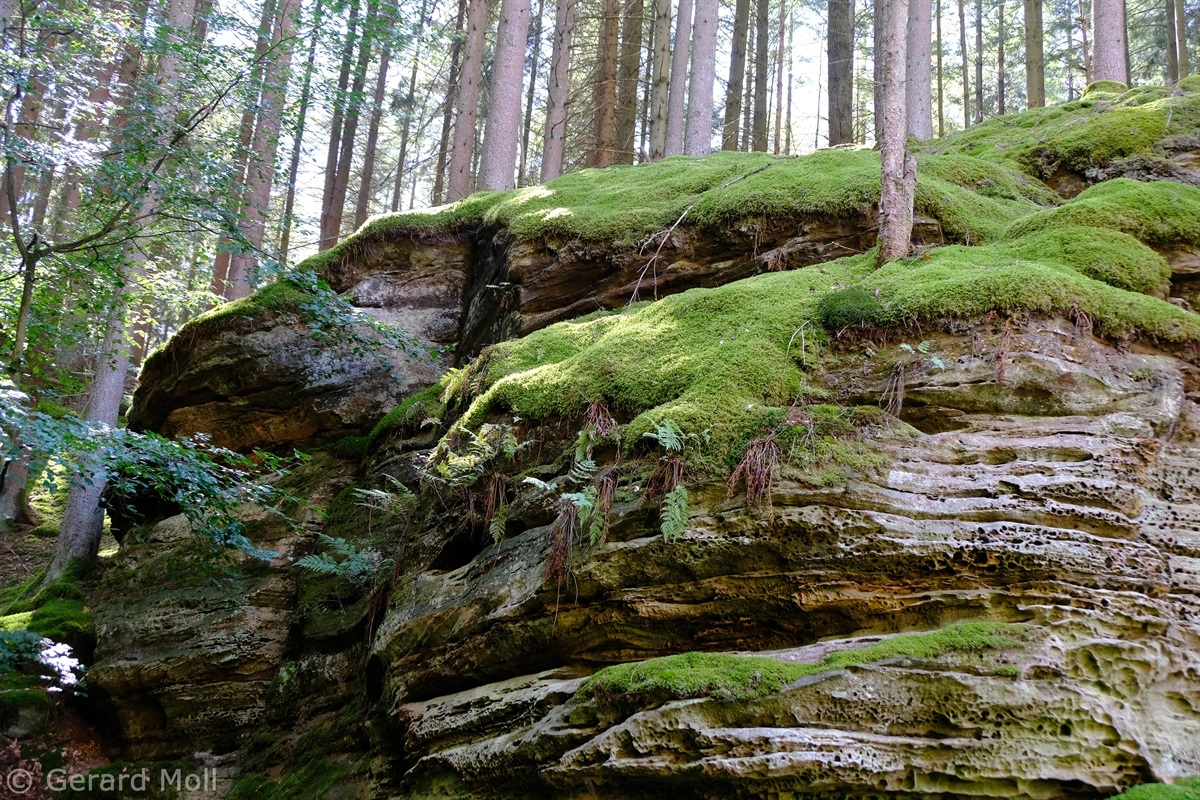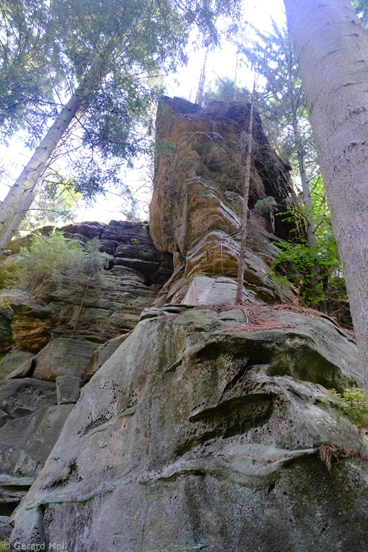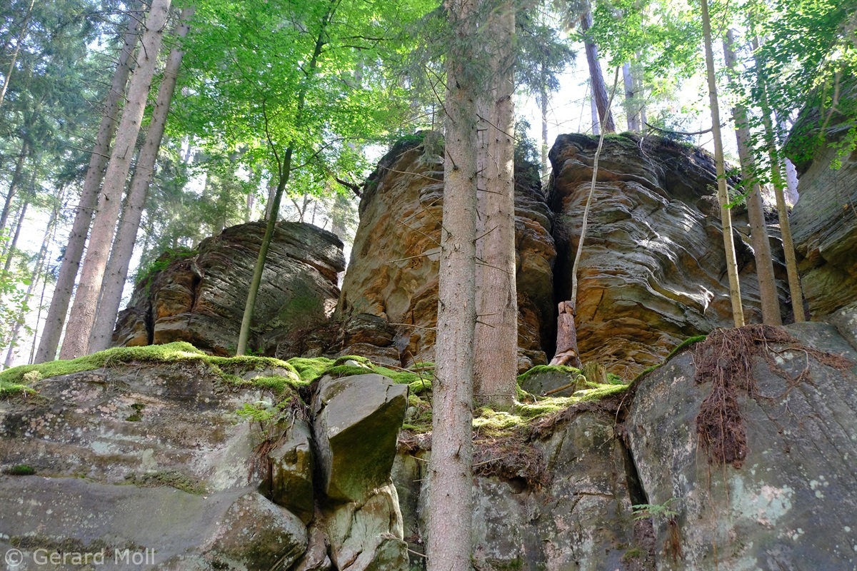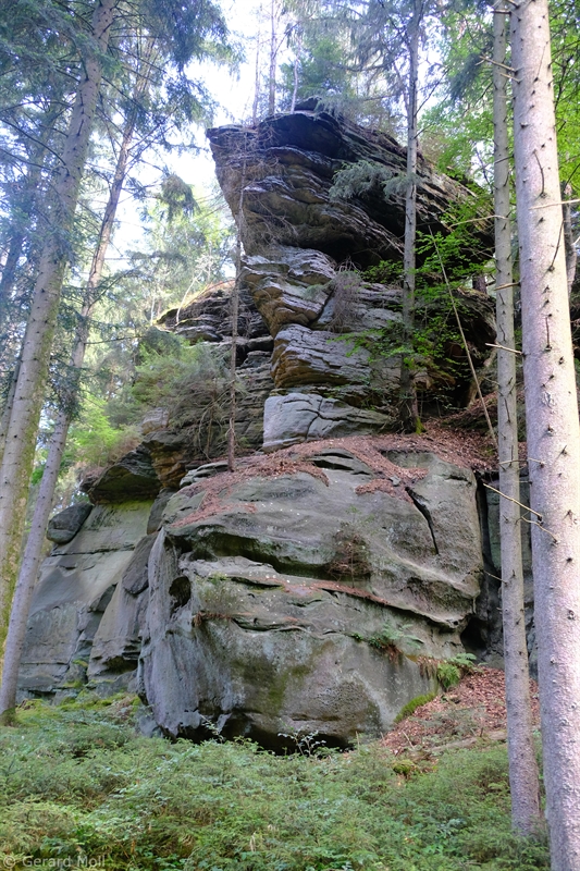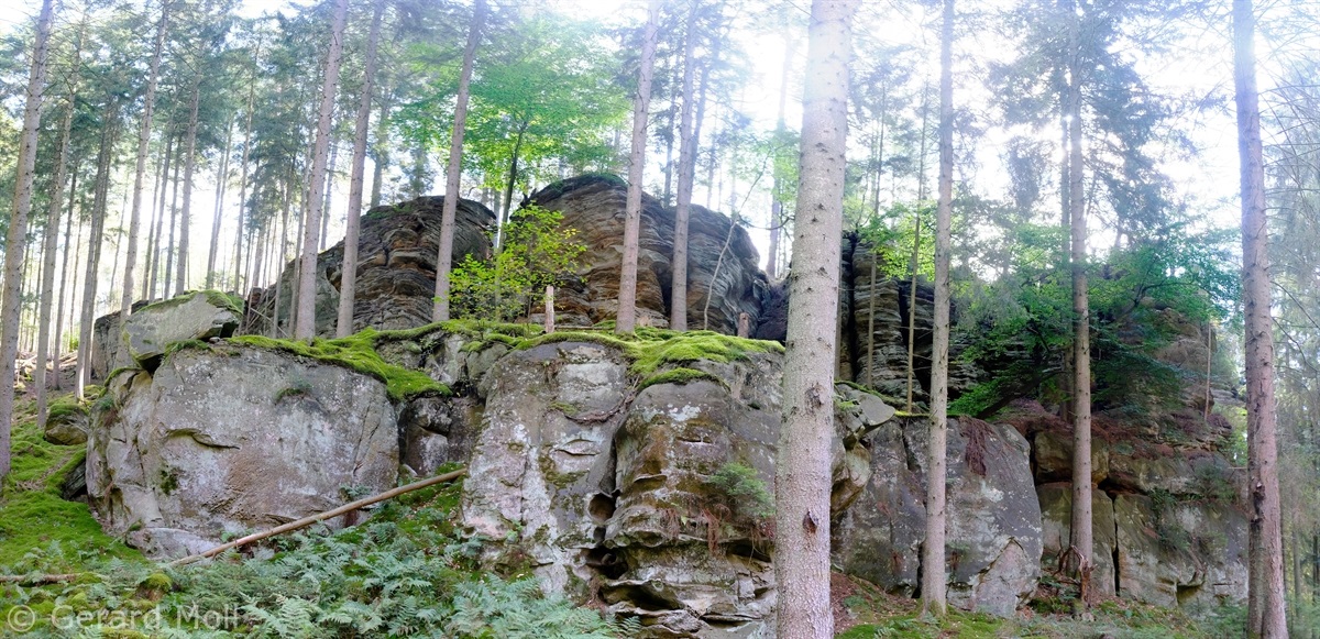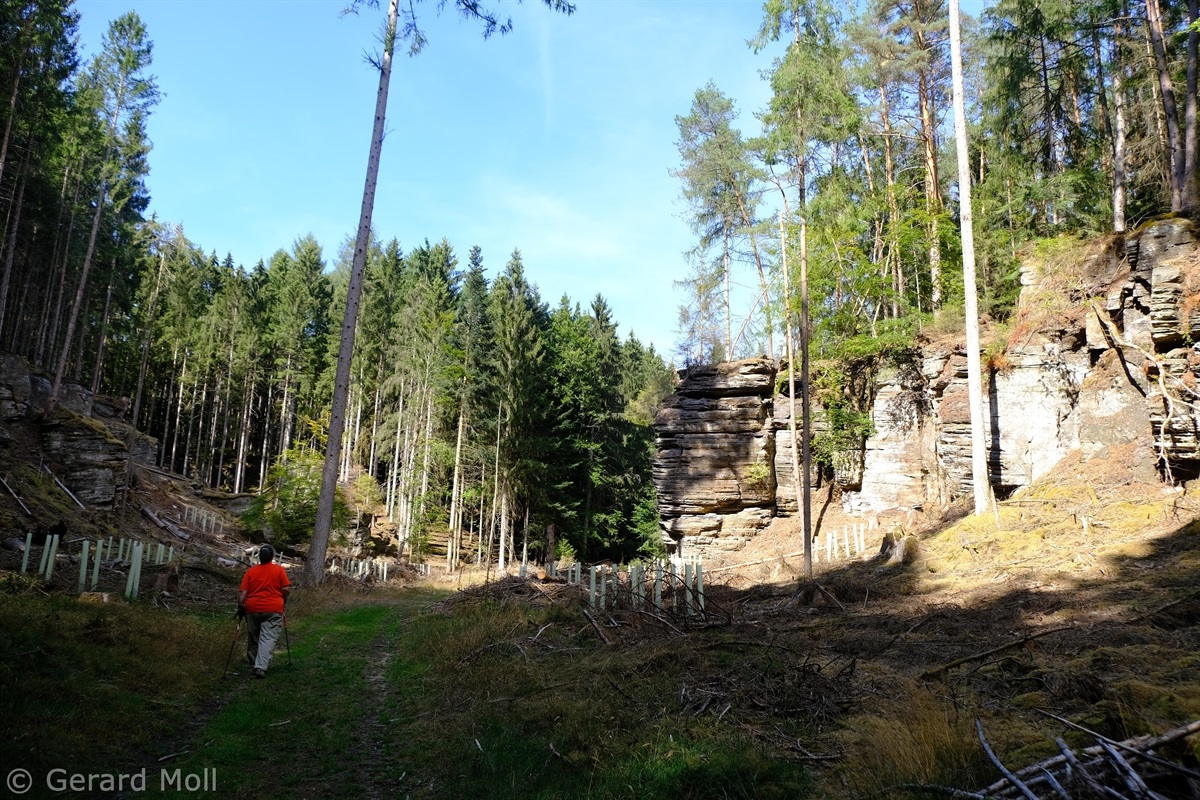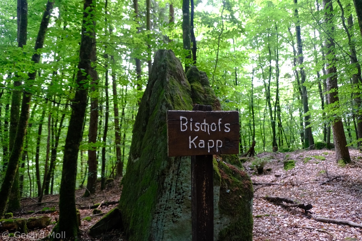 Von Biesdorf gelangen wir über Felder in den Wald unterhalb des Bellkopfes. Wir wandern zu einem Teich und kommen wenig später zur Bischofskapp, einem Felsen in Form einer Bischofs-Mitra. Der Weg führt nun an zahlreichen beeindruckenden Felsen vorbei. Über Felder erreichen wir, vorbei an einer schön gelegenen Quelle, unseren Ausgangspunkt. Der Weg ist nicht mit einer durchgehenden Markierung versehen, folgt aber auf großen Strecken dem Naturpark-Südeifel-Weg Nr. 45. Es empfiehlt sich, die Runde mit Hilfe des GPS-Tracks zu begehen.