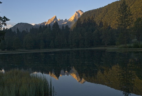 Bild in Lightbox öffnen (open image in lightbox). Bei Sonnenaufgang spiegelt sich der Watzmann im Böcklweiher.