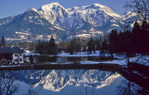 Bild in Lightbox öffnen (open image in lightbox). Auch Kehlstein, Hoher Göll und Hohes Brett spiegeln sich im Böcklweiher.
