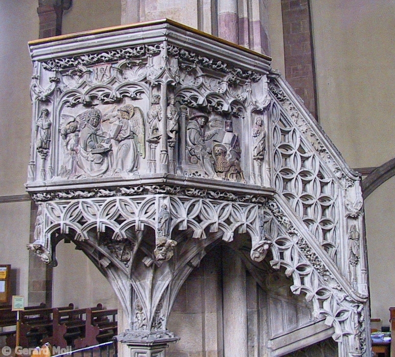 Bild in Lightbox öffnen (open image in lightbox). Die Stadtpfarrkirche enthält eine besonders schöne Kanzel aus Sandstein.