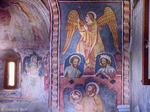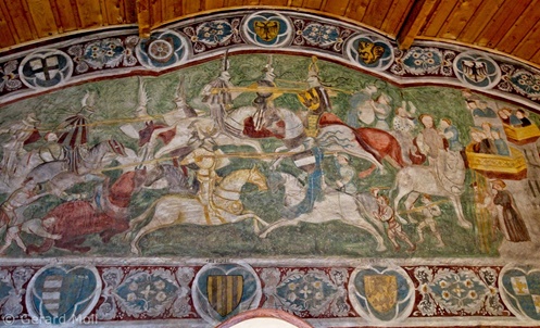 Bild in Lightbox öffnen (open image in lightbox). St. Johann im Dorfe erhielt die heutige Form um 1300. Das Innere der Kirche ist vollständig mit Fresken aus dem 14. Jahrhundert ausgemalt.