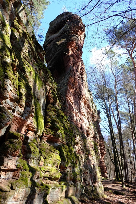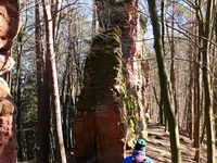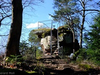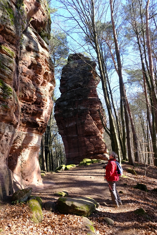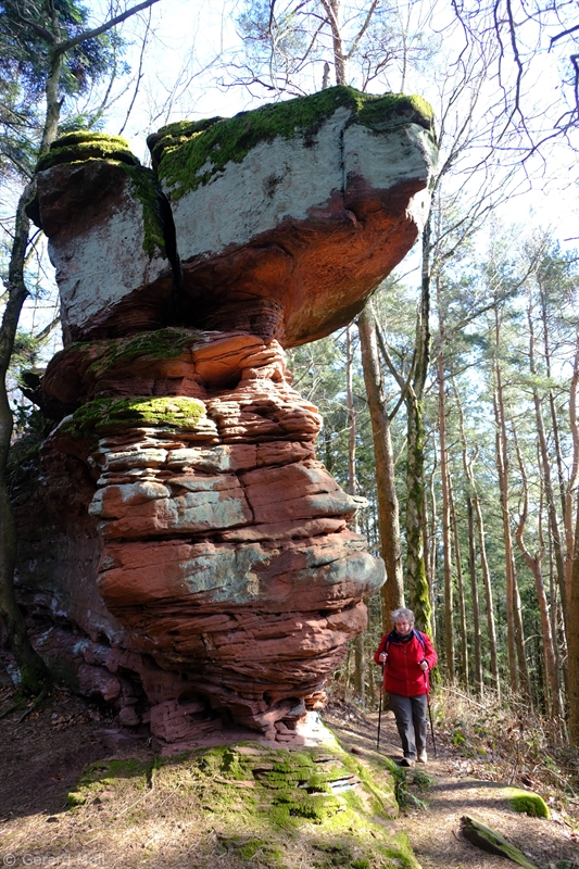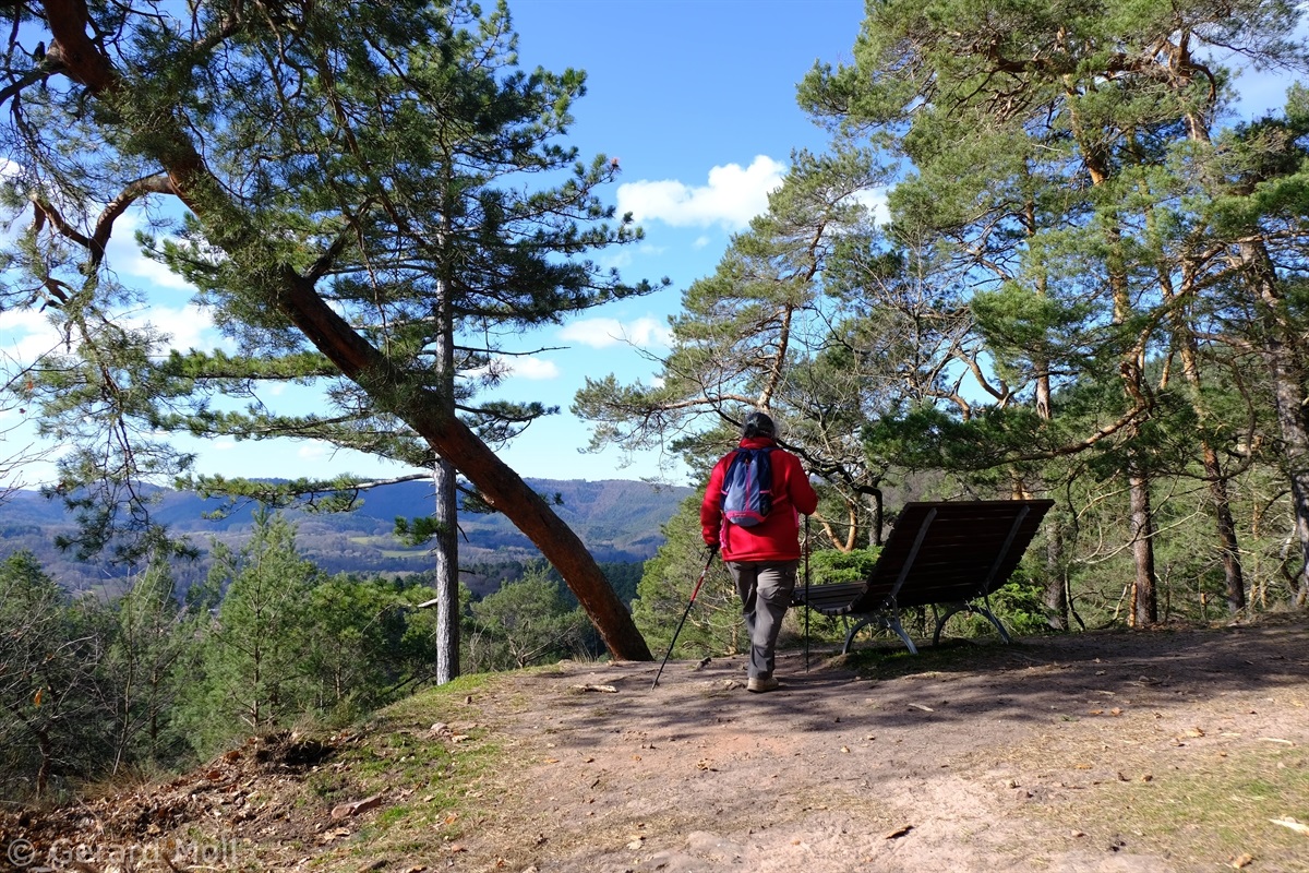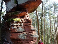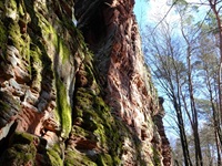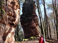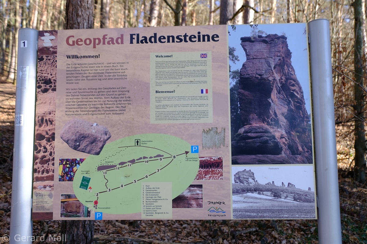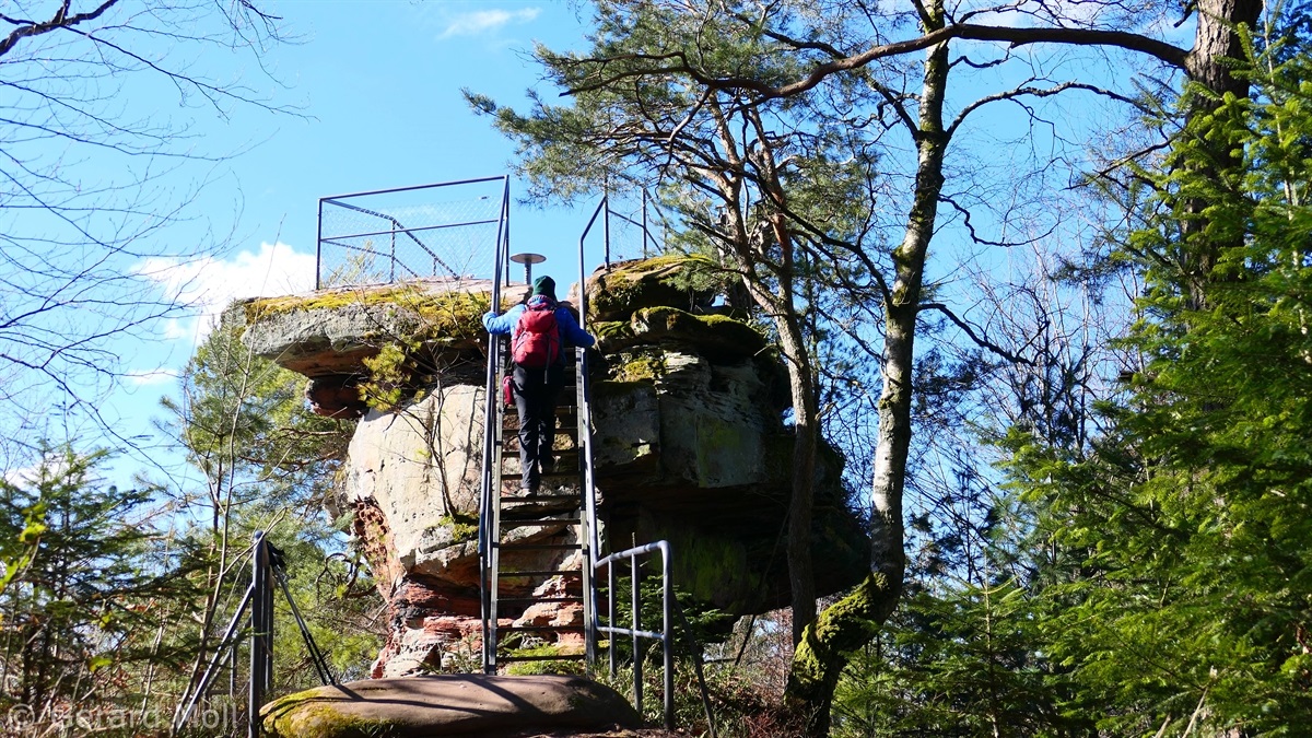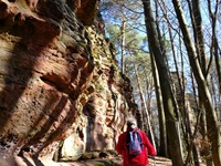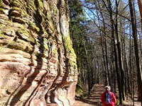 Wir starten am Parkplatz des Friedhofs in Bruchweiler-Bärenbach. Der Weg führt in südlicher Richtung bis an den Rand von Bundenthal, dann geht es hinauf zu den Fladensteinen. Fast 500 Meter wandern wir am Fusse der bis zu 52 Meter hohen Felsgruppe entlang. Der Weiterweg führt uns hinauf zur Aussichtskanzel auf dem Gipfel des 491 m hohen Jüngstberges. Beim Abstieg lohnt sich ein kleiner Abstecher zum Drachenfelsblick sowie zum Schuhfels mit Blick auf Bruchweiler-Bärenbach.