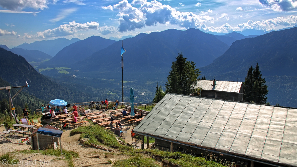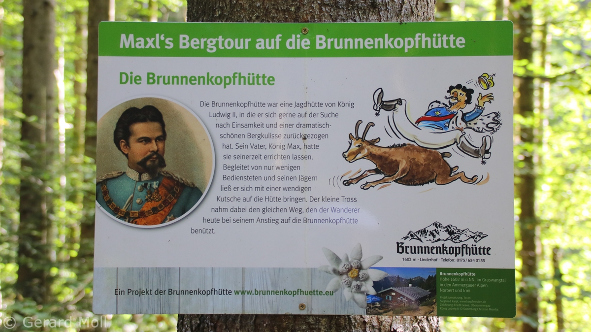 Vom Parkplatz bei Schloss Linderhof auf 940 m führt ein guter Weg zur Brunnenkopfhütte  (1604 m). Der Gipfel des Brunnenkopf (1718 m) ist schnell erreicht, die letzten Meter sind ausgesetzt und gesichert.