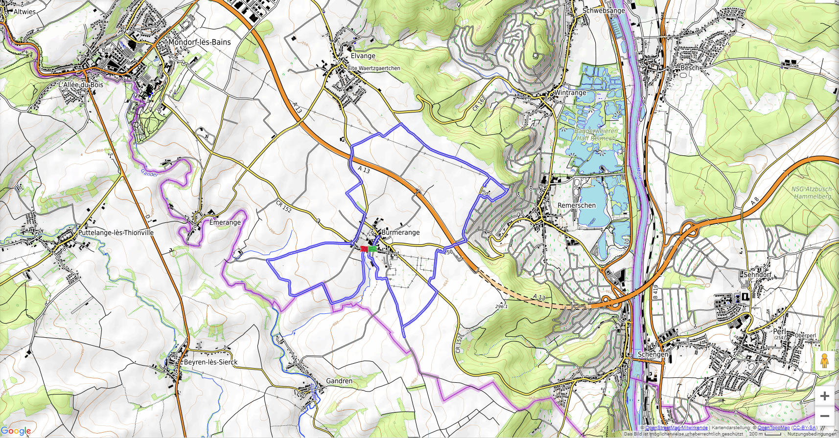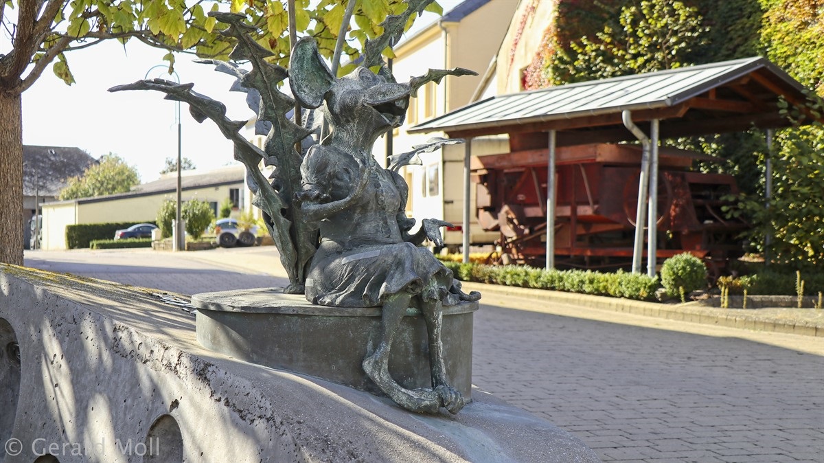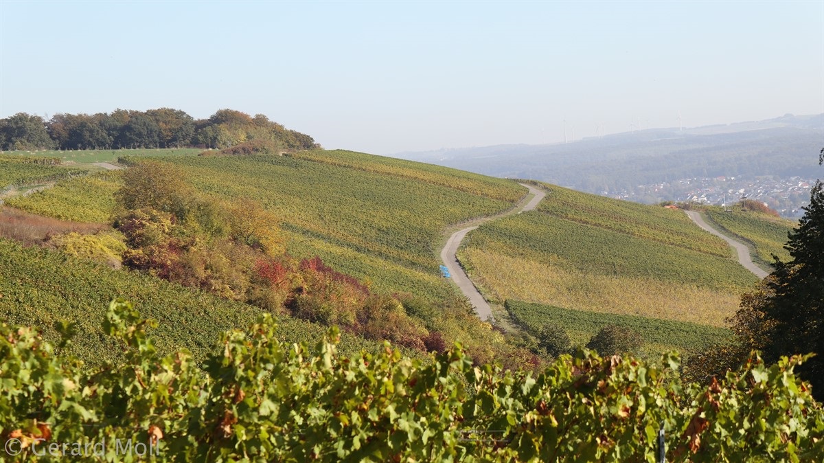Diese Runde um den Ort Burmerange war bei unserer Begehung praktisch nicht beschildert. Die Höhepunkte sind das Maus-Ketty-Denkmal im Ort sowie die Aussicht auf das Moseltal.