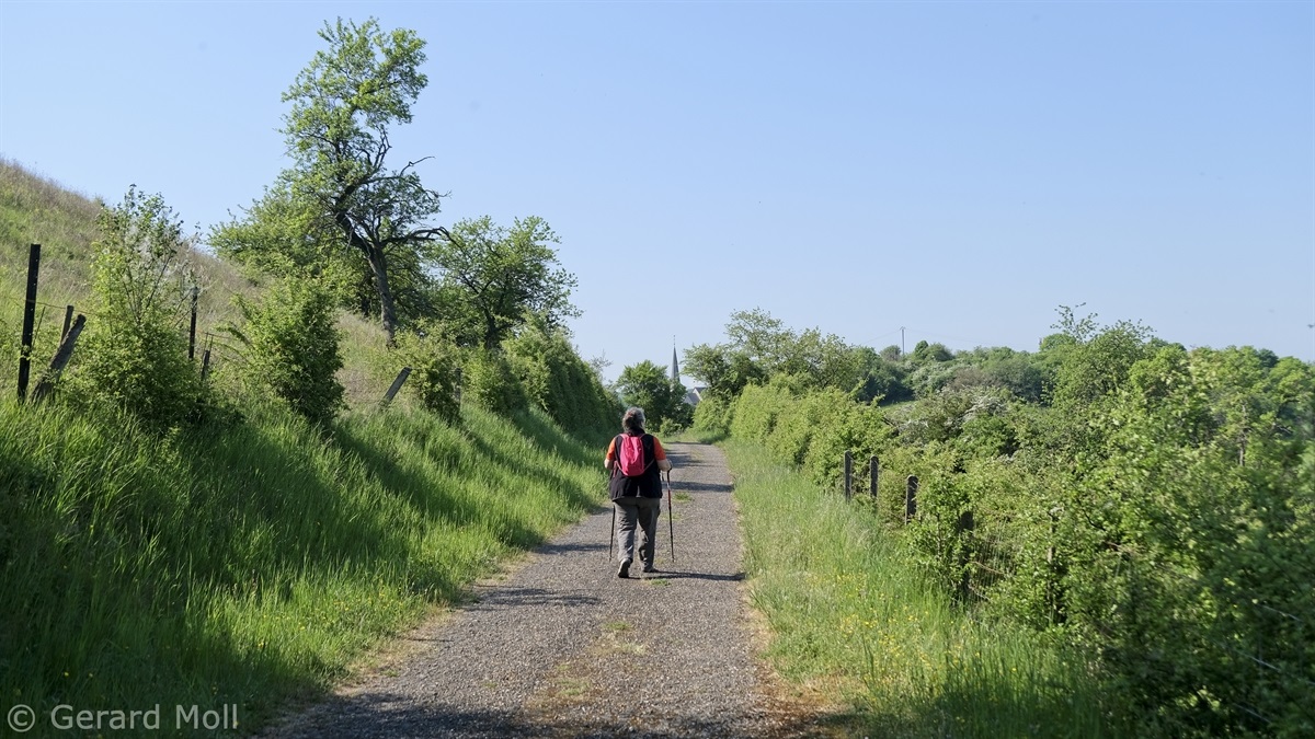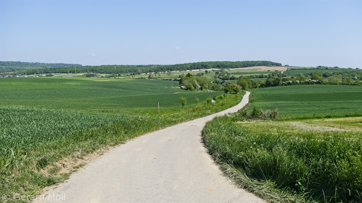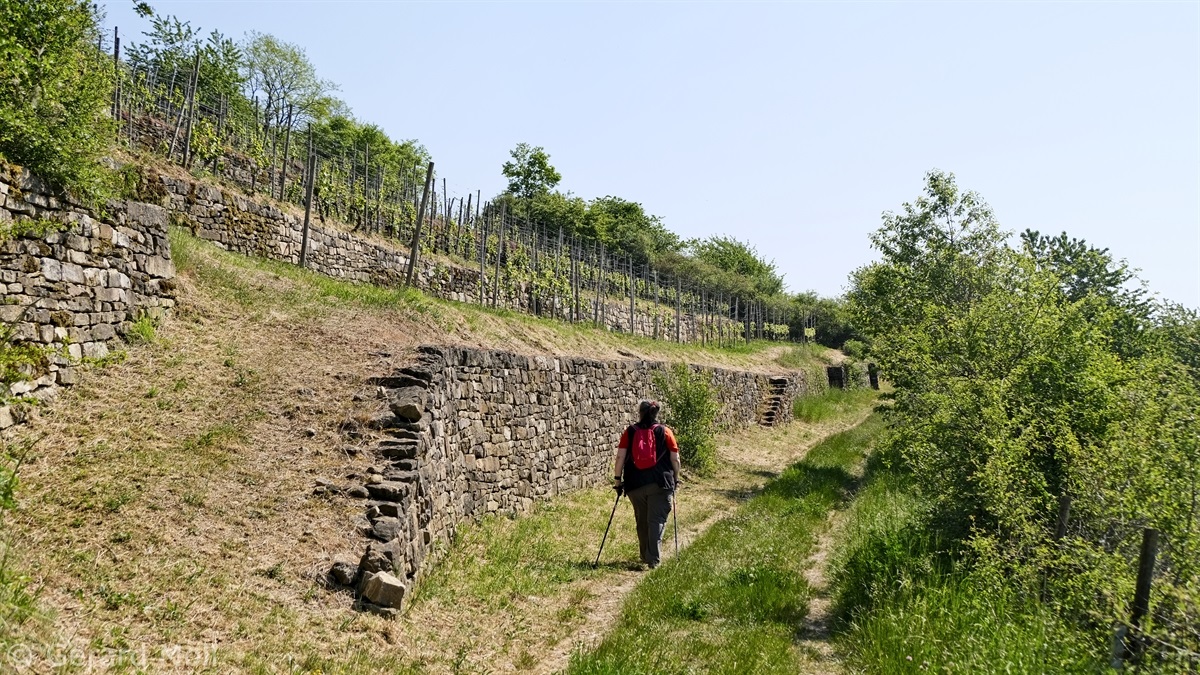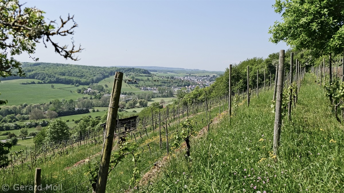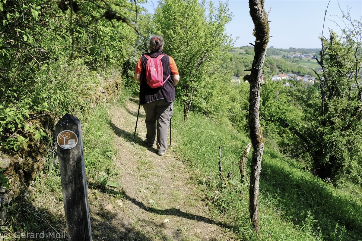 Wir starten bei einem kleinen Parkplatz an der Strasse zwischen Canach und Beyren und folgen dem aussichtsreichen Weg, der mit schönen Ausblicken auf Canach an restaurierten Trockenmauern vorbei führt. Nach einem kurzen, steilen Anstieg fädeln wir in den Trëppelpad Beemchesfëls ein, der nach Gostingen führt. Gut markiert bringt uns eine Schleife zurück zu unserer Abzweigung. Hier waren auf der Wéngertsbierg-Tour keine Markierungen zu finden. Durch alte Weinberge und über ein Feld kehren wir zum Ausgangspunkt zurück.