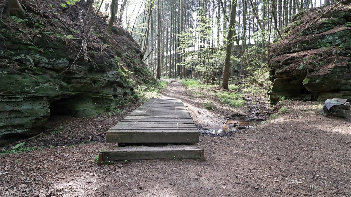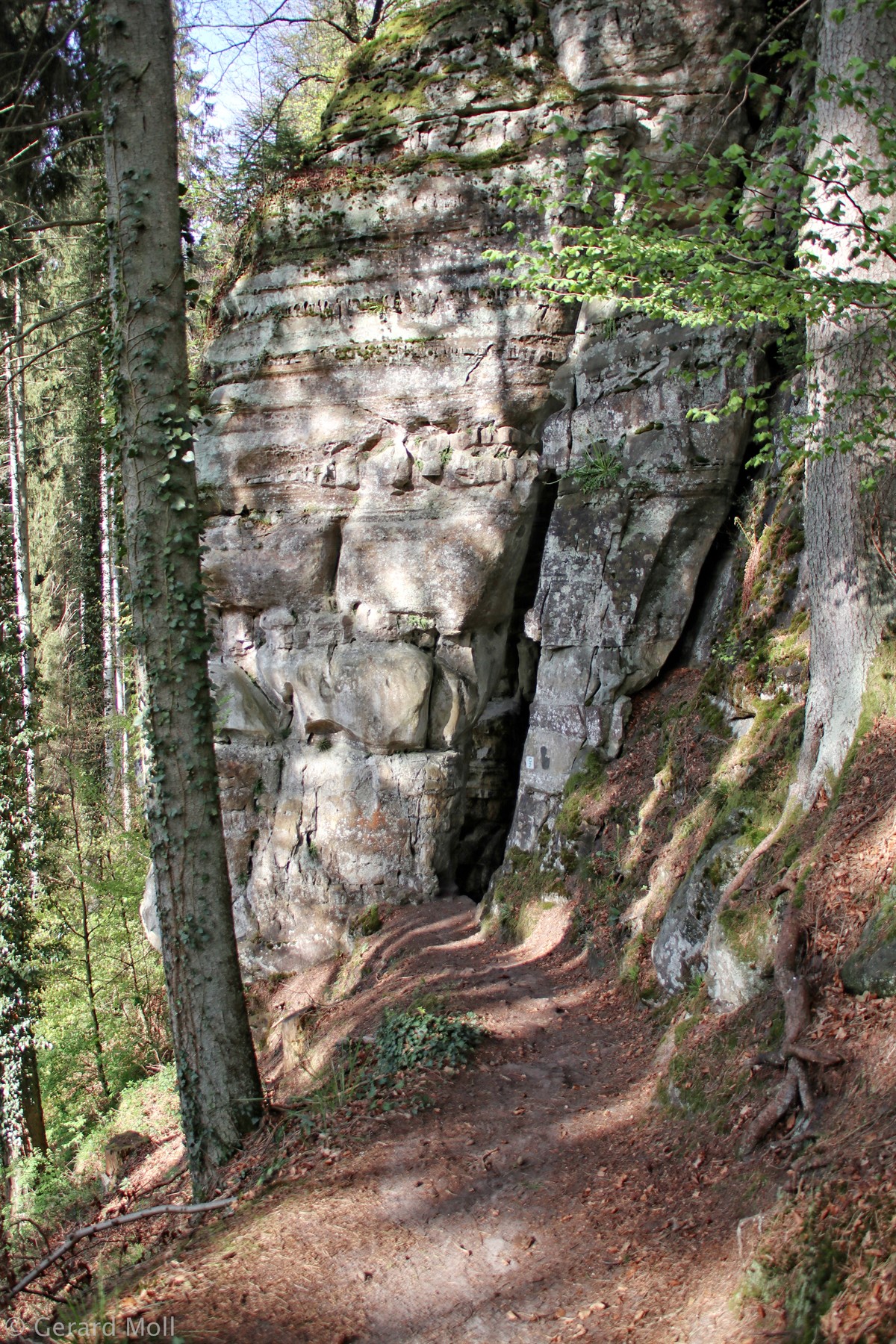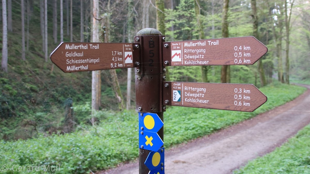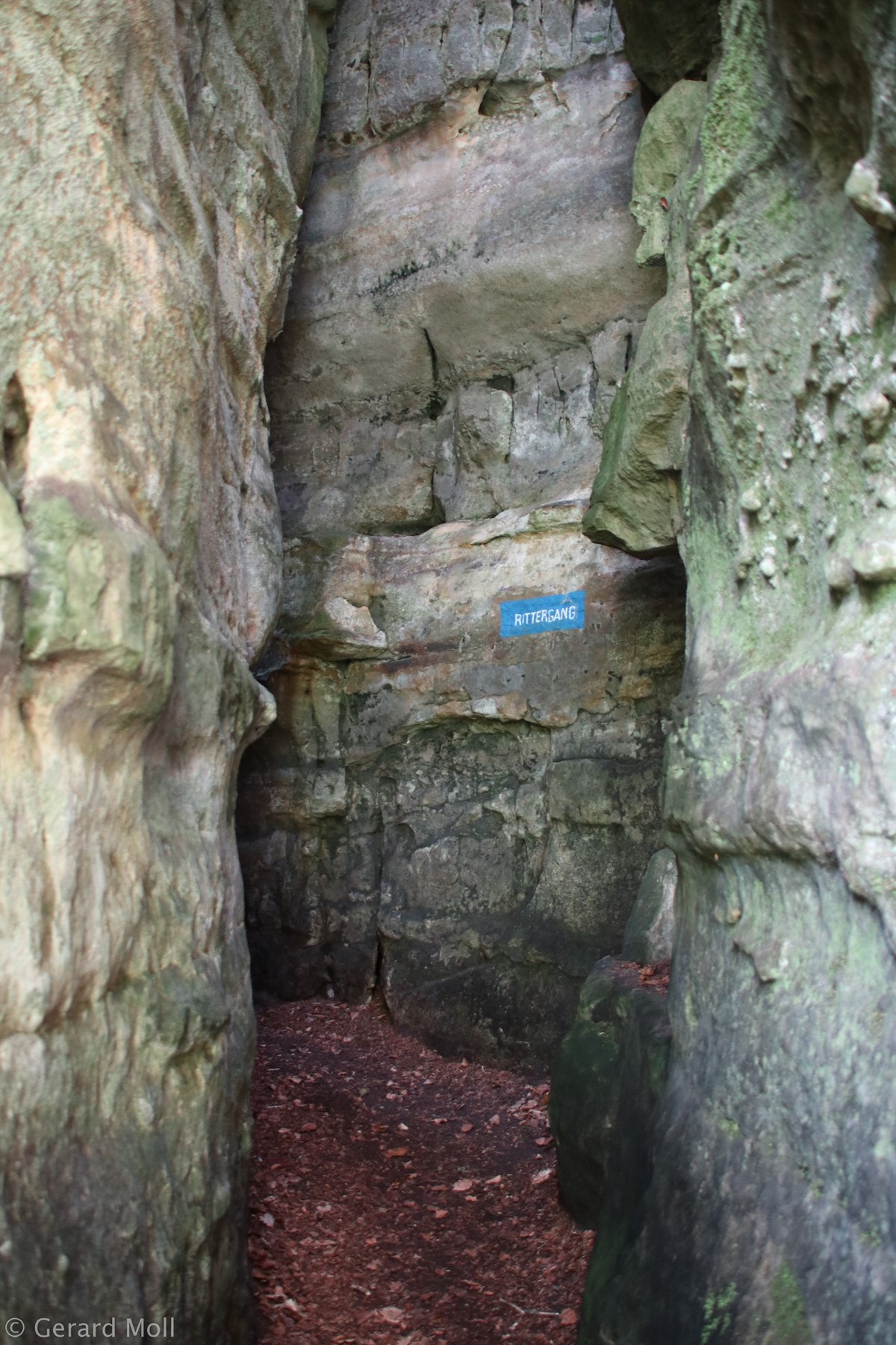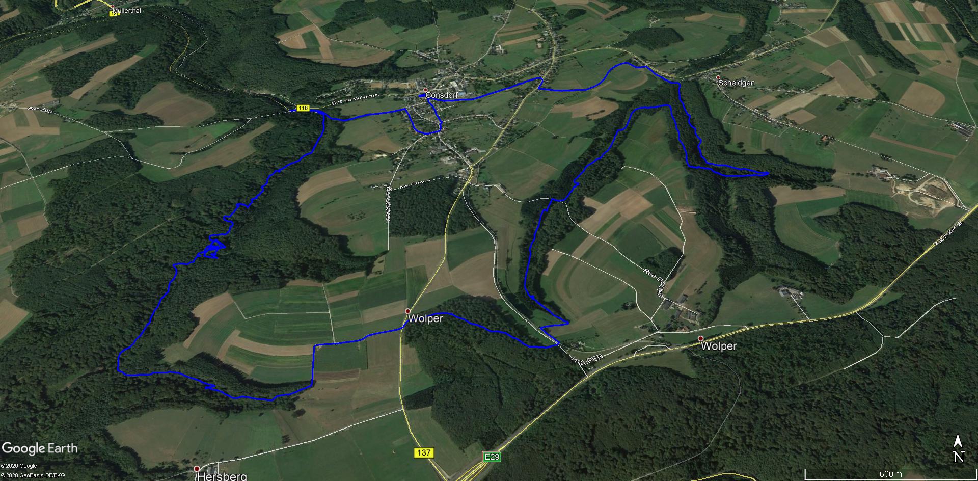 Vom Parkplatz an der Consdorfer Mühle führt zuerst ein breiter Weg in das Tal, den wir aber bald verlassen und auf einem abenteuerlichen Weg durch die engen Felsschlüffe des Rittergangs, des Déiwen Pëtz und der Kuelscheier. Dann geht es an einer steinzeitlichen Fundstätte vorbei hinauf auf offene Felder. Nach dem Überqueren der Strasse kommen wir an Felsformationen vorbei nach Scheidgen und zuück nach Consdorf und seiner Mühle.