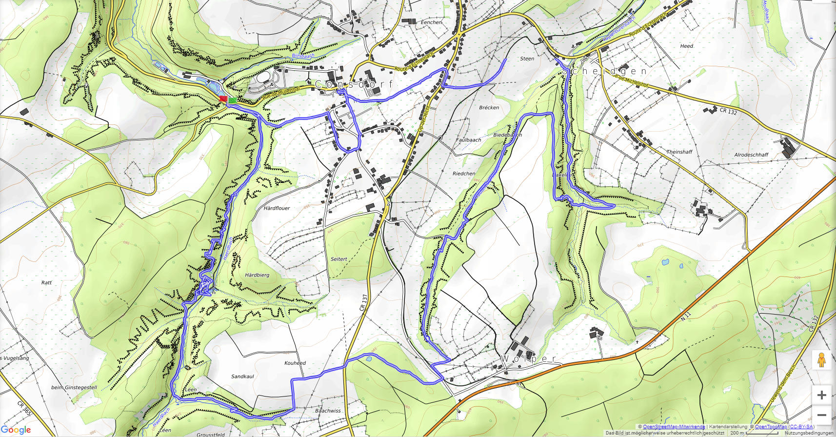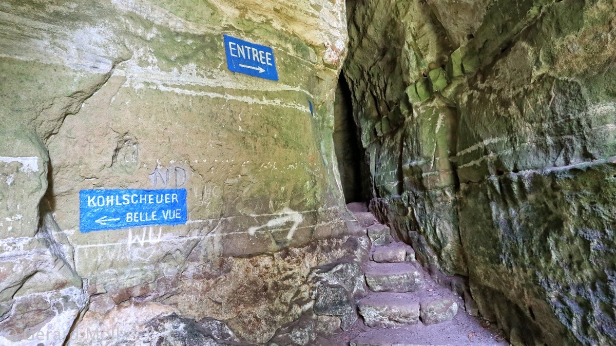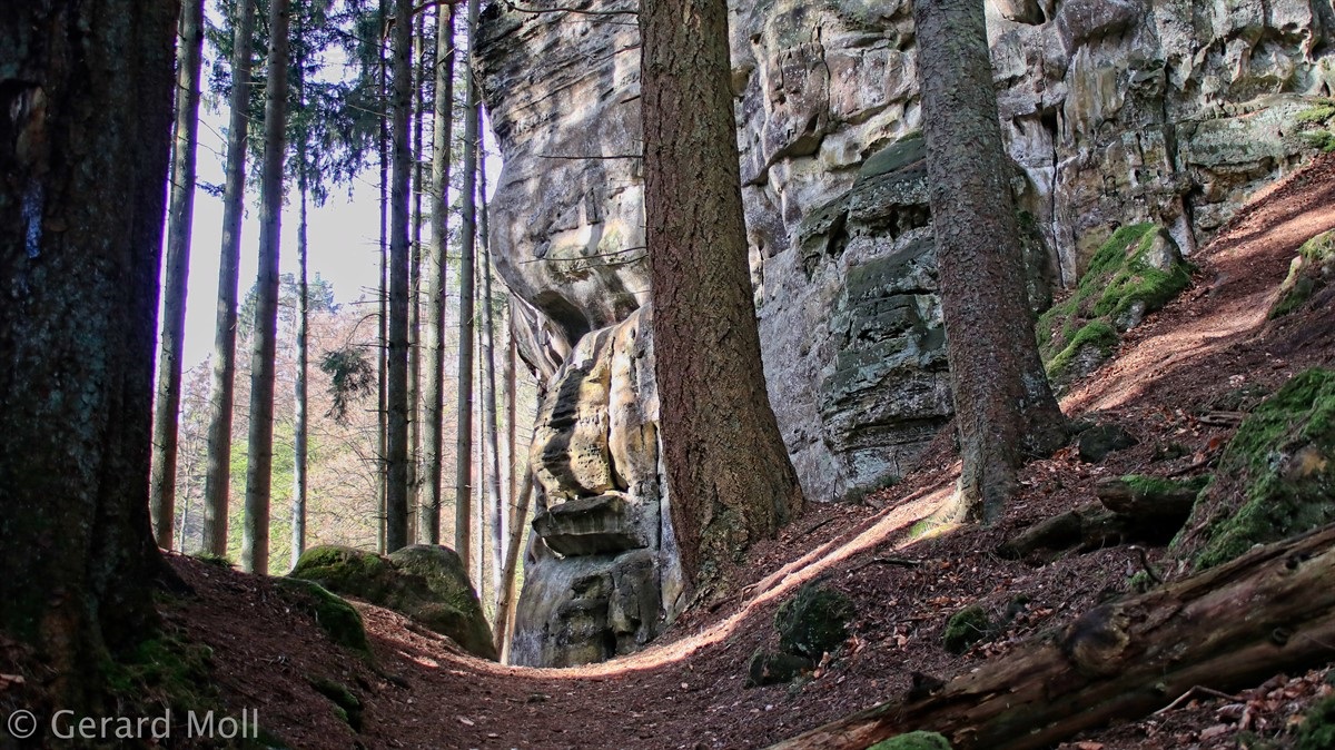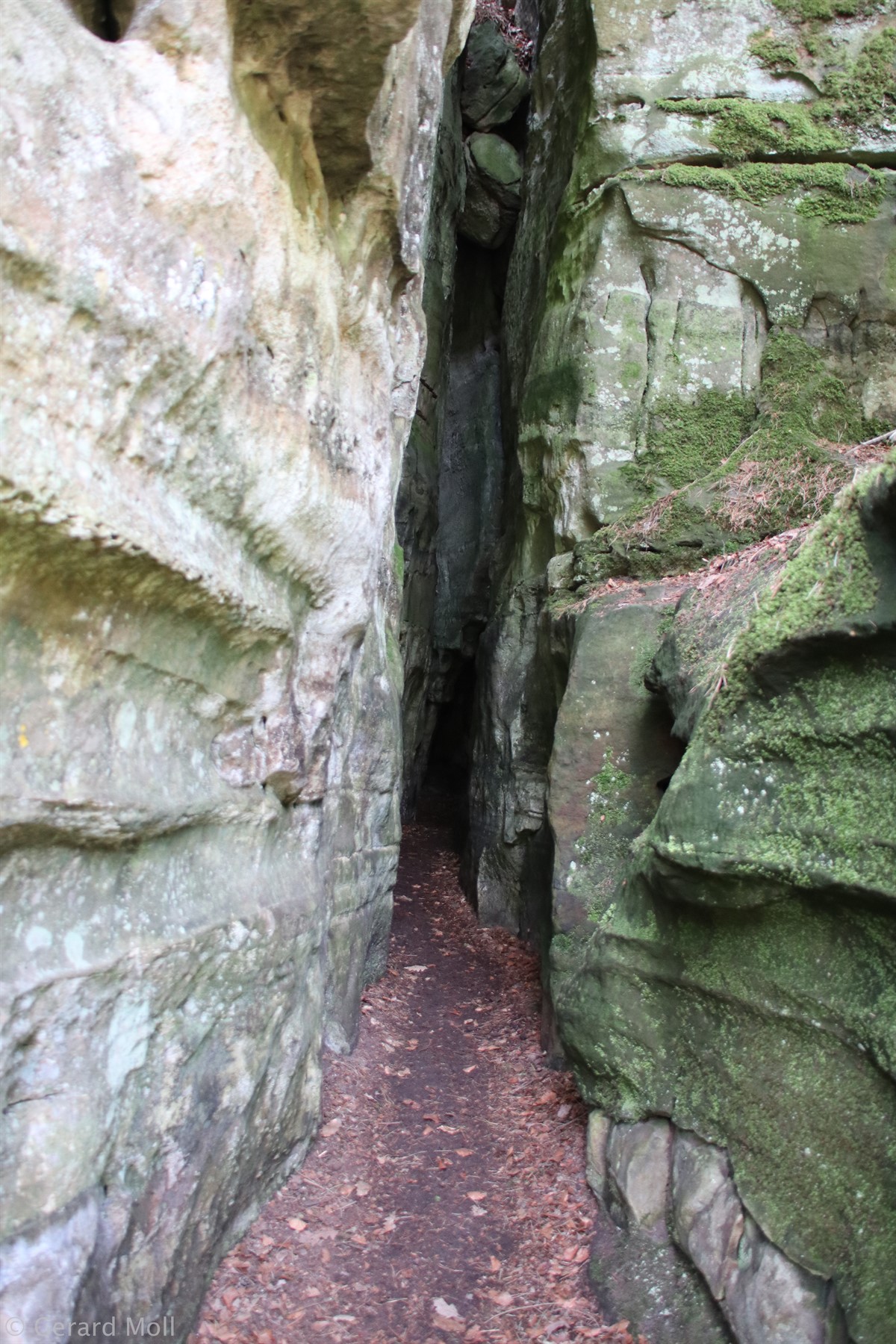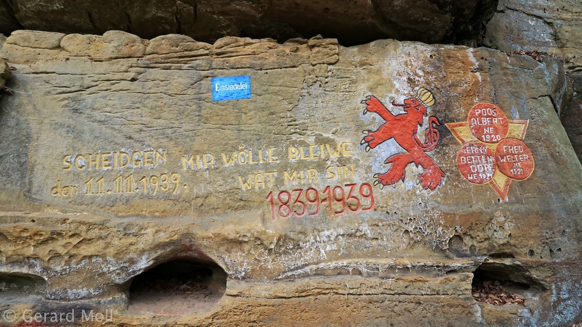 Vom Parkplatz an der Consdorfer Mühle führt zuerst ein breiter Weg in das Tal, den wir aber bald verlassen und auf einem abenteuerlichen Weg durch die engen Felsschlüffe des Rittergangs, des Déiwen Pëtz und der Kuelscheier. Dann geht es an einer steinzeitlichen Fundstätte vorbei hinauf auf offene Felder. Nach dem Überqueren der Strasse kommen wir an Felsformationen vorbei nach Scheidgen und zuück nach Consdorf und seiner Mühle.
