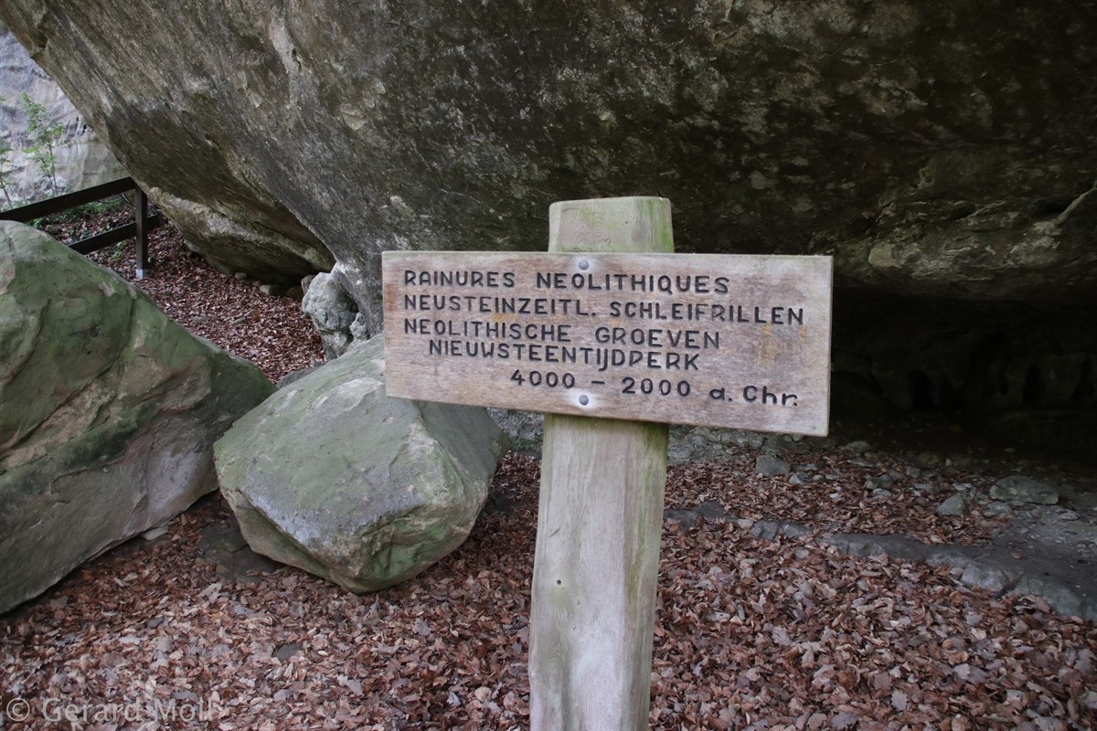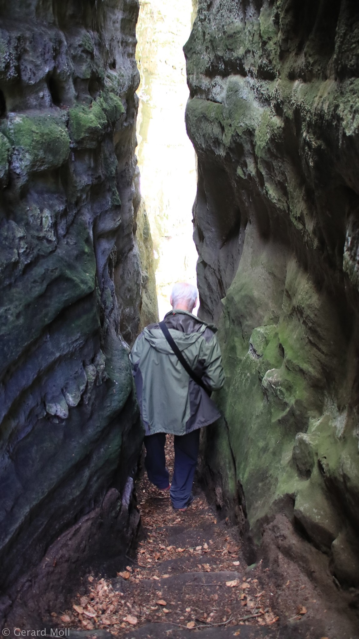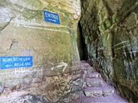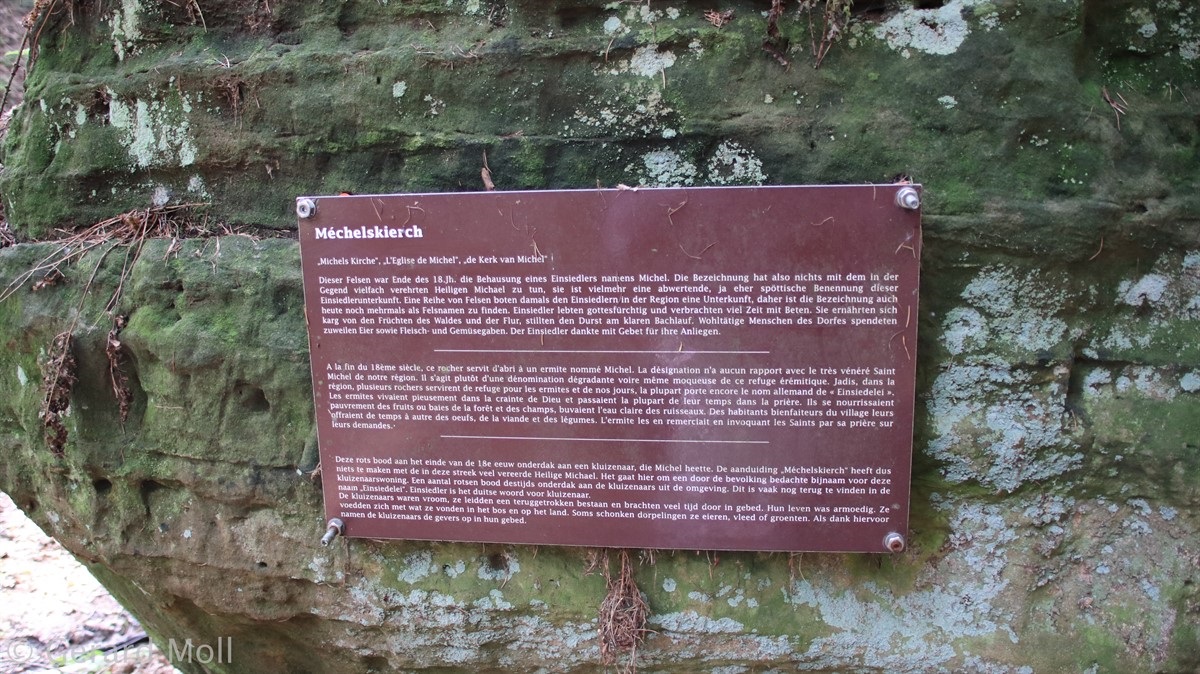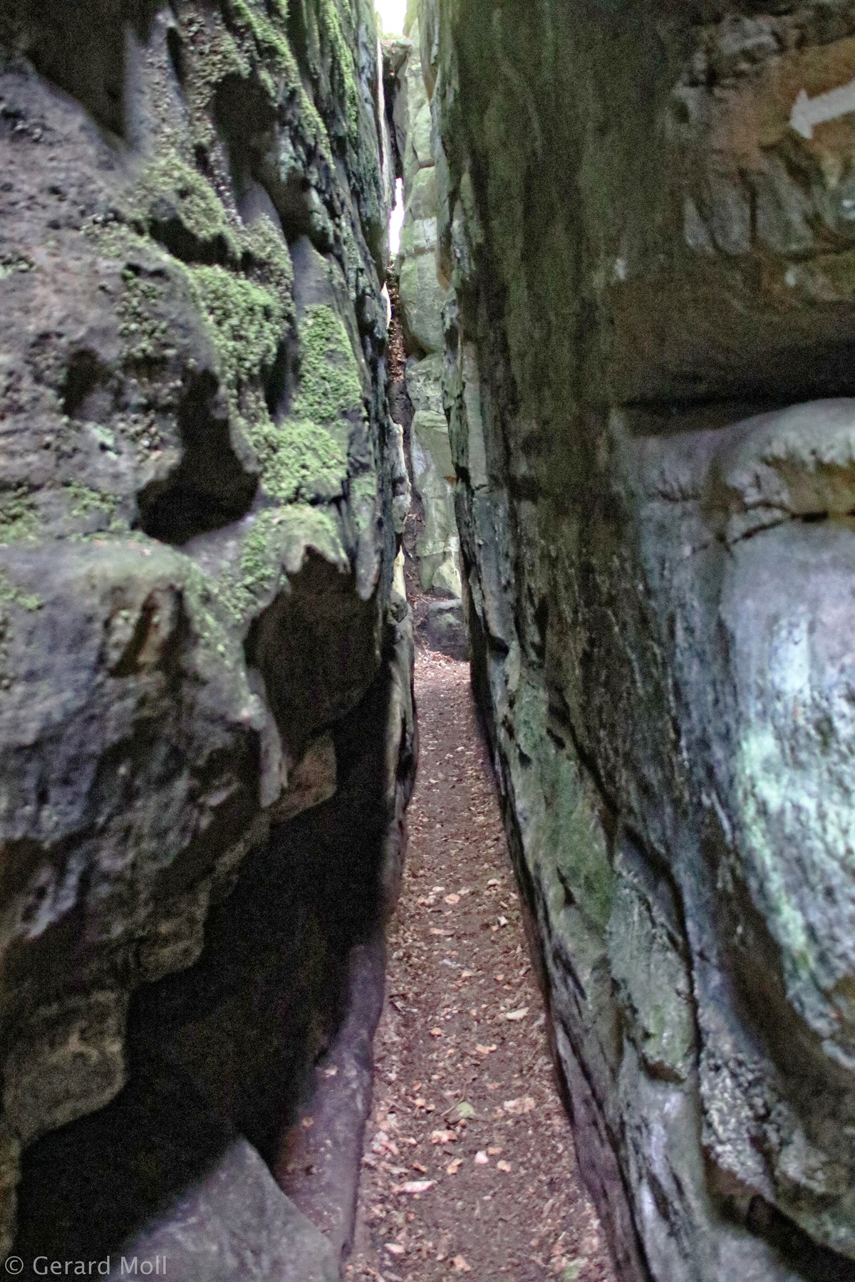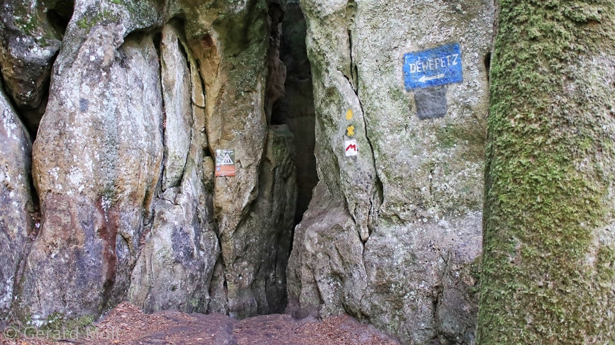 Vom Parkplatz an der Consdorfer Mühle führt zuerst ein breiter Weg in das Tal, den wir aber bald verlassen und auf einem abenteuerlichen Weg durch die engen Felsschlüffe des Rittergangs, des Déiwen Pëtz und der Kuelscheier. Dann geht es an einer steinzeitlichen Fundstätte vorbei hinauf auf offene Felder. Nach dem Überqueren der Strasse kommen wir an Felsformationen vorbei nach Scheidgen und zuück nach Consdorf und seiner Mühle.