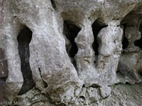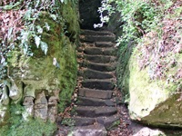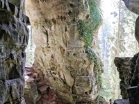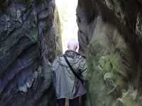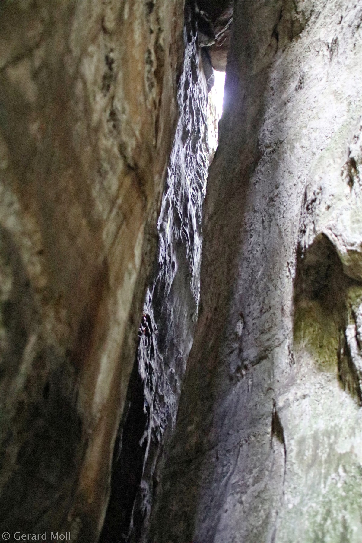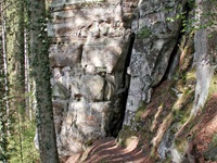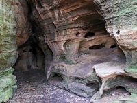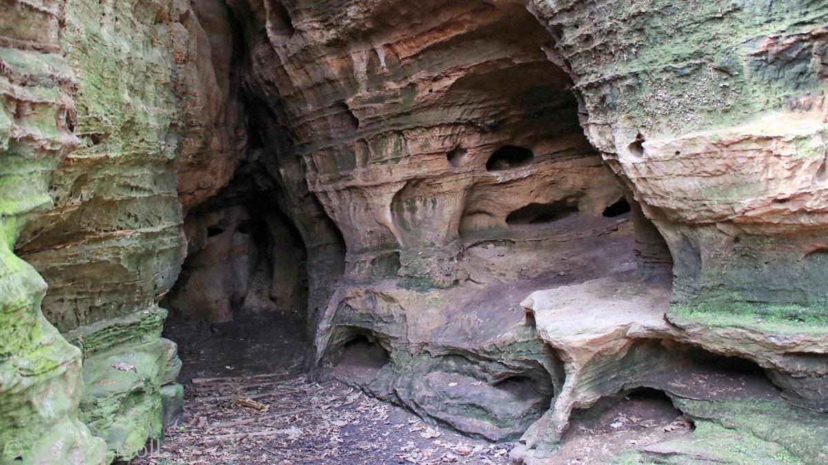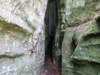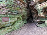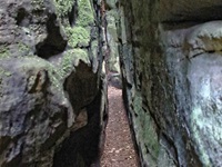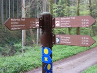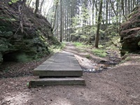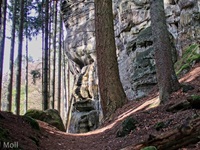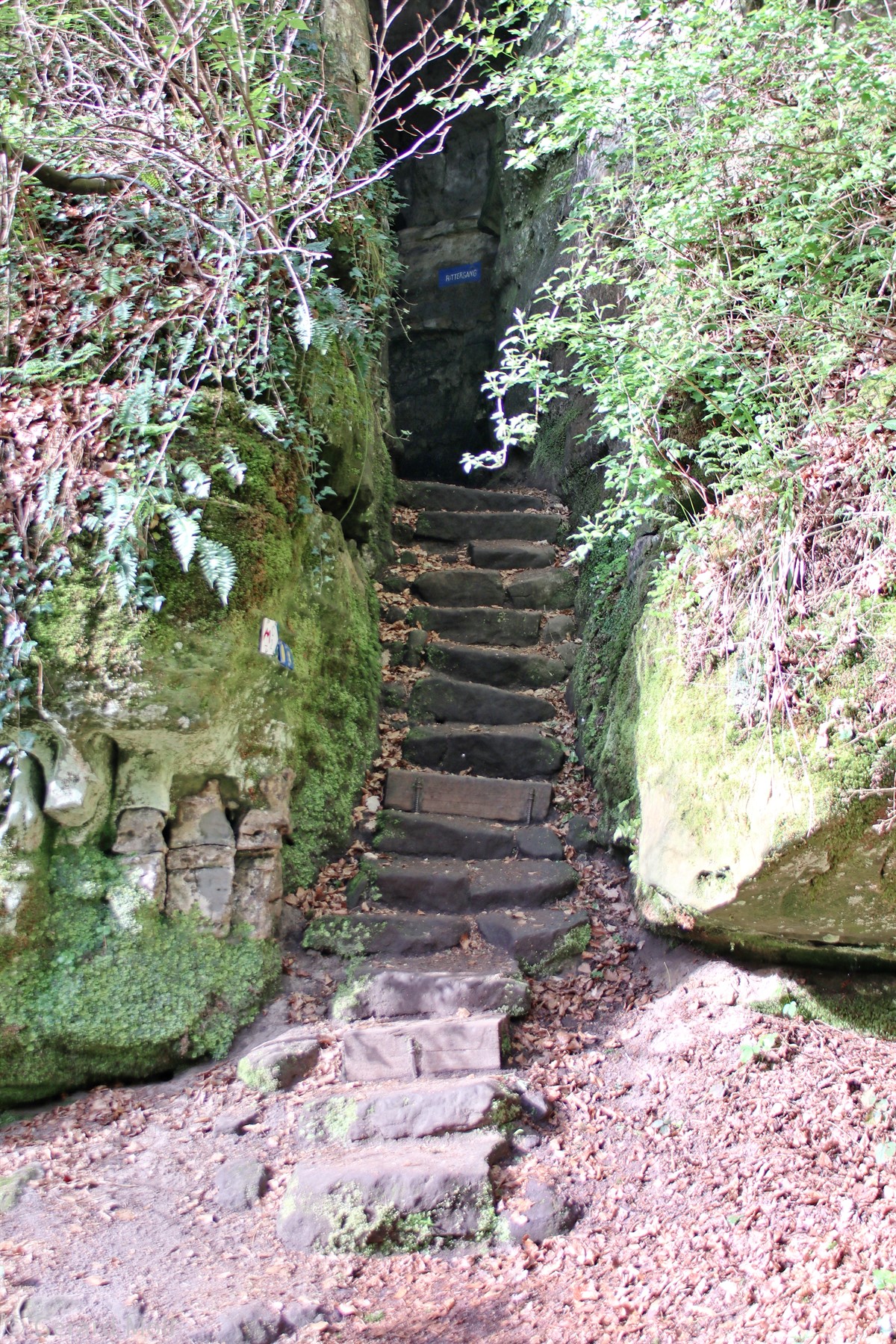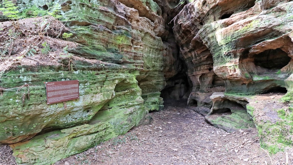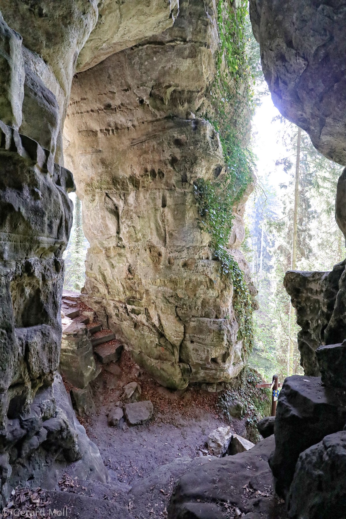 Vom Parkplatz an der Consdorfer Mühle führt zuerst ein breiter Weg in das Tal, den wir aber bald verlassen und auf einem abenteuerlichen Weg durch die engen Felsschlüffe des Rittergangs, des Déiwen Pëtz und der Kuelscheier. Dann geht es an einer steinzeitlichen Fundstätte vorbei hinauf auf offene Felder. Nach dem Überqueren der Strasse kommen wir an Felsformationen vorbei nach Scheidgen und zuück nach Consdorf und seiner Mühle.