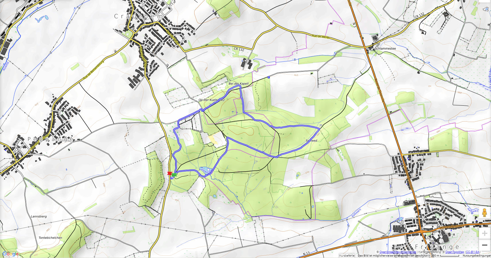 Wir starten an einem großen Parkplatz an der Strasse zwischen Crauthem und Hellange. Der gut markierte Weg erreicht bald den schön gelegenen Aleweier. Zahlreiche Tafeln erklären uns auf dem Weg durch den Wald die Zusammenhänge in der Natur. Etwa nach einer guten Stunde kommen wir wieder bei unserem Ausgangspunkt an.