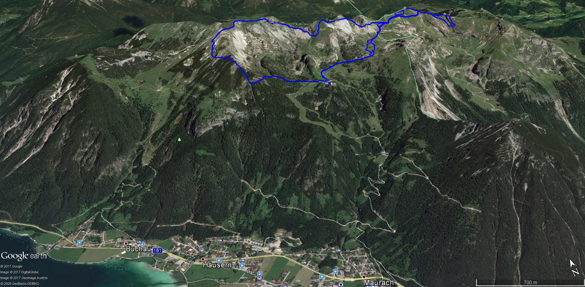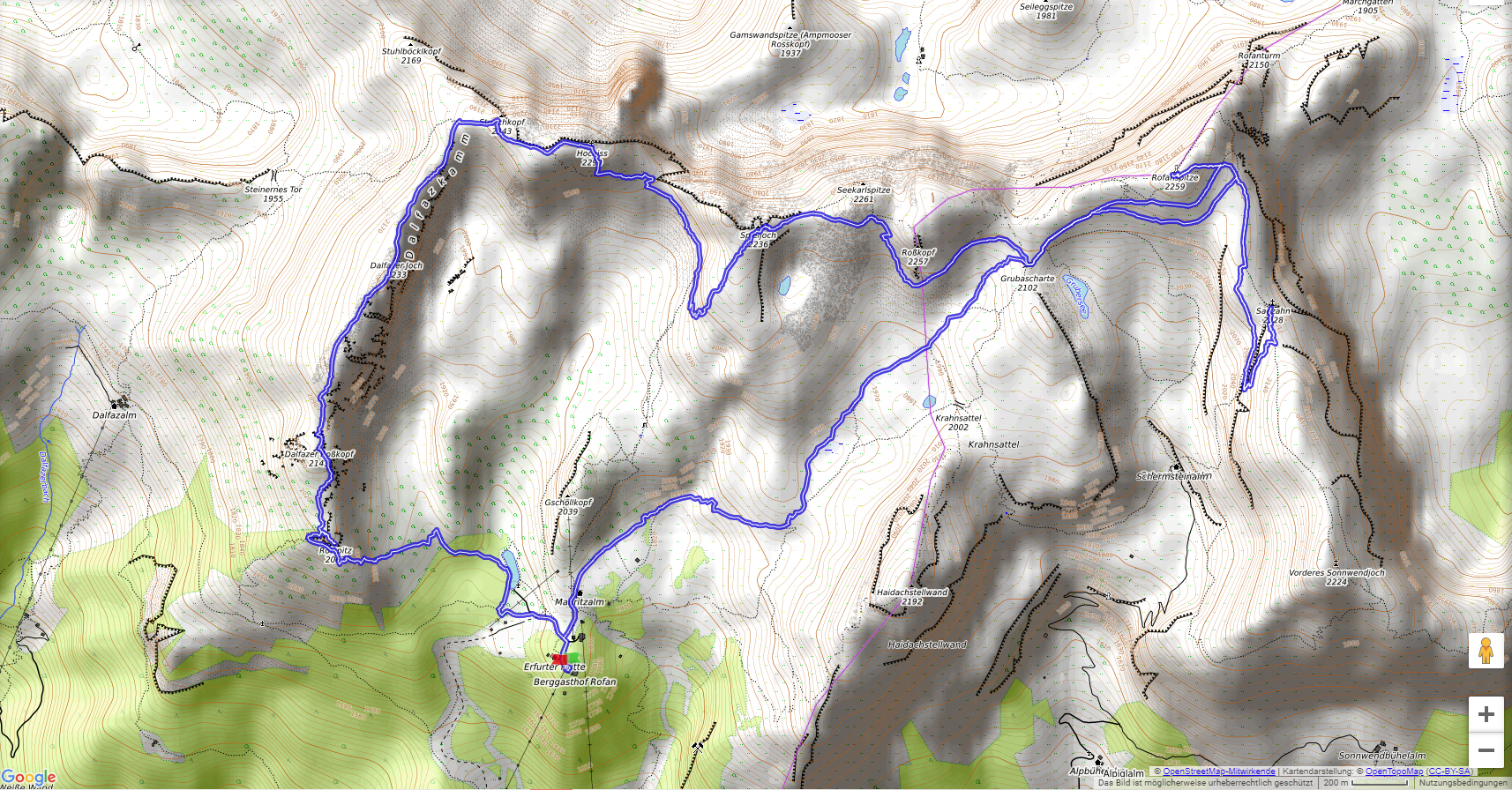Die Erfurter Hütte kann mit der Seilbahn von Maurach erreicht werden. Über die Rotspitze, Dalfazer Rosskopf, Dalfazjoch und Streichkopf wird auf teilweise gesichertem Weg der höchste Gipfel der Brandenberger Alpen, die Hochiss (2299 m), erreicht. Weiter geht es zur Rofanspitze (2259 m) und zum Abschluss muss noch der kurze Klettersteig am Sagzahn (2228 m) überwunden werden.