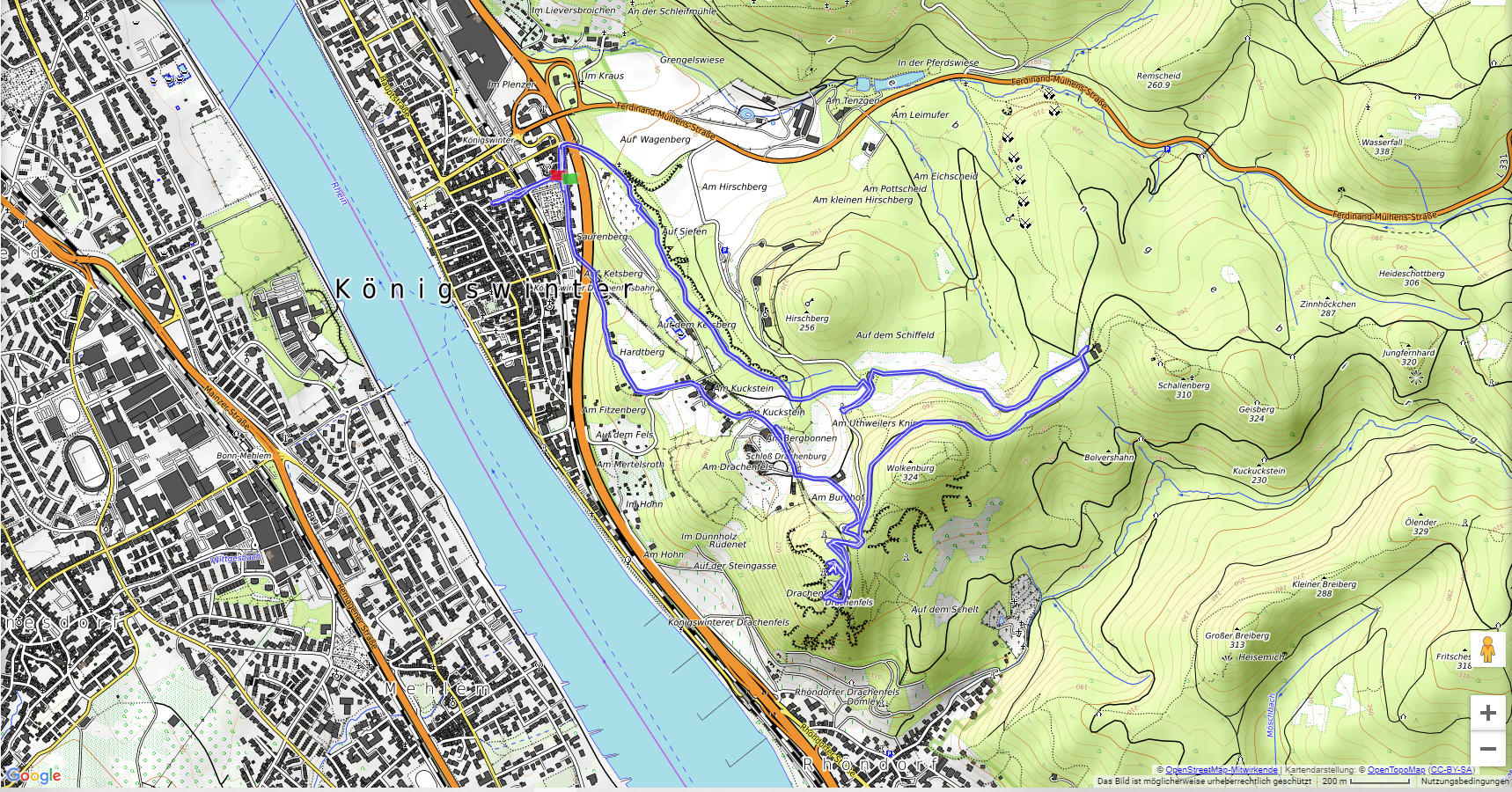 Der Drachenfels überragt den Rhein um fast 300 Meter. Wir starten in Königswinter und steigen, vorbei an der Nibelungenhalle und dem Schloss Drachenburg, hinauf auf den Gipfel des Drachenfels.  Auch beim Abstieg benutzen wir nicht Deutschlands älteste Zahnradbahn, sondern wandern über die Ausflugsgaststätte Milchhäuschen und durch das Nachtigallental zurück nach Königswinter.
