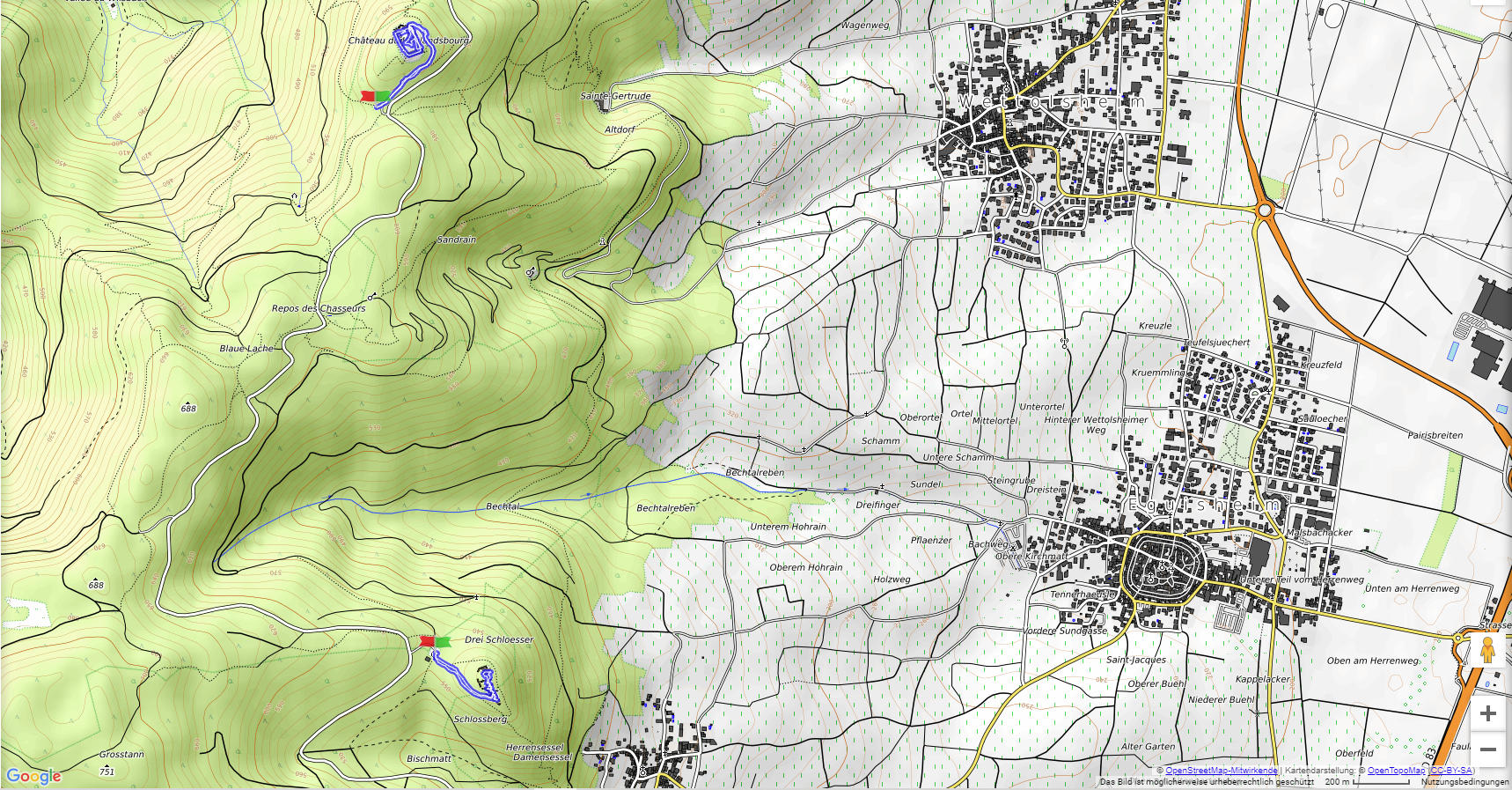 Oberhalb von Eguisheim befinden sich die Drei Exen (les trois châteaux d´Eguisheim). Der  Ursprung der Burgengruppe geht auf das Jahr 1006 zurück. Unweit davon befindet sich die beeindruckende Burg Hohlandsberg aus dem 13. Jahrhundert.