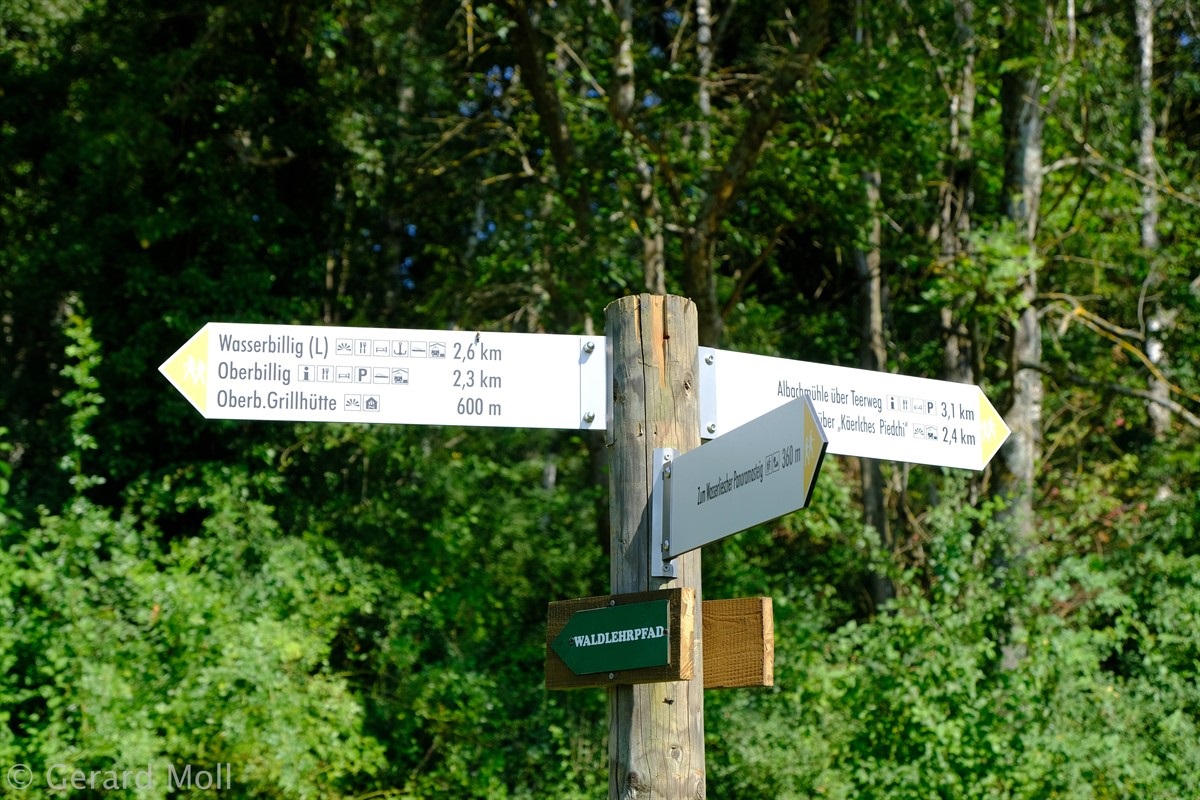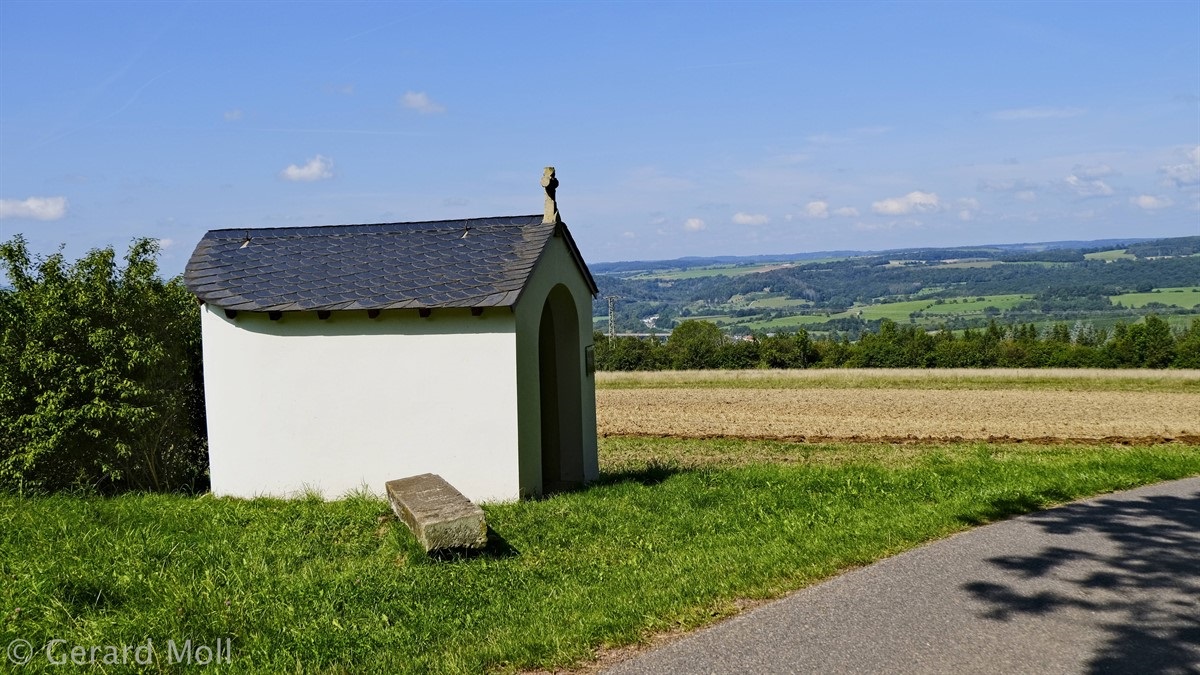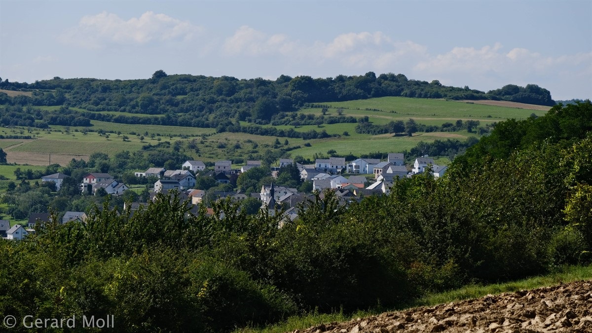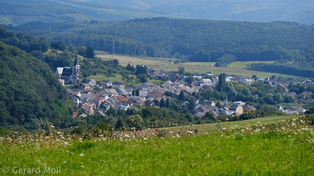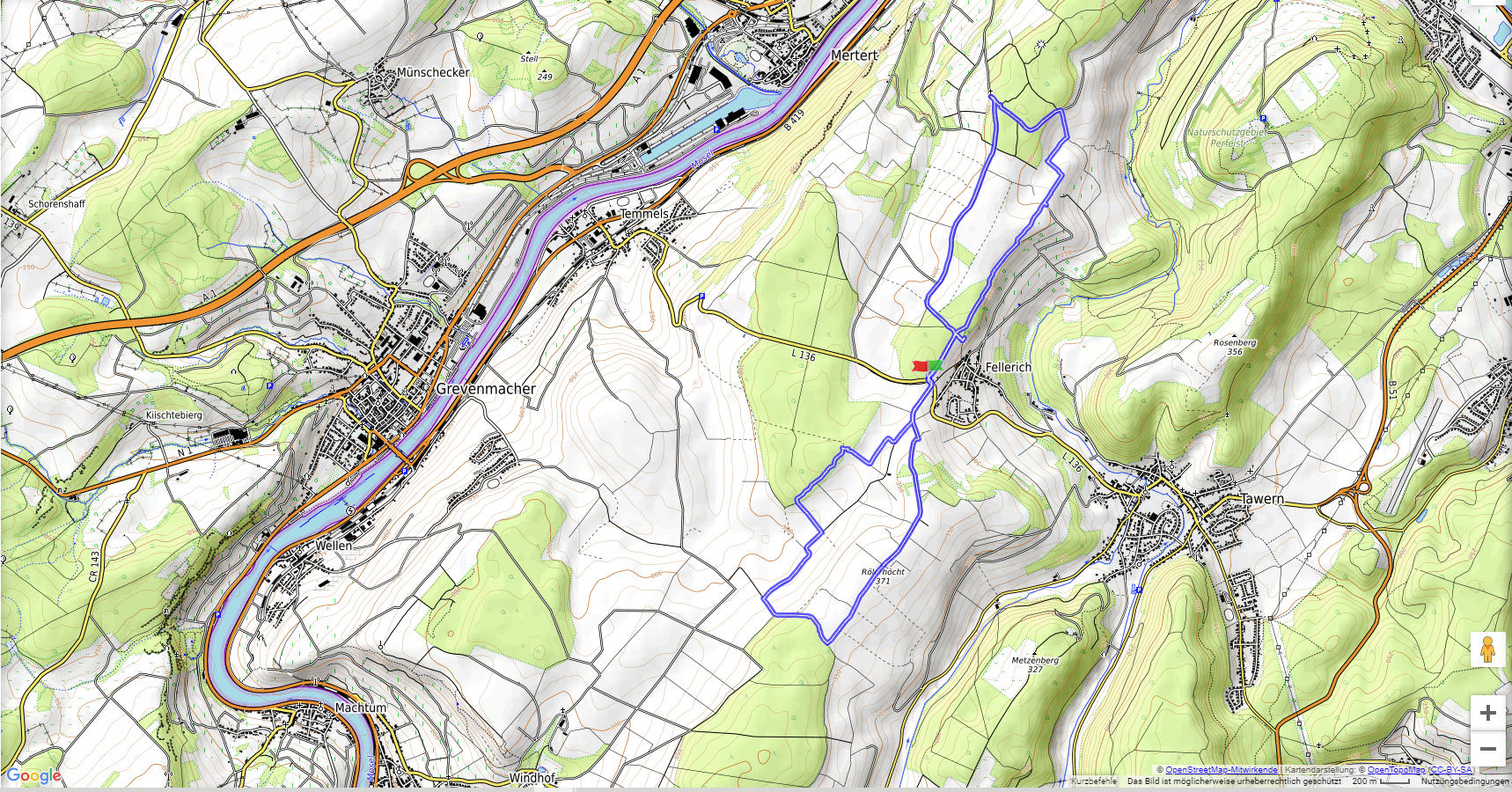 Da es auf dem Plateau oberhalb von Fellerich keinen offiziellen Rundweg gibt, haben wir uns diese Runde mit Hilfe der Karte zusammengesetzt. Am Waldrand kurz oberhalb von Fellerich an der L136 befindet sich ein Parkplatz, von dem wir zuerst in nord-östlicher Richtung losgegangen sind. Über Felder kommen wir zu einem Wegweiser, von dem aus wir durch Wald zu der Oberbilliger Grillhütte gelangen. Von der nahegelegenen Rochuskapelle bringt uns der aussichtsreiche Weg zurück zum Ausgangspunkt. Anschließend wechseln wir die Straßenseite und wandern hinauf zur 371 Meter hohen Rölerhöcht. Nach der "Wüstung Birkelterhof" verkündet ein Hinweisschild, dem Moselsteig zuerst nach rechts und dann links zum Waldrand zu folgen. Besser wäre es aber, nicht unserem Track zu folgen, sondern an der Linksabbiegung geradeaus weiterzugehen, um zum Parkplatz zurück zu kommen.