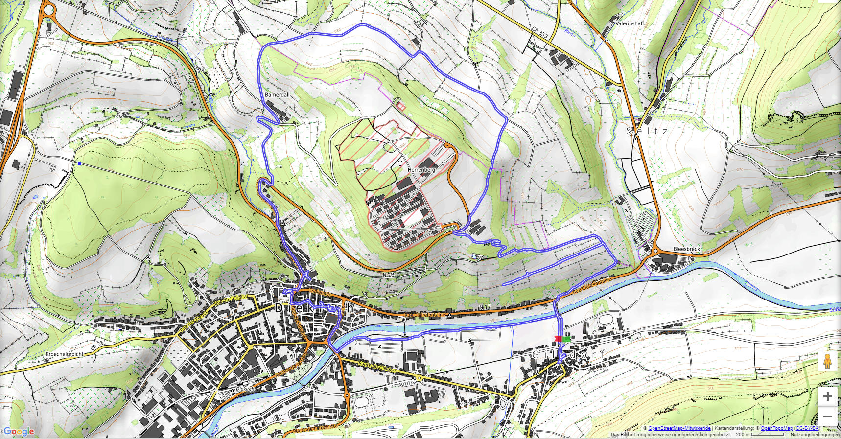 Wir starten auf dem Parkplatz nahe der Gilsdorfer Kirche. Gleich zu Beginn heißt es den Herrenberg zu besteigen wo ein Pavillon uns einen herrlichen Blick auf das Sauertal schenkt. Um den Herrenberg herum erreichen wir das Bamerdall und steigen nach Diekirch ab. Nach einer kleinen Besichtigungstour wandern wie am Ufer der Sauer zurück nach Gilsdorf.