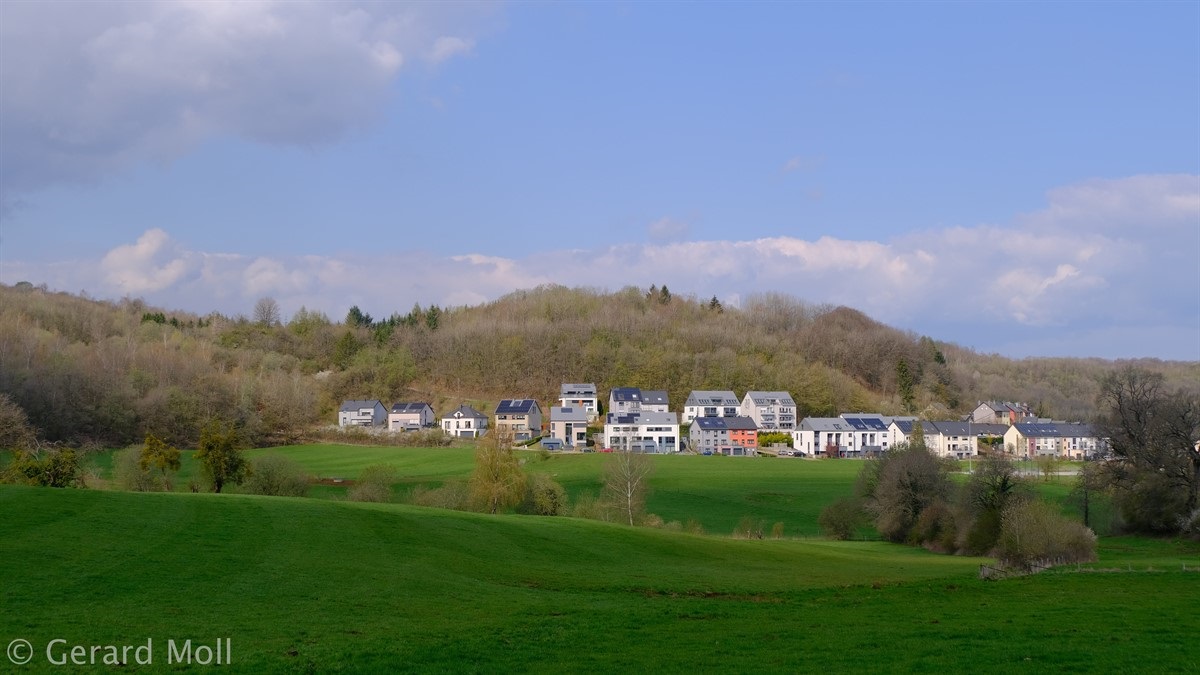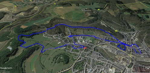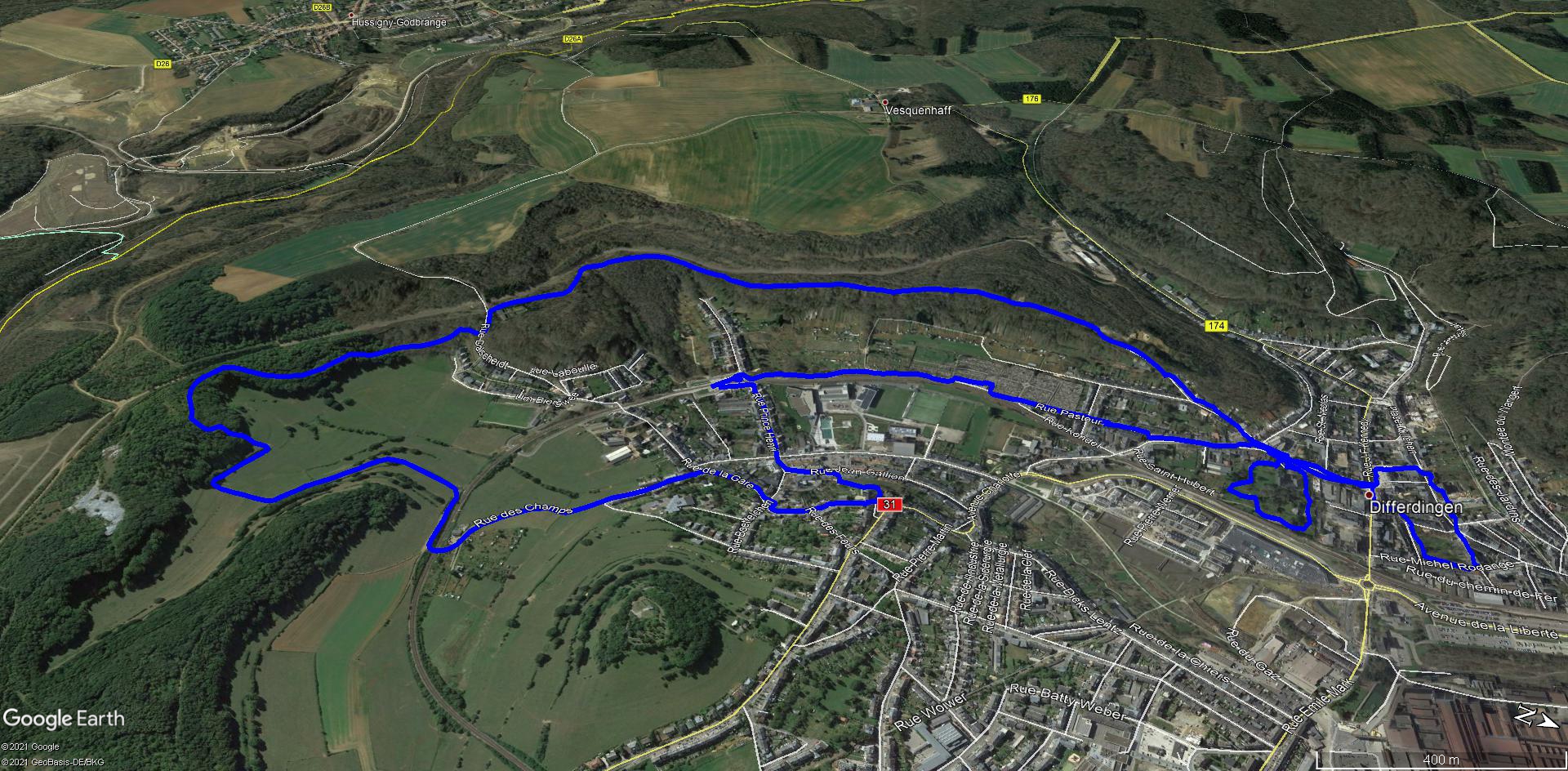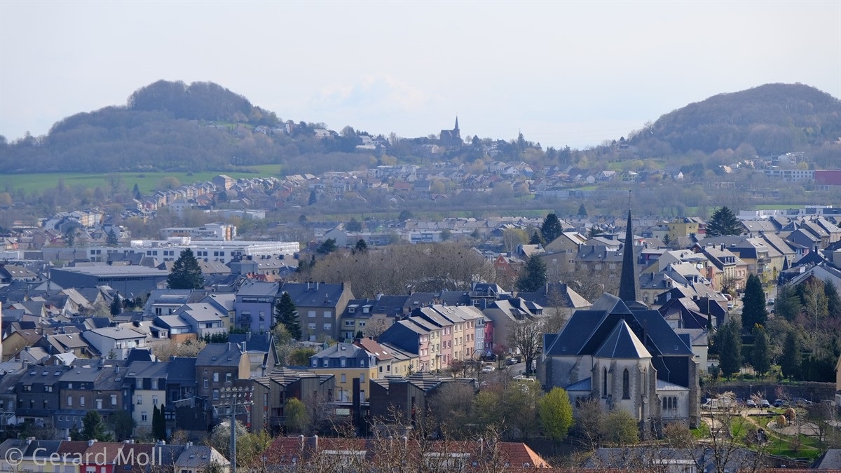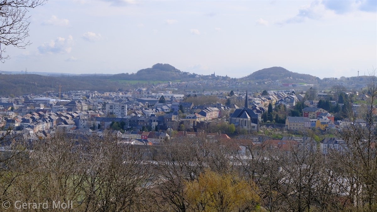 Wir starten am neuen und alten Stadthaus und umrunden das sehenswerte Schloss, in dem die Miami University ihren Sitz hat. Ein kleiner Abstecher bringt uns zu dem Park Gerlach. Hier stand einst Schloss Gerlach, von dem nur noch ein Pavillon erhalten ist. An seiner Stelle überrascht uns ein kleiner Park mit einer Blumenuhr. Dann nehmen wir unsere eigentliche Tour in Angriff, wir wandern unterhalb vom Alebierg in südlicher Richtung bis wir in der Nähe der Quelle der Korn (Chiers) absteigen und Oberkorn erreichen. Entlang der Bahntrasse und am Friedhof vorbei kehren wir nach Differdange zurück.