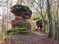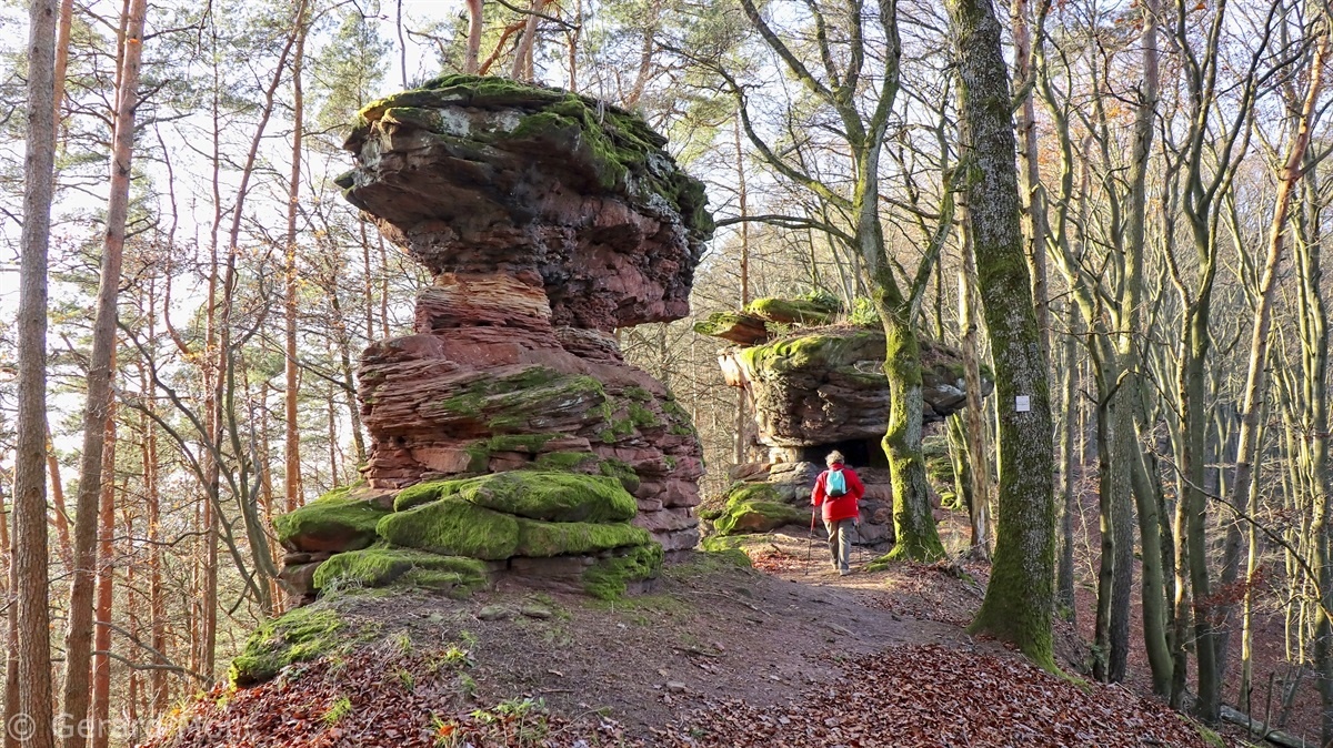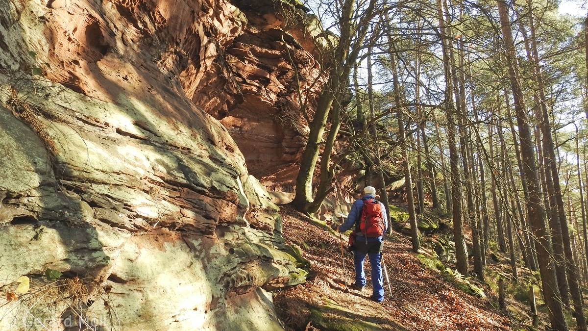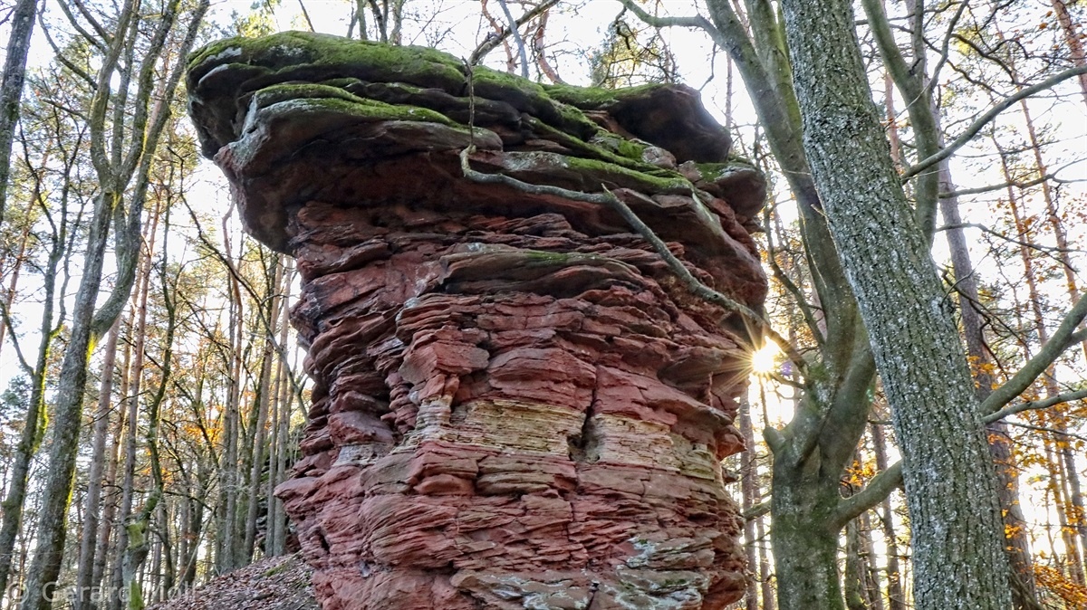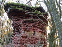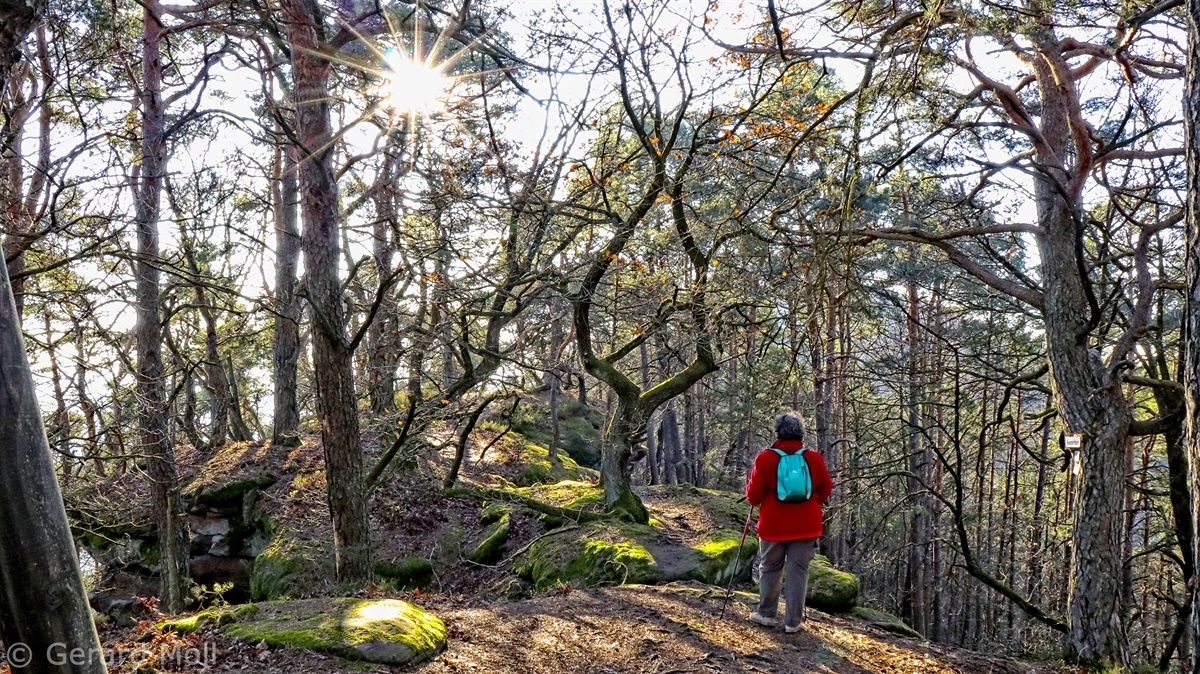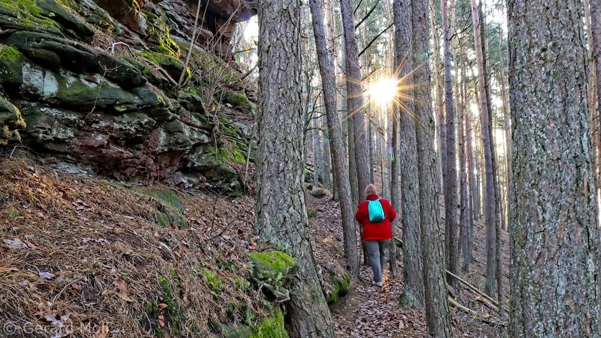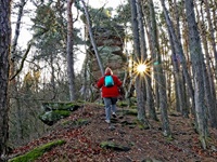 Vom Parkplatz vor dem Ortseingang von Dimbach führt der Weg gleich steil hinauf zum Falkenstein. An zahllosen Felsen vorbei wird der Dimberg erreicht. Weitere herrliche Punkte sind die Rötzenfelsen auf dem Rötzenberg, die Isselmannsteine und die Kieungerfelsen. An dem markanten Keeshäwel-Felsen vorbei, steigen wir zum Schluss nach Dimbach ab.