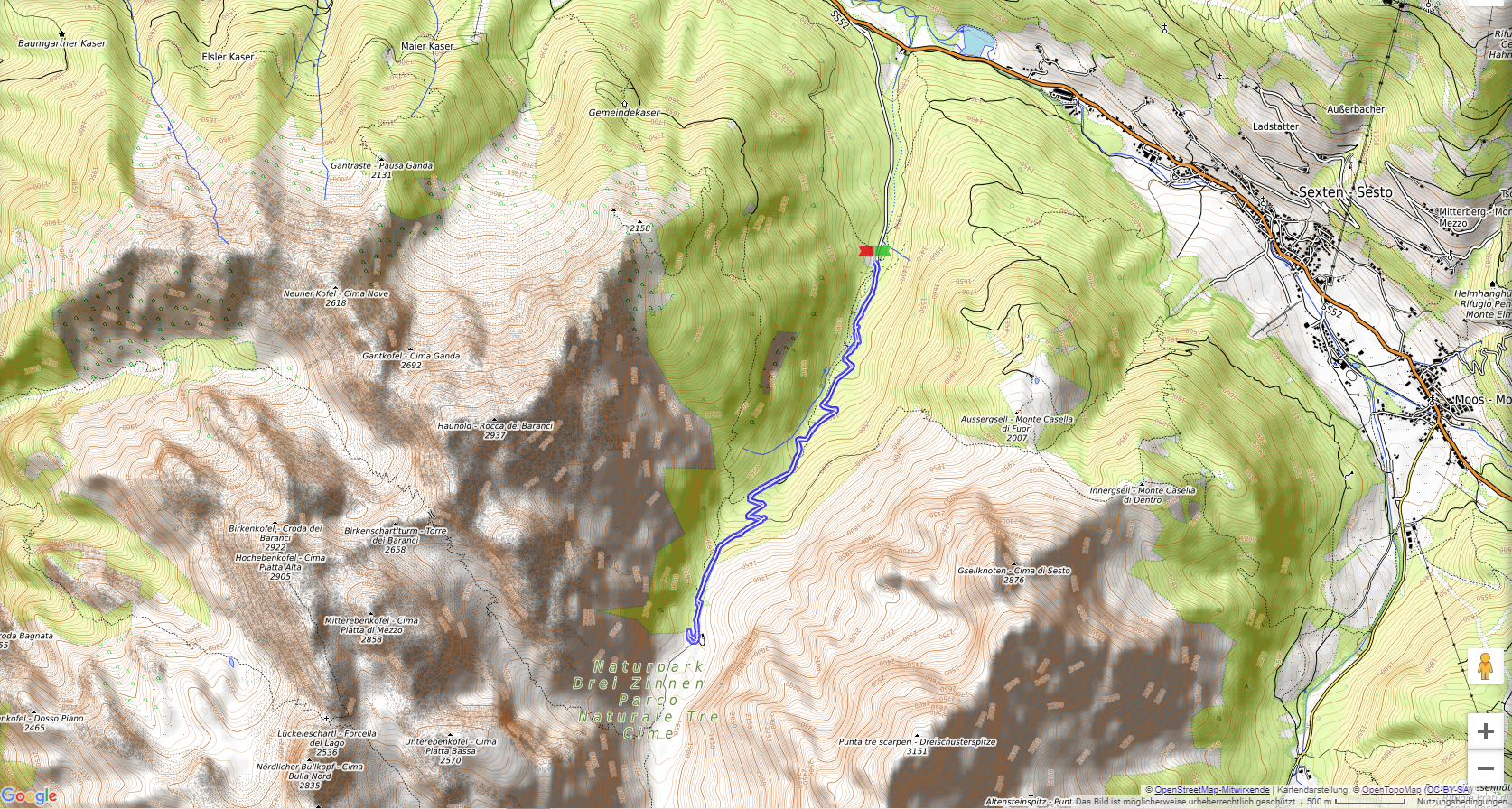 Vom Parkplatz (1254 m) im Sextener Tal ist die Dreischusterhütte (1626 m) schnell erreicht. Wer sich nicht ausgelastet fühlt, sollte durch das schöne Innerfeldtal bis zur Drei-Zinnenhütte (2405 m) weiterwandern !