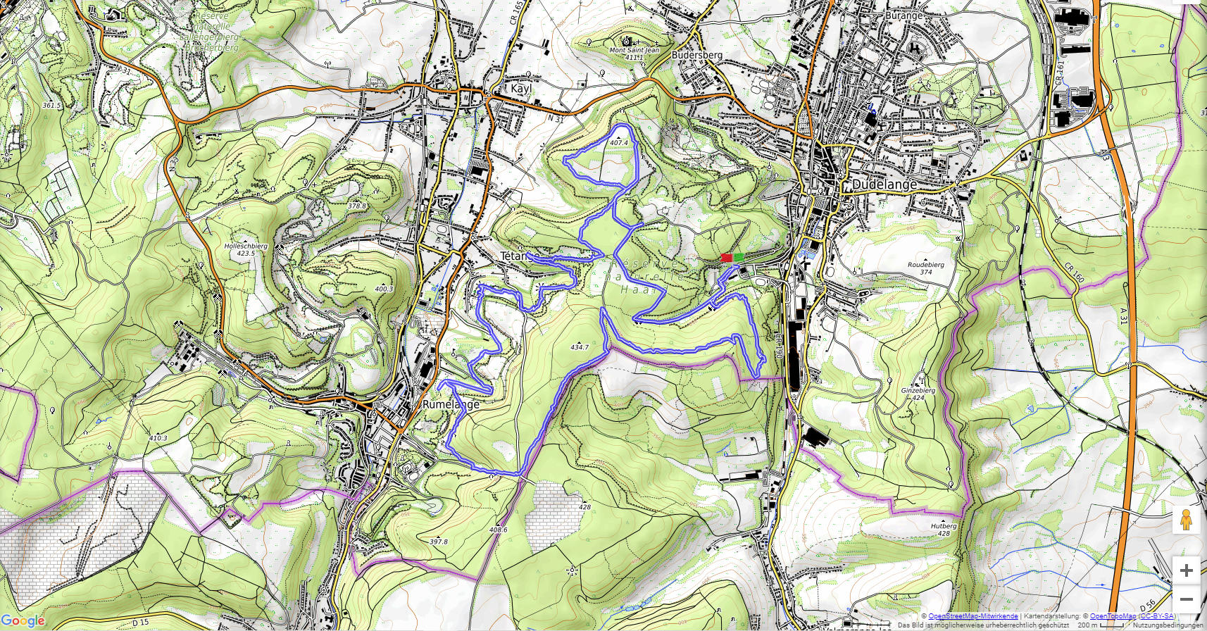Das Gelände um den Teitenger Minettswee kann auch von Dudelange erreicht werden. Wir starten am Sportplatz im Süden von Dudelange, erreichen das ehemalige Bergwerksgelände oberhalb von Tétange und kehren am Langenberg vorbei wieder zurück nach Dudelange.