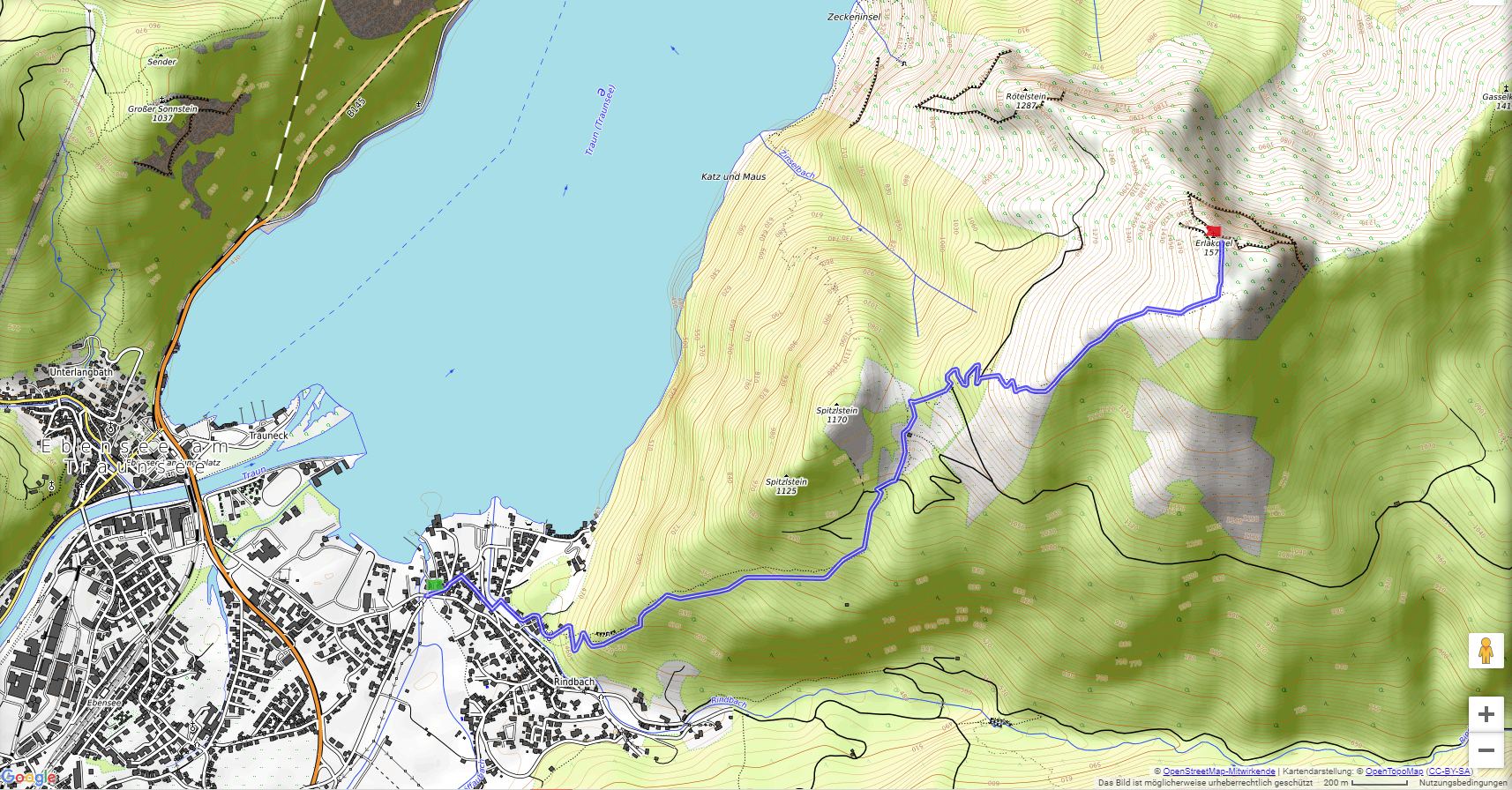 Von Ebensee (426 m) geht der Weg ziemlich direkt hoch zum Erlakogel (1575 m), der einen traumhaften Blick über den Traunsee und auf den Traunstein bietet.