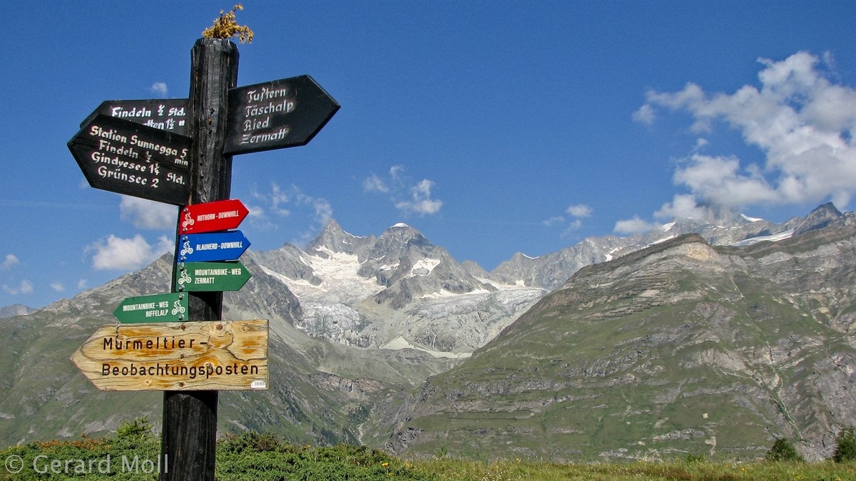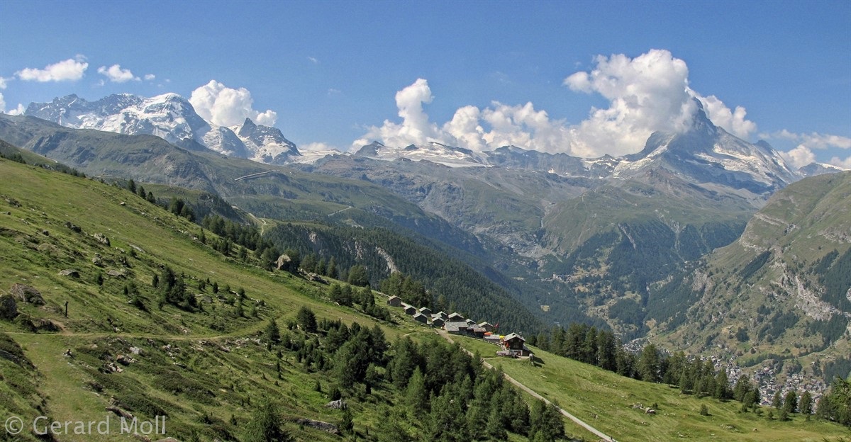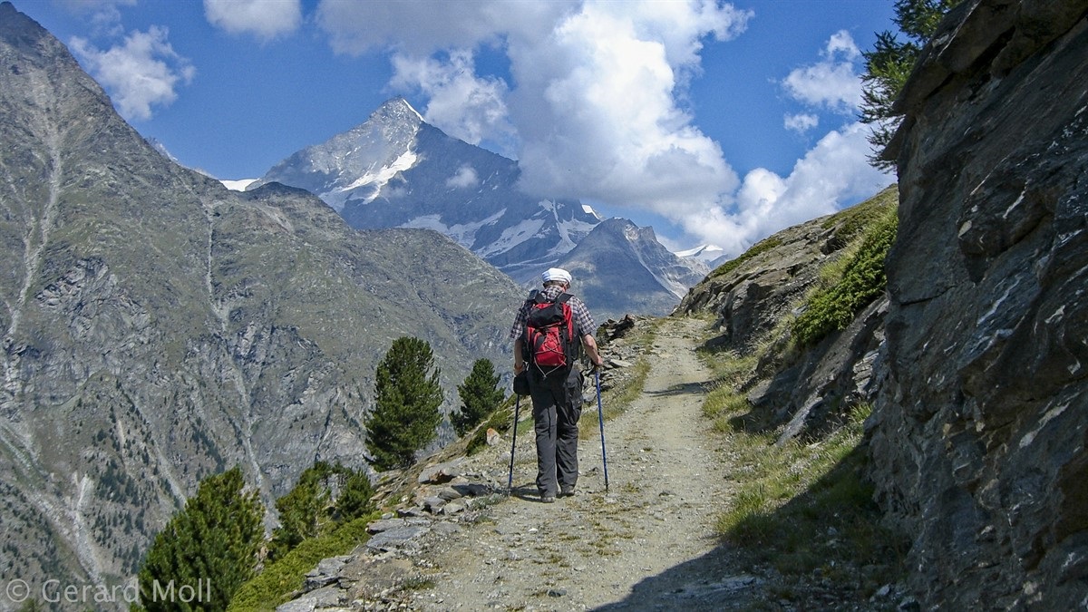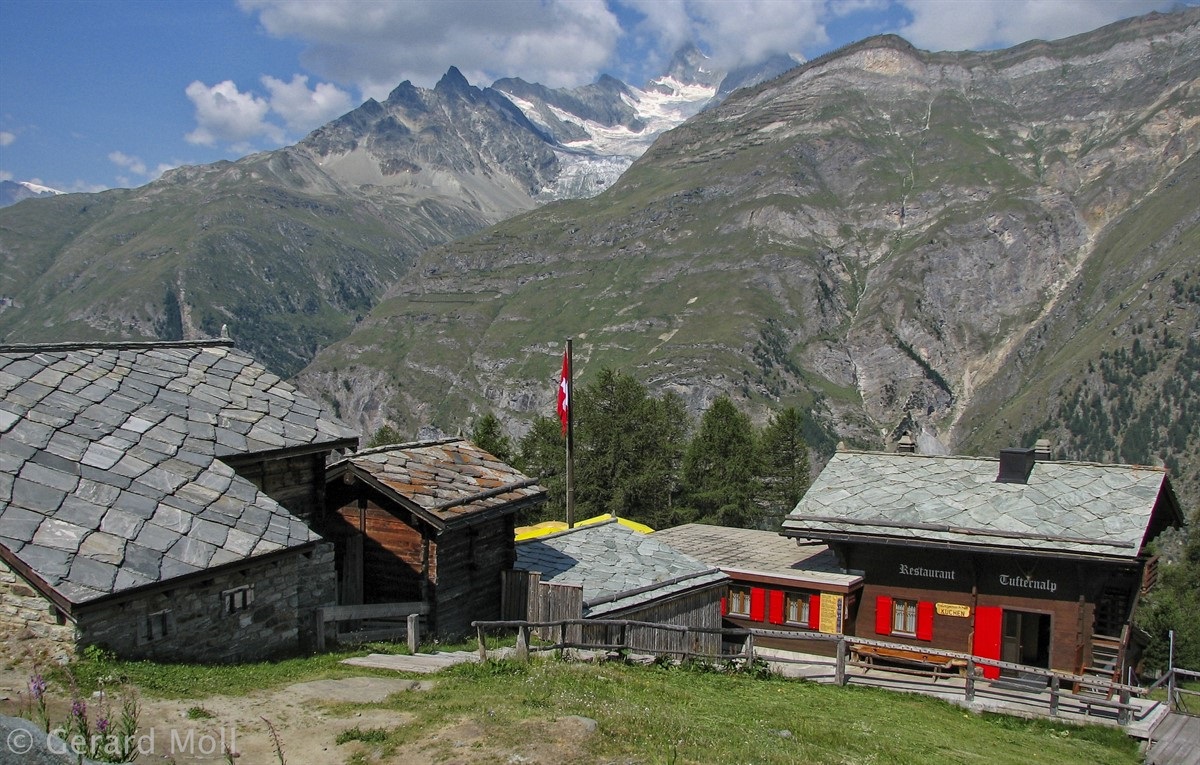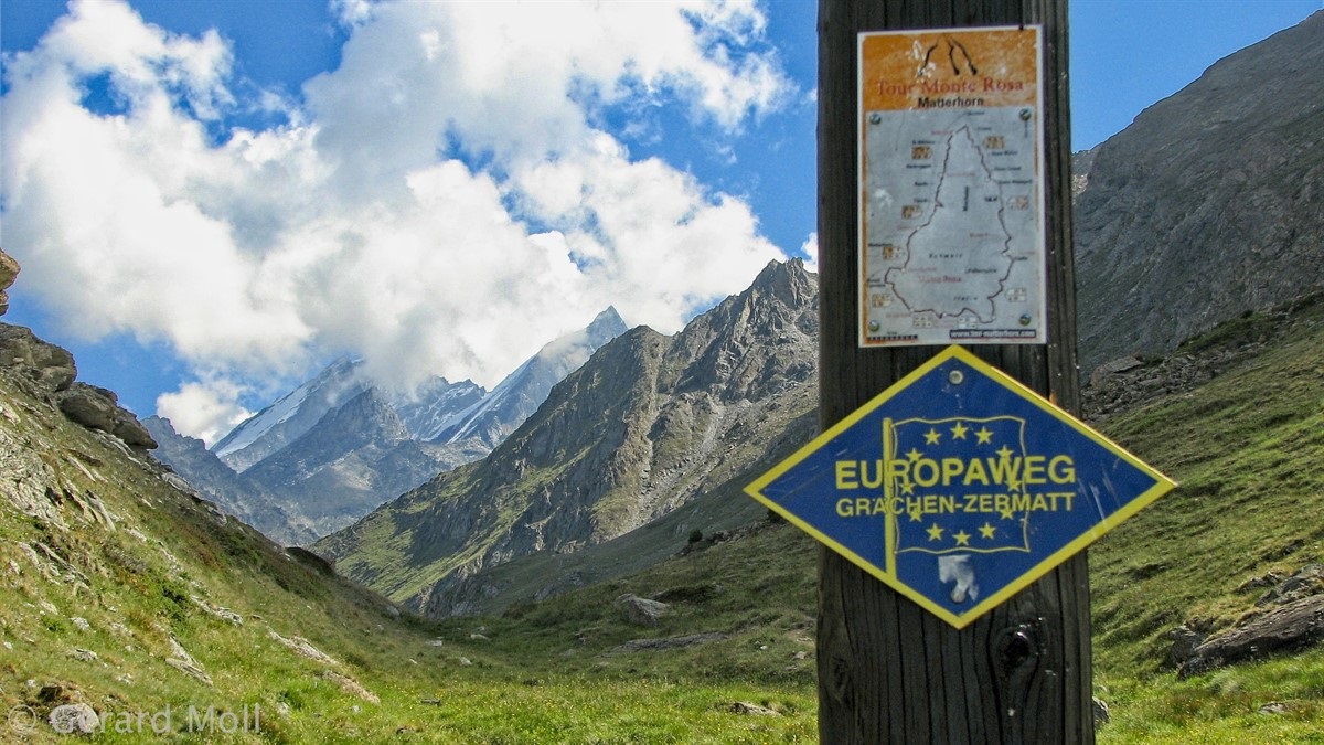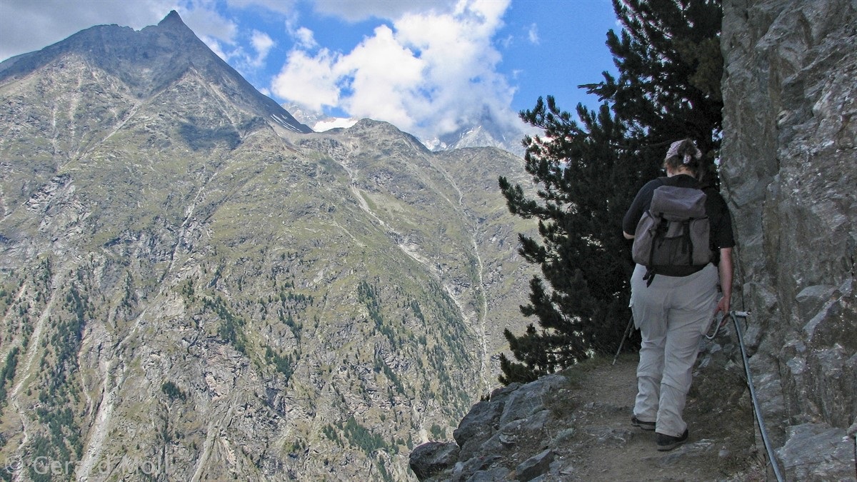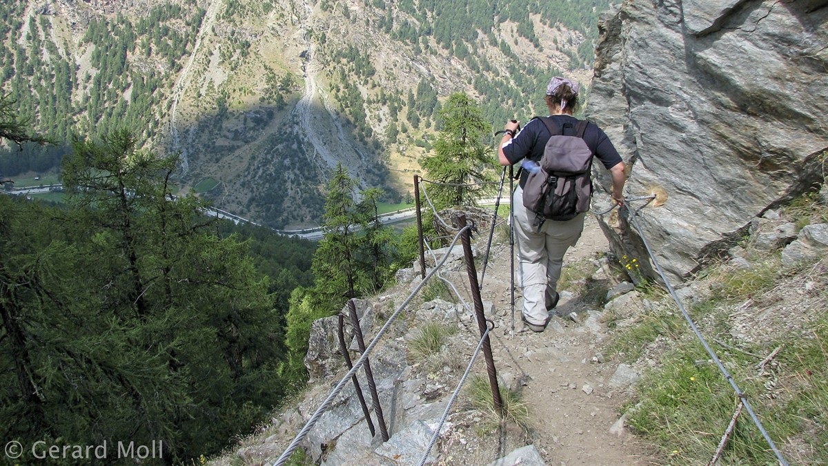Eine unterirdische Standseilbahn (Métro) hat uns von Zermatt hinauf nach Sunnegga (2280 m) gebracht. Der Europaweg führt bequem zum Weiler Tufteren, wir drehen uns aber immer wieder um, um das Matterhorn zu bestaunen. Der aussichtsreiche Weiterweg bringt uns, zum Teil mit Drahtseilsicherungen, zur Täschalpe Ottafe. Der Europaweg, eigentlich eine Zwei-Tagestour, führt weiter bis nach Grächen, wir aber steigen von der Täschalpe hinunter nach Täsch.