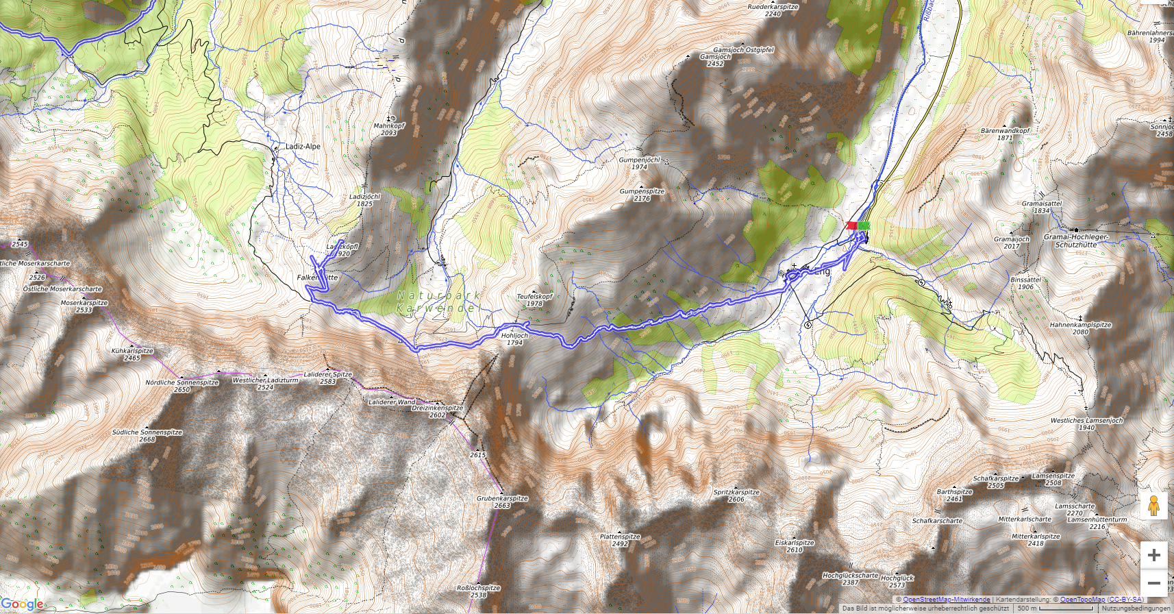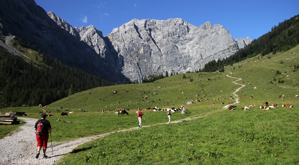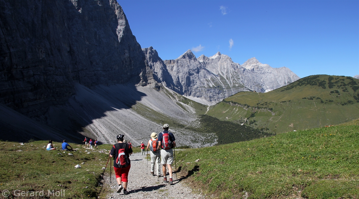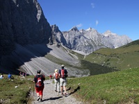 Vom Parkplatz in der Eng (Mautstraße) führt ein landschaftlich großartiger Weg über das Hohljoch in 2,5 Stunden zu der Falkenhütte auf 1848 m.  Der Abstieg ist auch durch das Laliderertal oder das Johannistal möglich.
