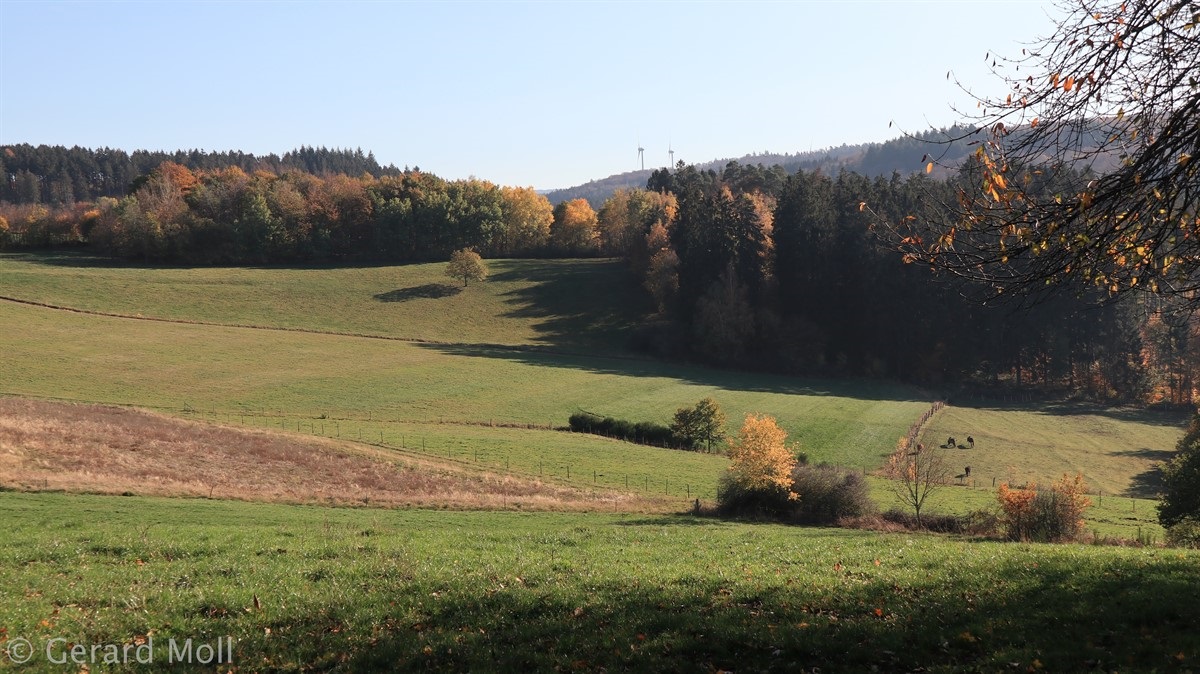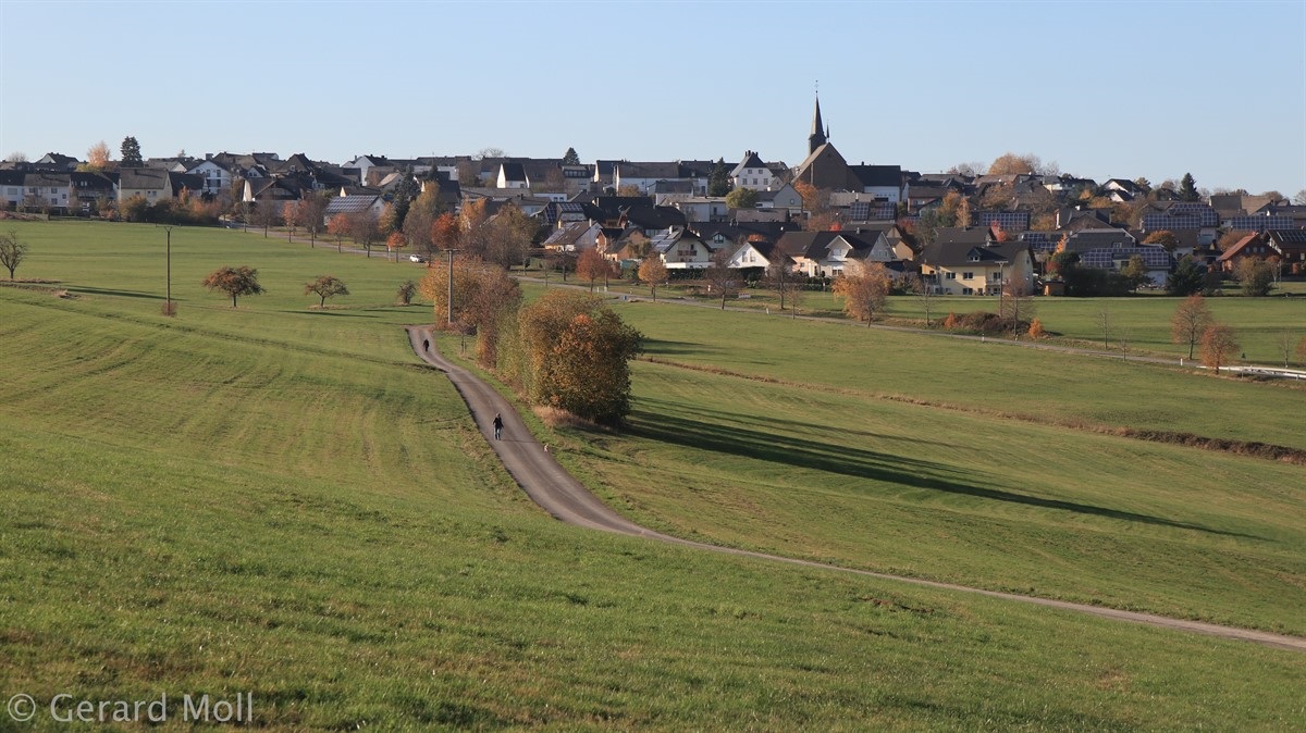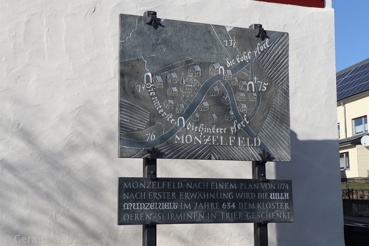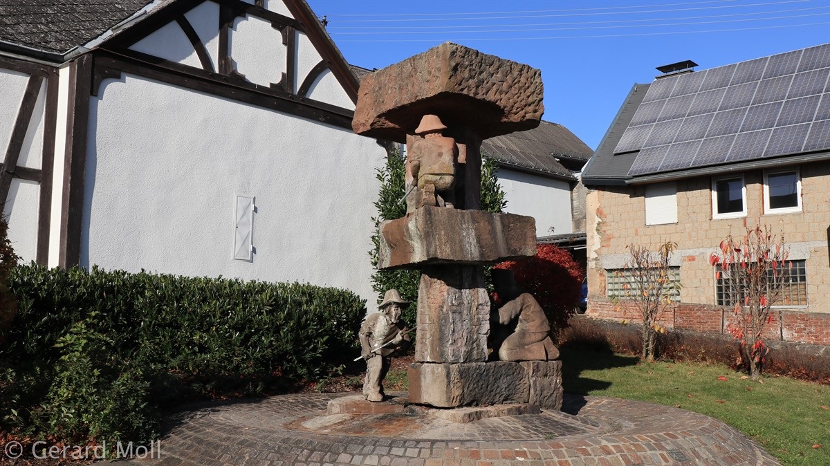Vom Bergarbeiterbrunnen in Monzelfeld führt der Weg zuerst durch den Ort, dann über Felder hinunter in das Tal des Hinterbachs. An alten Mühlen vorbei erreichen wir den kleinen Ort Annenberg. Hier wurde früher Bergbau betrieben. Wieder auf der Hochfläche angekommen, bieten sich uns weite Blicke in die Hunsrück-Landschaft. Wir berühren den Hubertusweg, der von Longkamp herüber kommt, und kehren über Felder zurück nach Monzelfeld.