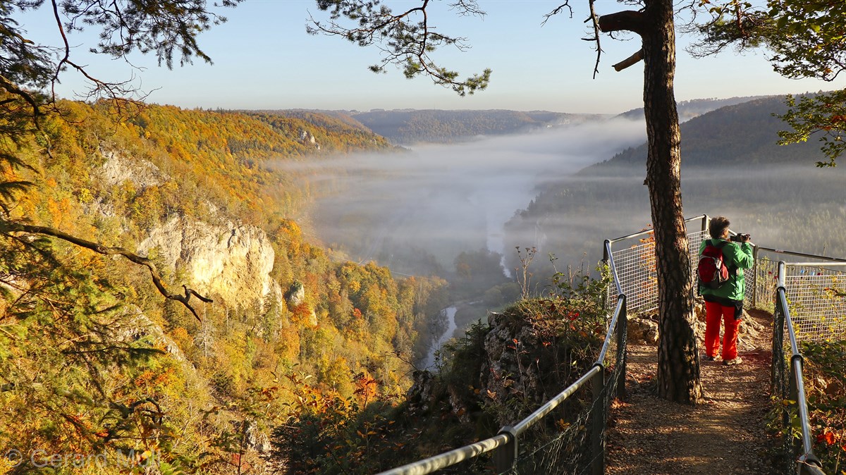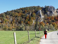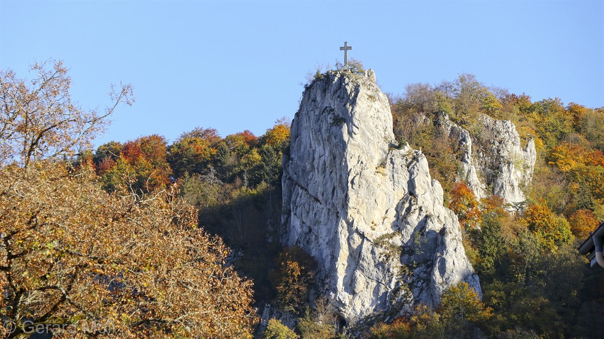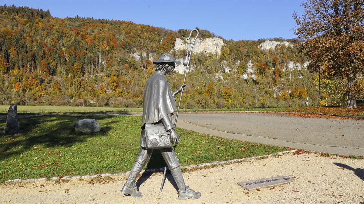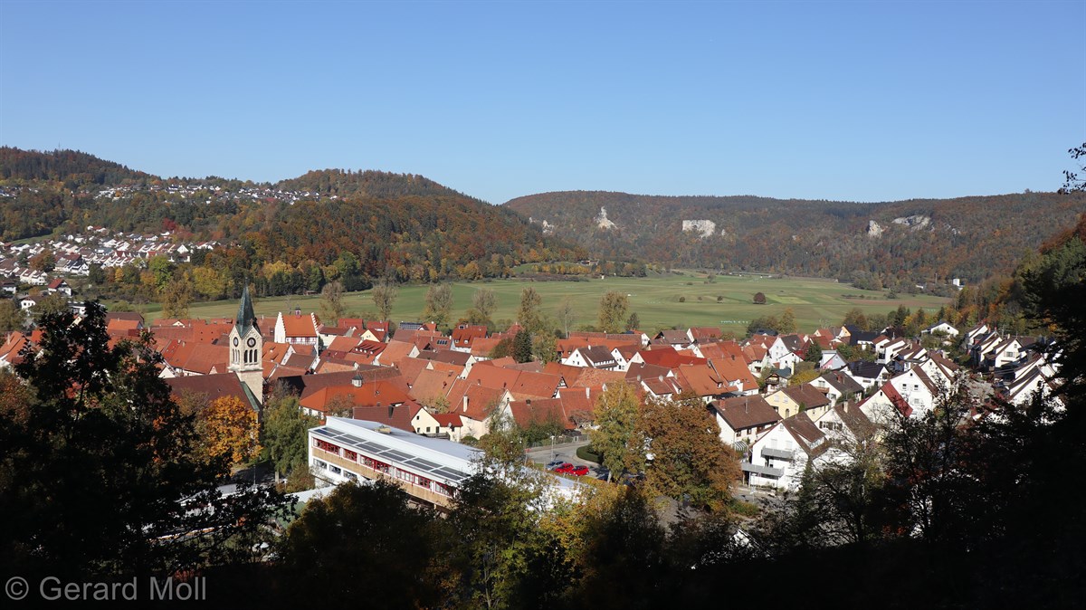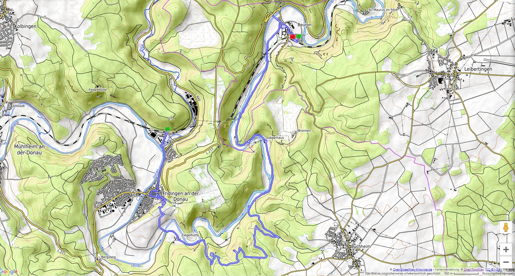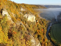 Nach einem Halt am Top-Aussichtspunkt Knopfmacherfelsen haben wir in Beuron geparkt und sind mit der Bahn nach Fridingen gefahren. Nach einem Rundgang durch Fridingen ging es an der Ziegelhütte vorbei entlang der Donau. Dann folgte der steile Anstieg zur Ruine Kallenberg. Über den Jägerhof an der Donau wurde dann Kloster Beuron erreicht.