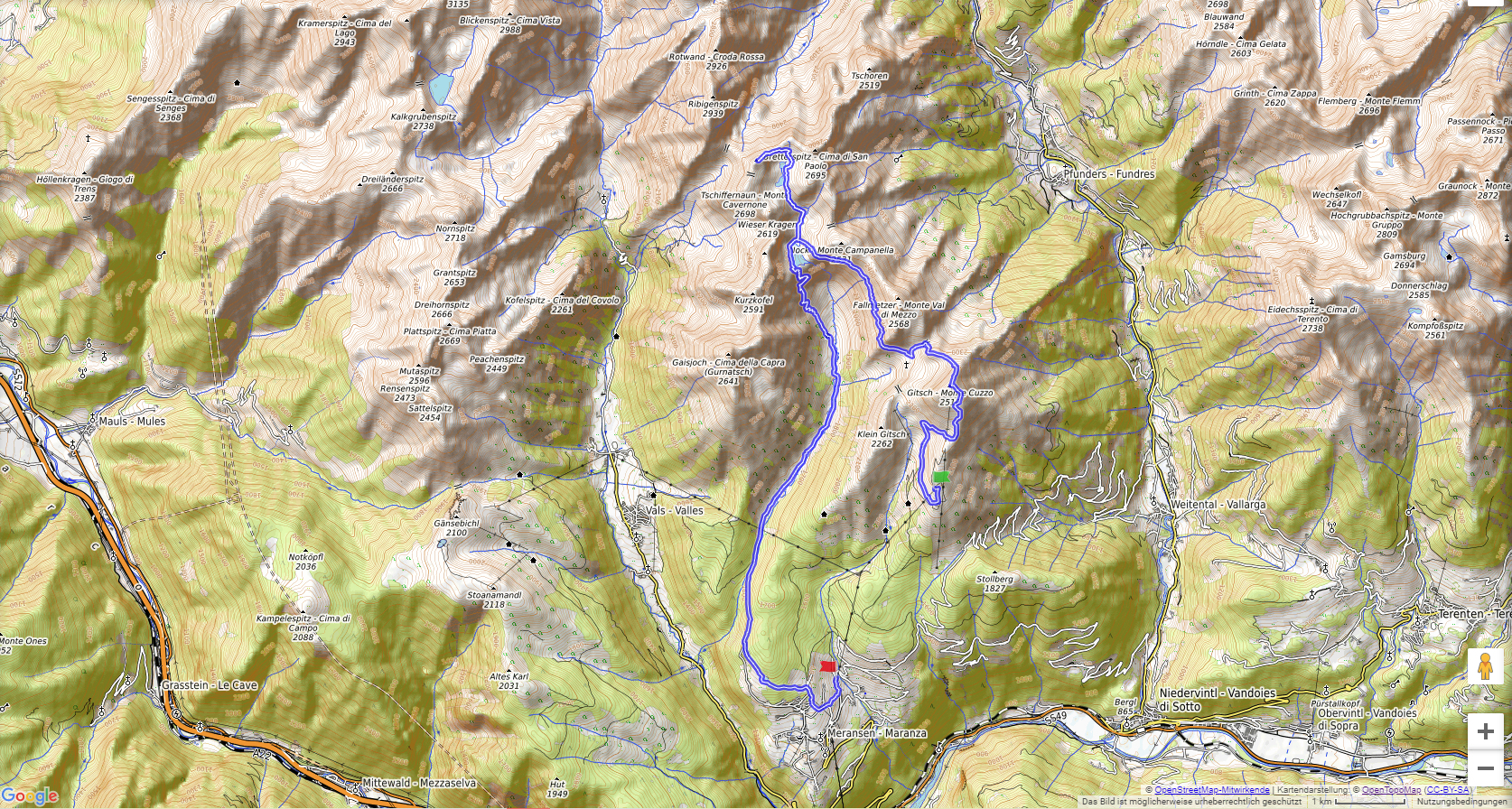 Von Meransen geht es mit der Seilbahn zum Bergrestaurant Gitschberg (2041 m). Von dort ist der grasige Gitschberg (2510 m) schnell erreicht. Der Abstieg zum Falzarer Joch (2259 m) ist sehr steil und verlangt Trittsicherheit und Schwindelfreiheit, ebenso der Übergang zum Grossen Seefeldsee (2271 m). Die  Seefeldspitze (2715 m) ist von hier unschwierig zu erreichen. Vom See Abstieg über Prantner Stadlhütte und Wieserhütte durch das lange Altfasstal zurück zur Talstation der Seilbahn.