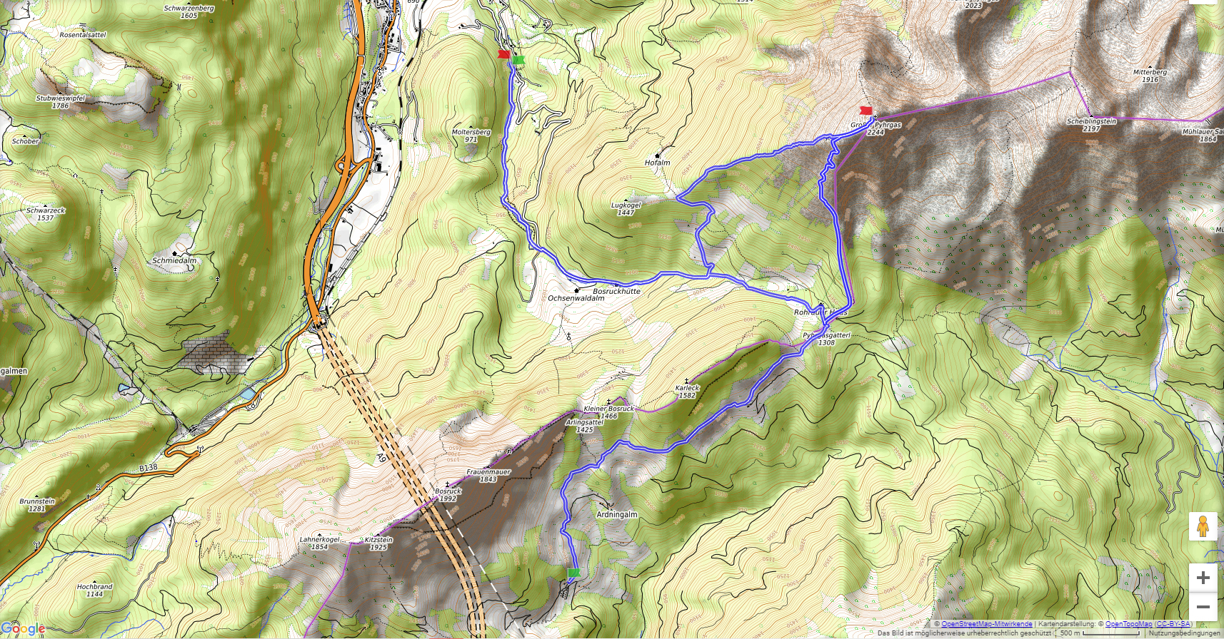 Von Süden startet man am besten an der Ardningalm (1037 m), von Westen am Hasenberg bei Spital (723 m). In beiden Fällen kann man über den Rohrauersattel mit dem Rohrauerhaus (1308 m) gehen, der Weiterweg zum Gipfel des Grossen Pyhrgas (2244 m) erfordert Trittsicherheit.