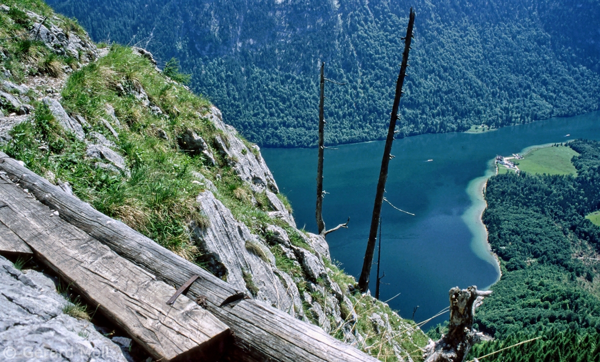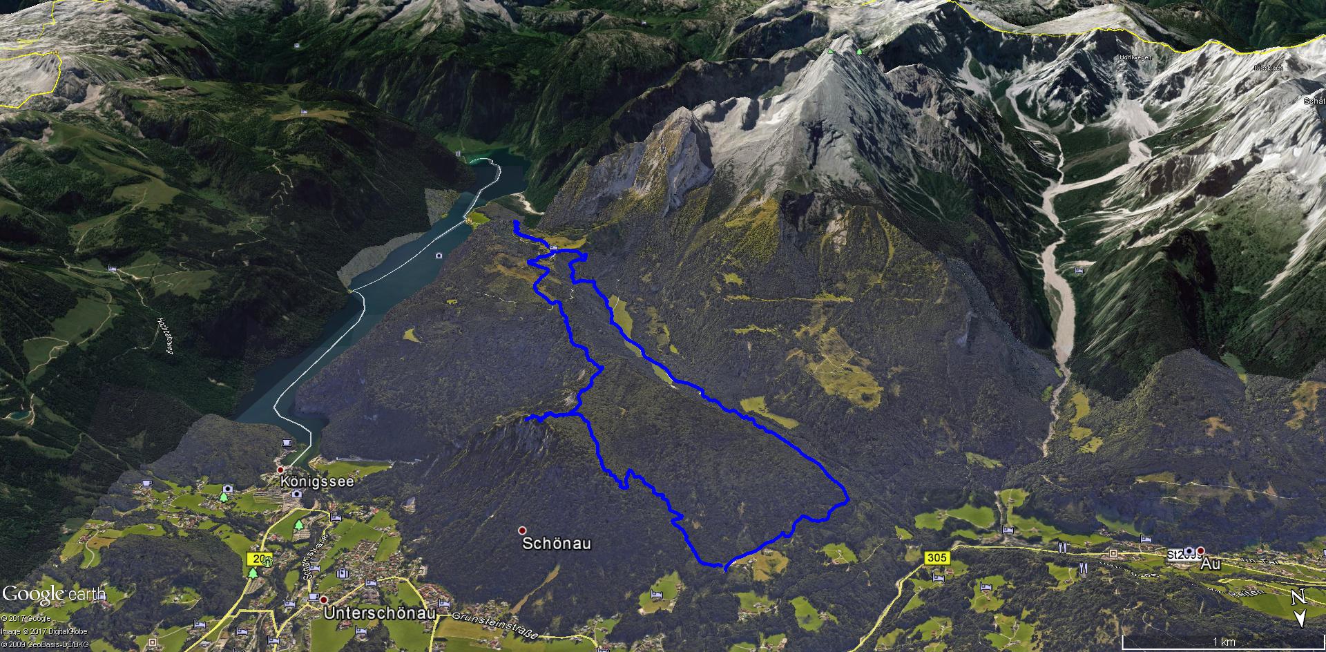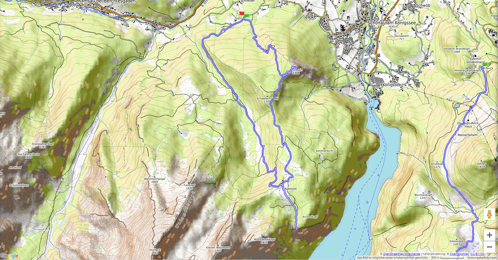 Der Ausgangspunkt ist in Hammerstiel (763 m). Zuerst geht es steil hinauf zur Grünsteinhütte (1220 m). Von hier ist der aussichtsreiche Gipfel des Grünsteins (1306 m) schnell erreicht. Zurück zur Hütte gehen wir Richtung Kührointalm durch Wald und zum Schluss über Fahrweg. Von der Kührointhütte (1420 m) lohnt sich auf alle Fälle der Weg zu dem Aussichtspunkt Archenkanzel (1272 m). Von hier geht der Rinnkendlsteig durch die steile Flanke hinunter nach St. Bartholomä am Königsee. Der Weg hinunter über die Schapbachalm bringt uns zurück nach Hammerstiel.