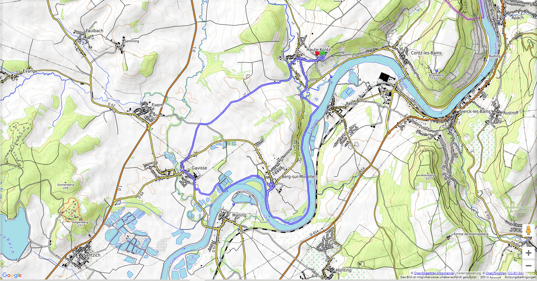 Wir parken an der Kirche Notre-Dame de Marienfloss in Haute-Kontz und wandern zu dem Dorf Gavisse. Von hier aus erreichen wir bald das Moselufer, dem wir bis unterhalb Berg-Sur-Moselle folgen. Ein Abstecher hinauf zu dem Dorf lohnt sich. Neben der Kirche aus dem Jahr 1737 befindet sich das Schloss, eine frühere Residenz der Echternacher Bischöfe. Anschließend geht es weiter am Moselufer entlang bis wir schließlich wieder nach Haute-Kontz zurückkehren.