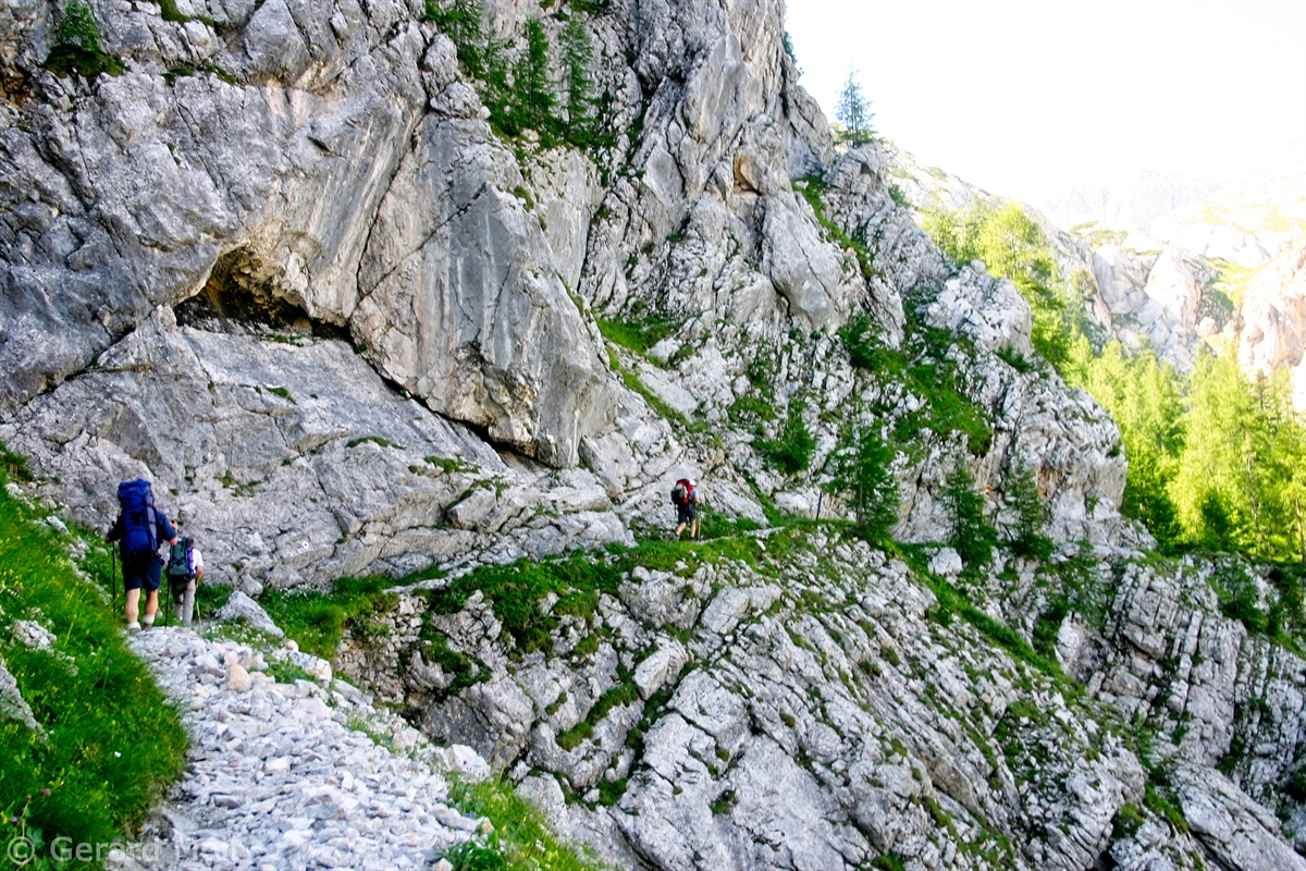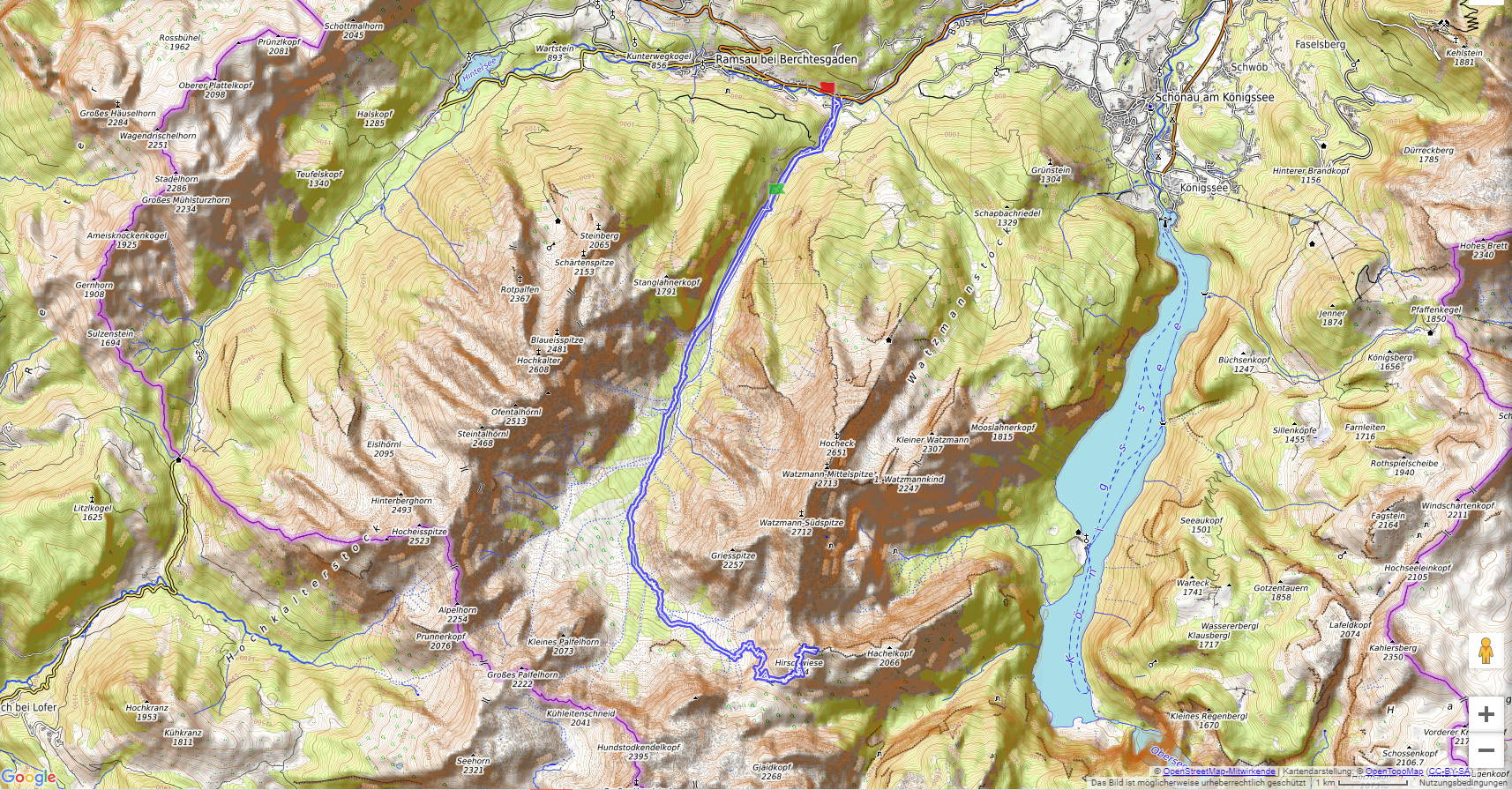 Wir starten auf dem Parkplatz an der Wimbachbrücke (640 m). Durch die Wimbachklamm (oder an ihr vorbei) erreichen wir das Wimbachschloss (937 m), dann die Wimbachgrieshütte (1327 m). Hinter der Hütte steigt der Weg dann steiler an bis zum Pass Trischübel (1798 m) mit seiner Jagdhütte. Der restliche Anstieg zum Gipfel des Hirschwieskopfs (2114 m) führt durch schrofiges Gelände. Der Absteig kann auch über die Sigeretplatte zum Königssee erfolgen.