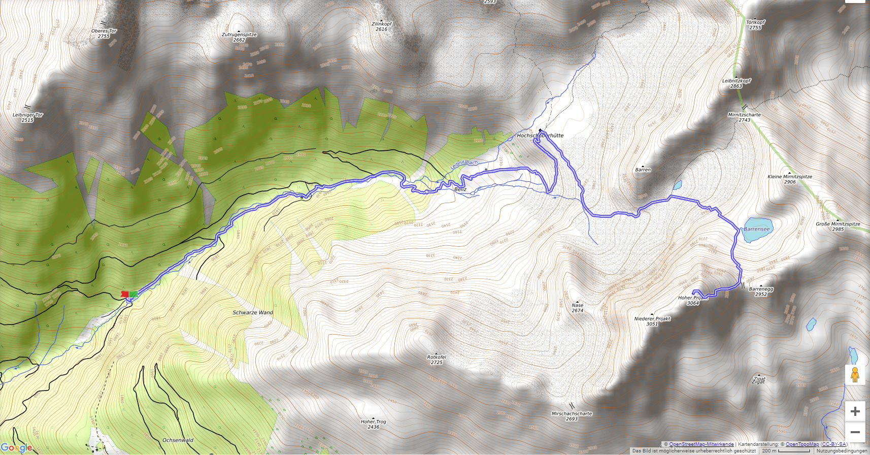Die Hochschoberhütte (2322 m) erreichen wir entweder über den Eduard-Jordan-Weg von einem Parkplatz (1656 m) oberhalb von St. Johann im Walde oder von der Lienzer Hütte. Wir steigen hinauf zum Barrensee, dann geht steil weiter zum Gipfel des Hohen Prijakts (3064 m). Der Übergang zum Niederen Prijakt (3056 m) ist heikel und mit Vorsicht zu begehen.