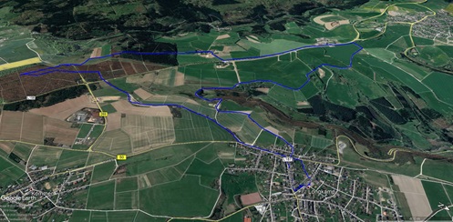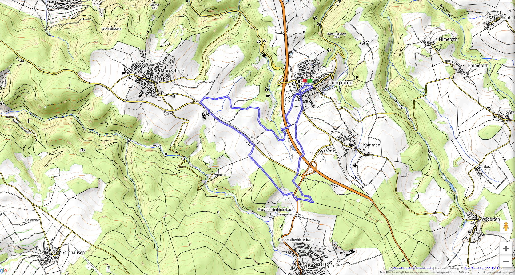 Wir starten in Longkamp auf dem großen Parkplatz bei der Kirche und folgen dem Hubertusweg bis nahe an Monzelfeld. Dann geht es neben der L158 bis zum Birkenhof und durch Wälder und Felder zurück nach Longkamp. Interessant ist das zweimalige Überqueren der B50neu, negativ waren bei unserer Begehung im Januar 2020 teils fehlende Markierungen sowie der durch Forstarbeiten bedingte schlechte Zustand des Weges.