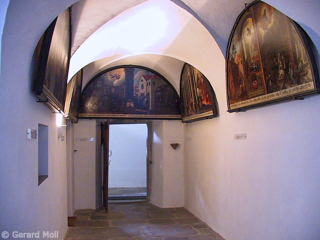 Bild in Lightbox öffnen (open image in lightbox). Der Kreuzgang des Franziskanerklosters. Die 1706 - 1709 von dem Franziskanerbruder Lukas Plazer geschaffenen 31 Tafelbilder sind die ausführlichste Darstellung des Franziskuslebens in der europäischen Kunstgeschichte.