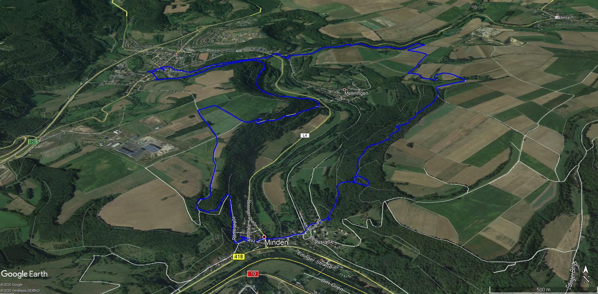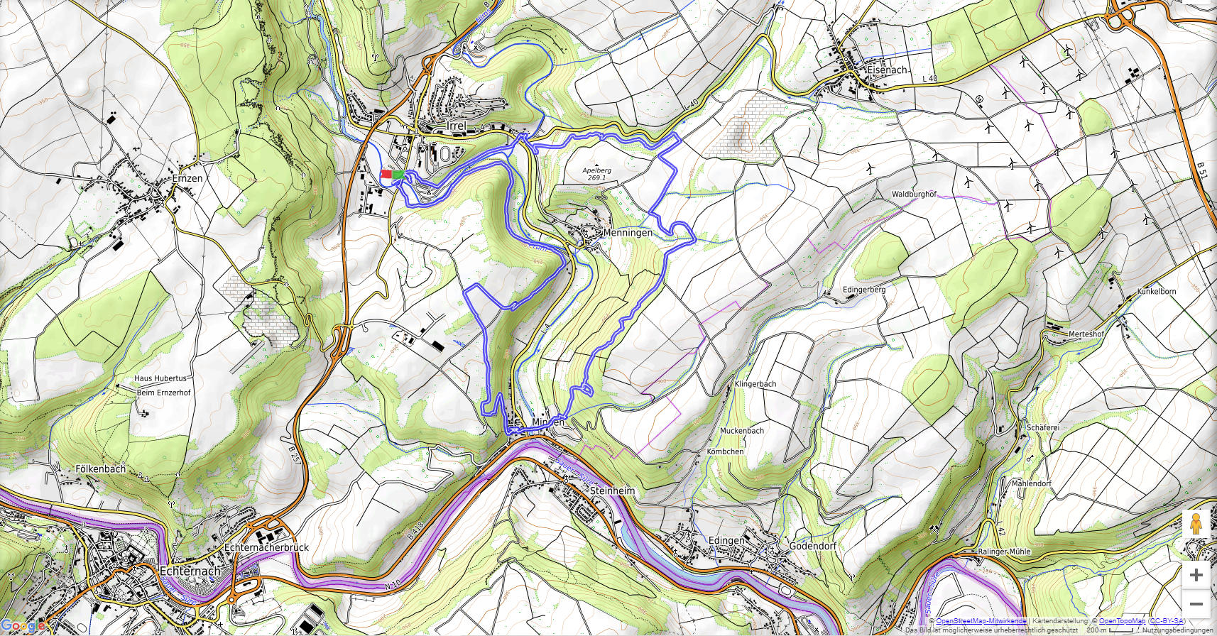 Der mit der Nummer 67 markierte Weg startet auf dem Parkplatz am Ortseingang von Irrel und führt zuerst zur Irreler Mühle. Nach dem Anstieg auf den Apelberg überqueren wir das Plateau oberhalb von Menningen, dann geht es hinunter nach Minden, wo wir die Prüm überqueren. Auf dem linken Prüm-Ufer kehren wir nach Irrel zurück.