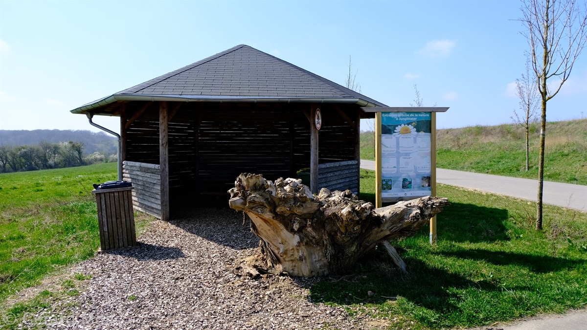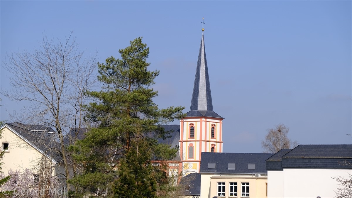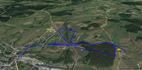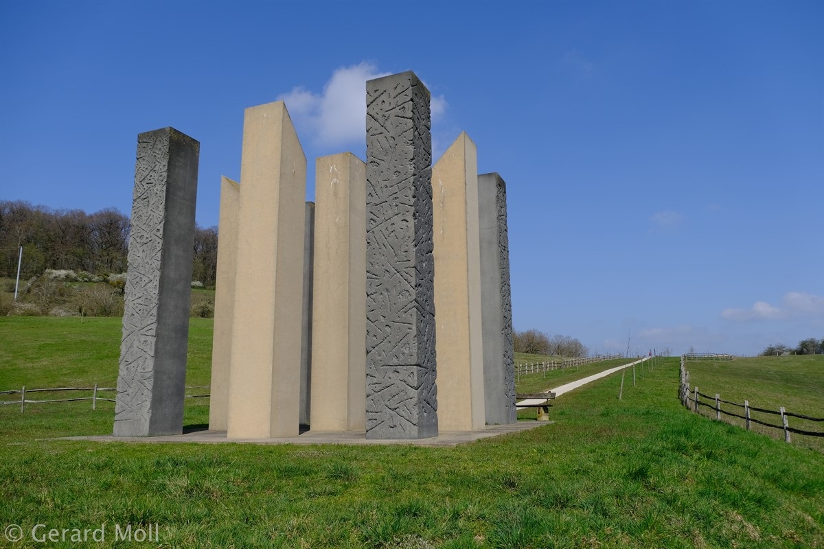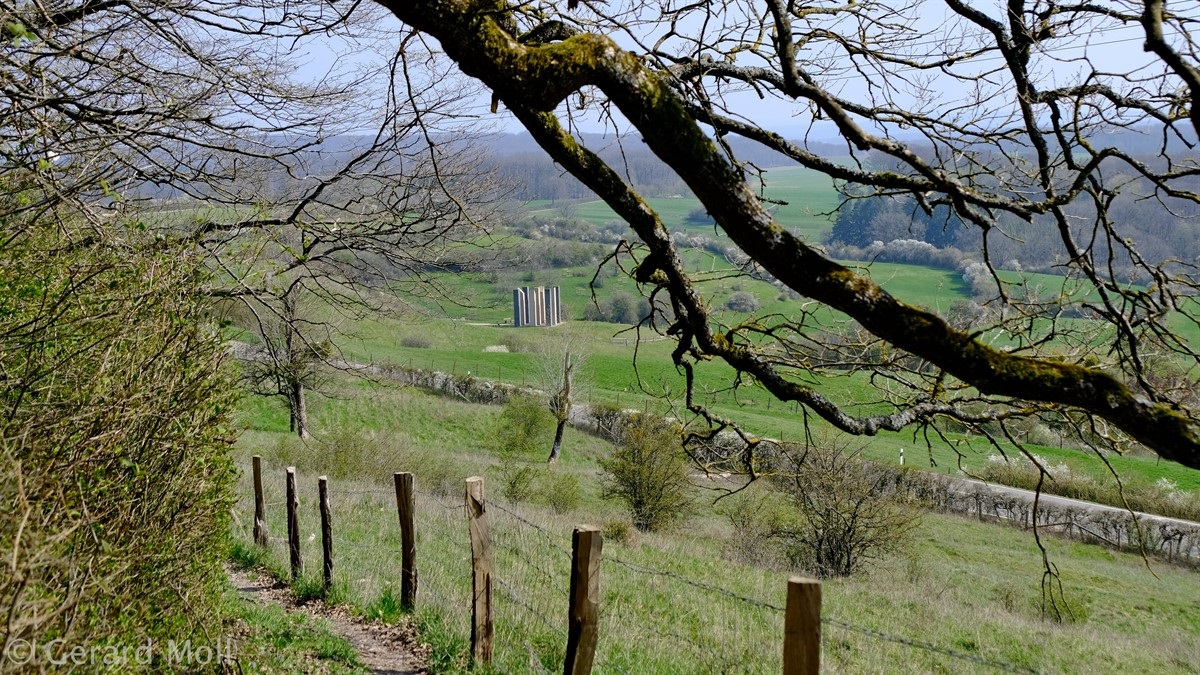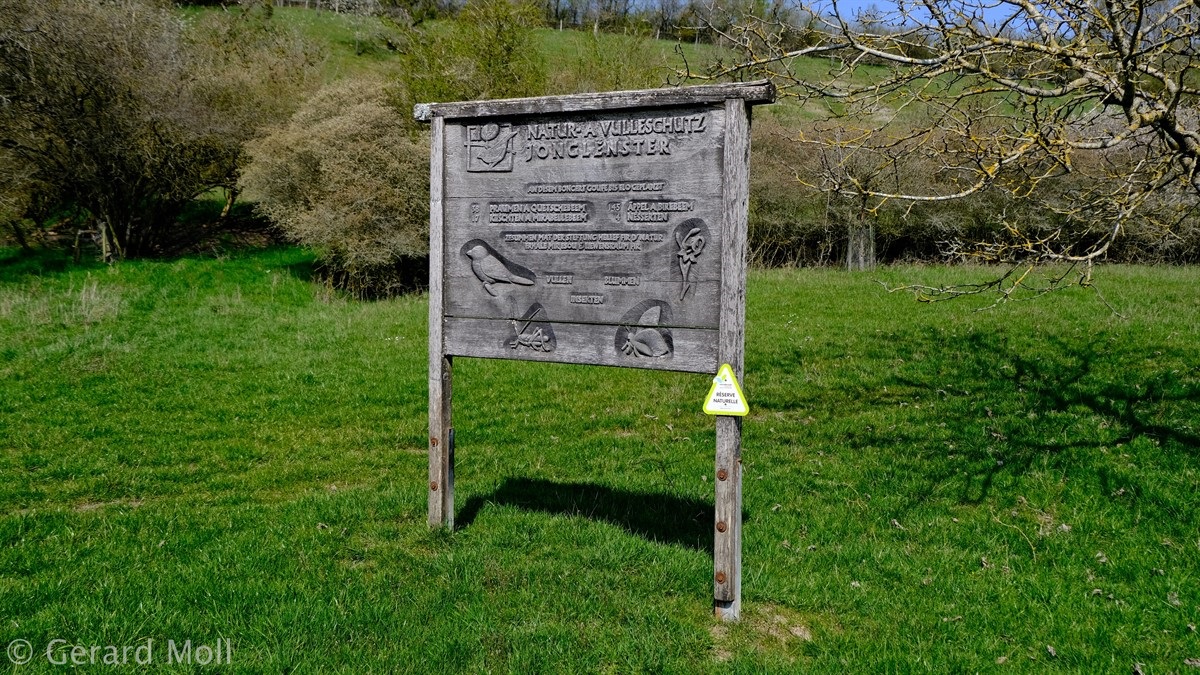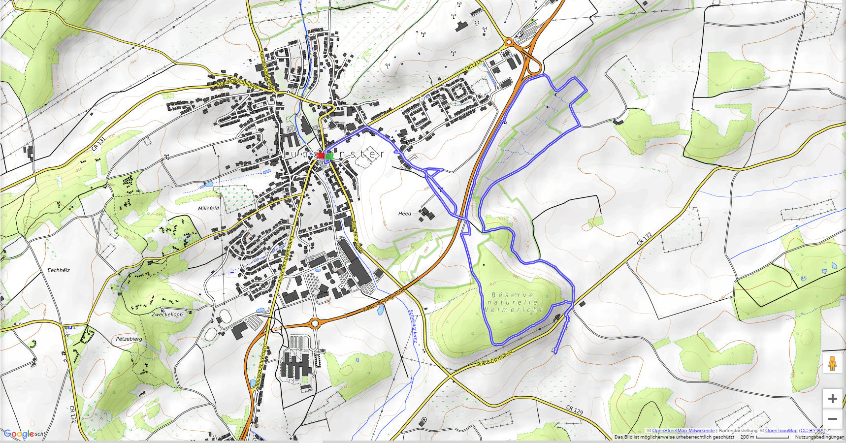 Wir haben die Tour abgekürzt und sind nur den östlichen Teil des Weges gegangen. Vom Parkplatz im Zentrum von Junglinster sind wir zuerst der Hauptstraße gefolgt und dann in die rue de la Montagne abgebogen. Nach der Unterführung haben wir uns rechts gehalten und sind durch den Wald nach Süden gewandert. Nach einem steilen Abstieg erreichten wir das verfallende, 1899 erbaute, Weimericher Schloss. Hier bot sich ein kurzer Abstecher zum Denkmal für die Opfer des Straßenverkehrs an. Der Weiterweg führte durch die Halbtrockenrasen des Naturschutzgebietes Weimericht, bis uns ein steiler Anstieg auf eine Fahrradpiste brachte, der wir zurück zu der Unterführung gefolgt sind.