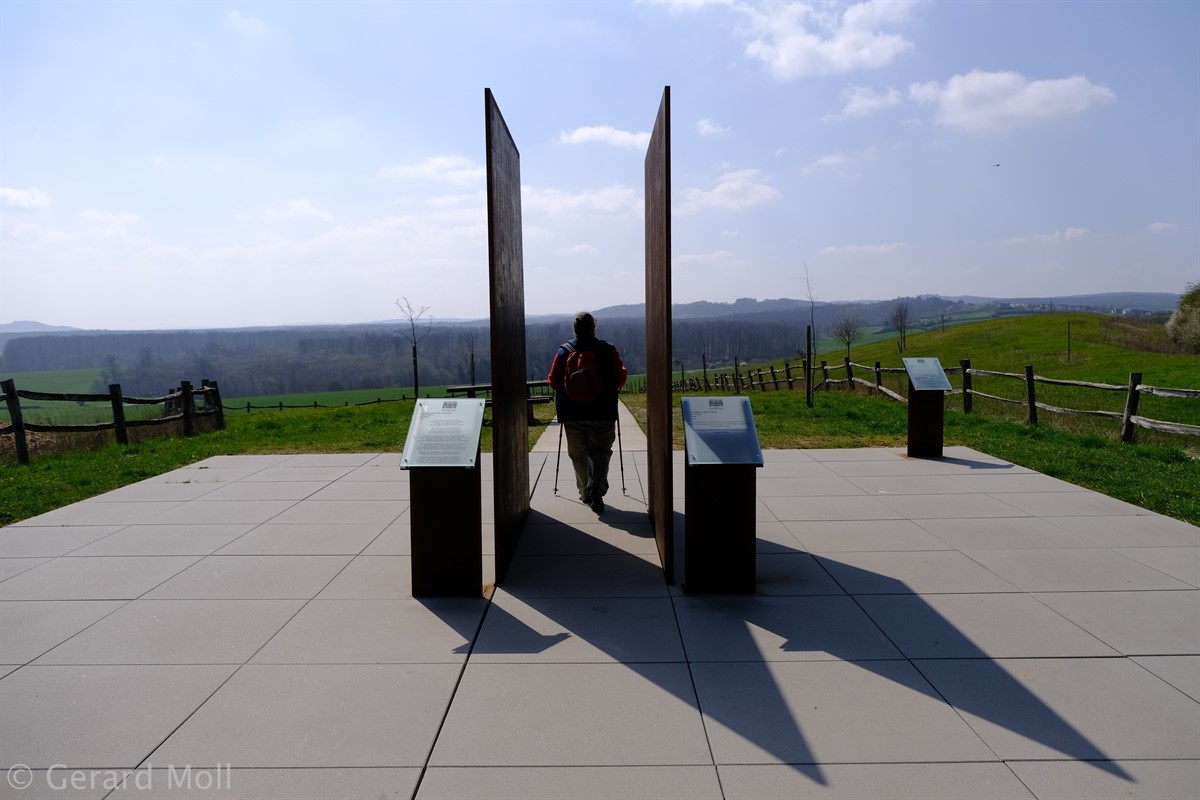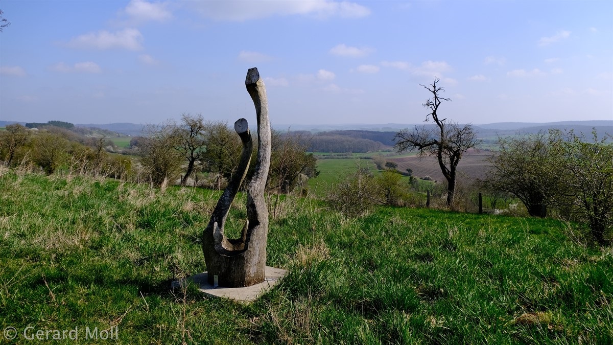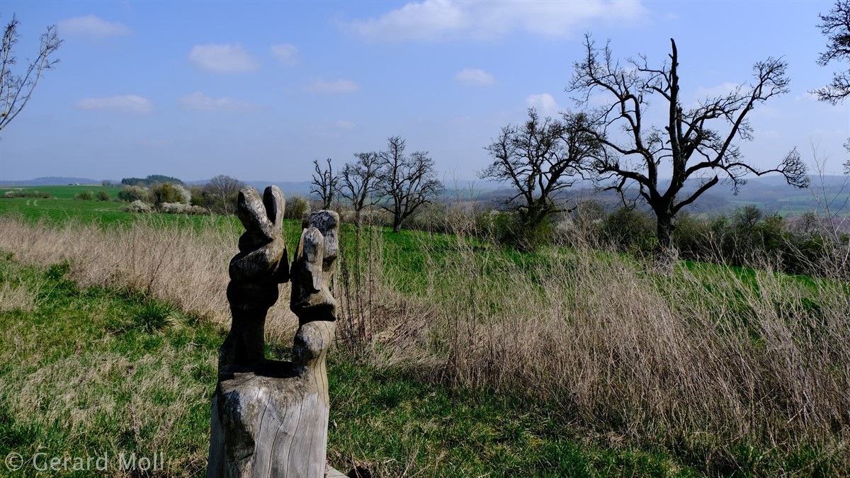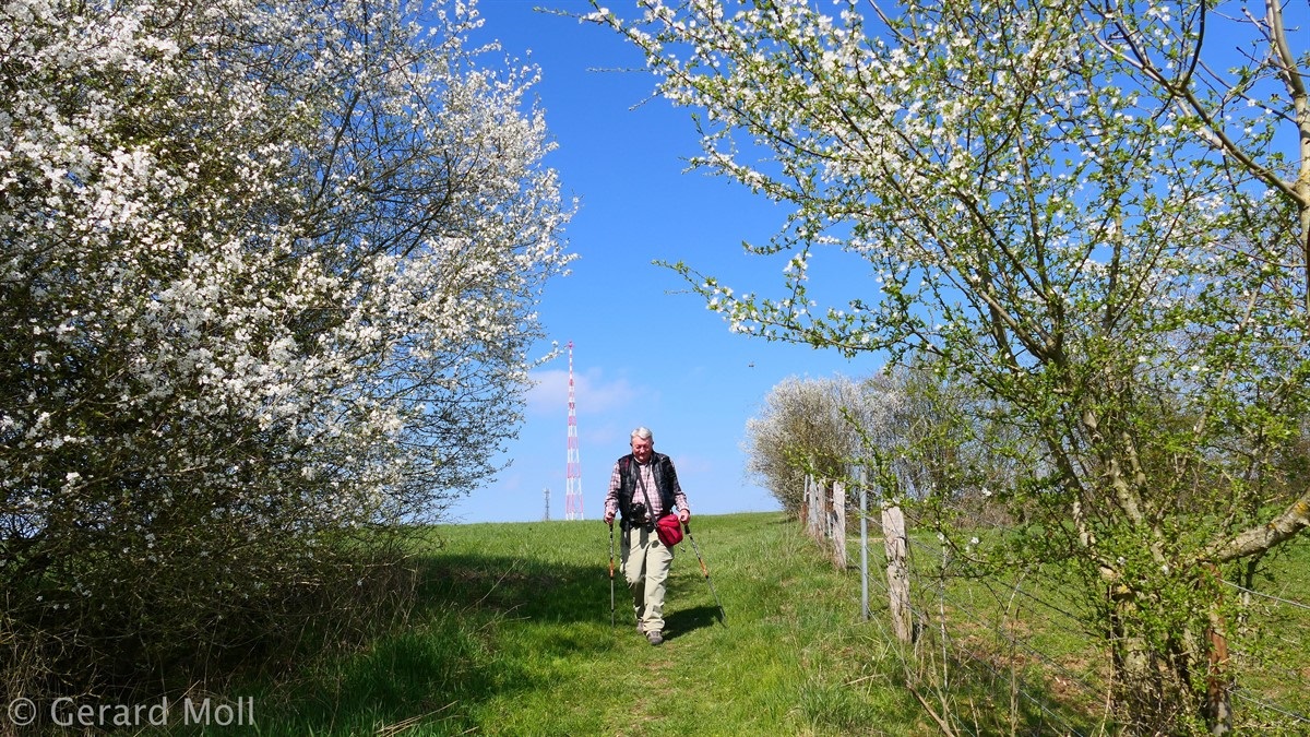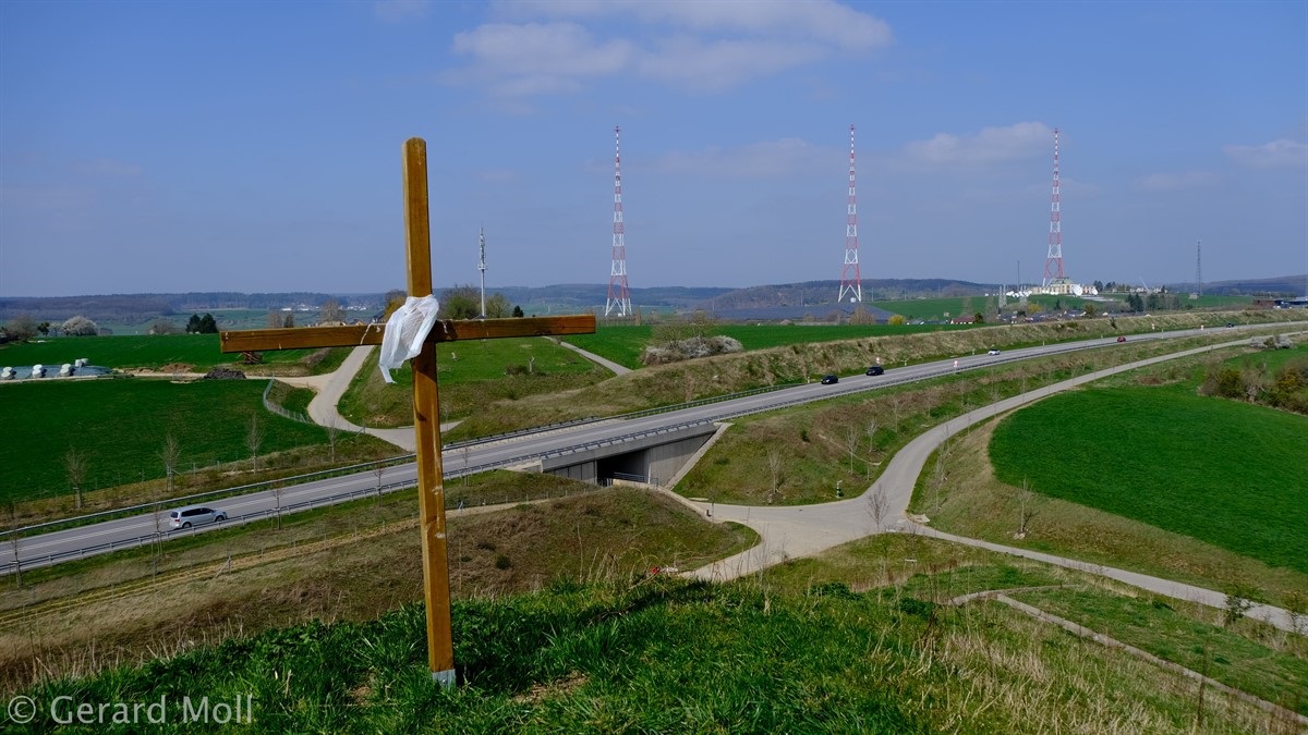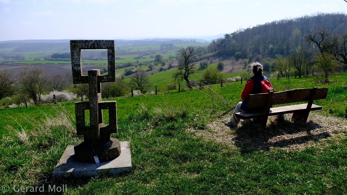 Wir haben die Tour abgekürzt und sind nur den östlichen Teil des Weges gegangen. Vom Parkplatz im Zentrum von Junglinster sind wir zuerst der Hauptstraße gefolgt und dann in die rue de la Montagne abgebogen. Nach der Unterführung haben wir uns rechts gehalten und sind durch den Wald nach Süden gewandert. Nach einem steilen Abstieg erreichten wir das verfallende, 1899 erbaute, Weimericher Schloss. Hier bot sich ein kurzer Abstecher zum Denkmal für die Opfer des Straßenverkehrs an. Der Weiterweg führte durch die Halbtrockenrasen des Naturschutzgebietes Weimericht, bis uns ein steiler Anstieg auf eine Fahrradpiste brachte, der wir zurück zu der Unterführung gefolgt sind.