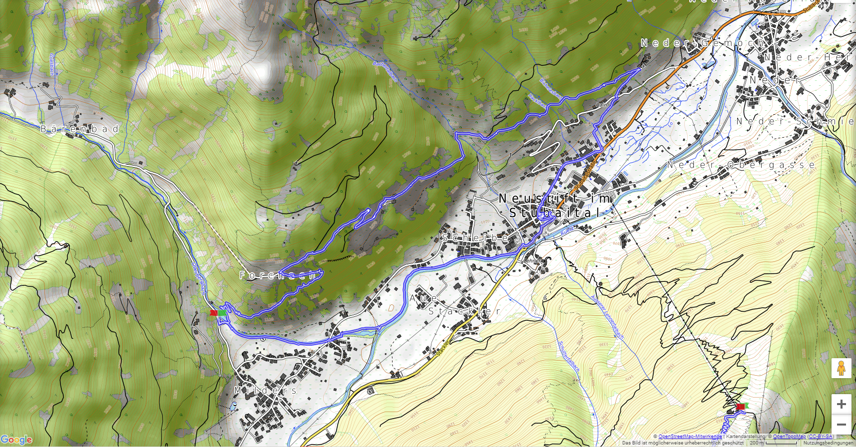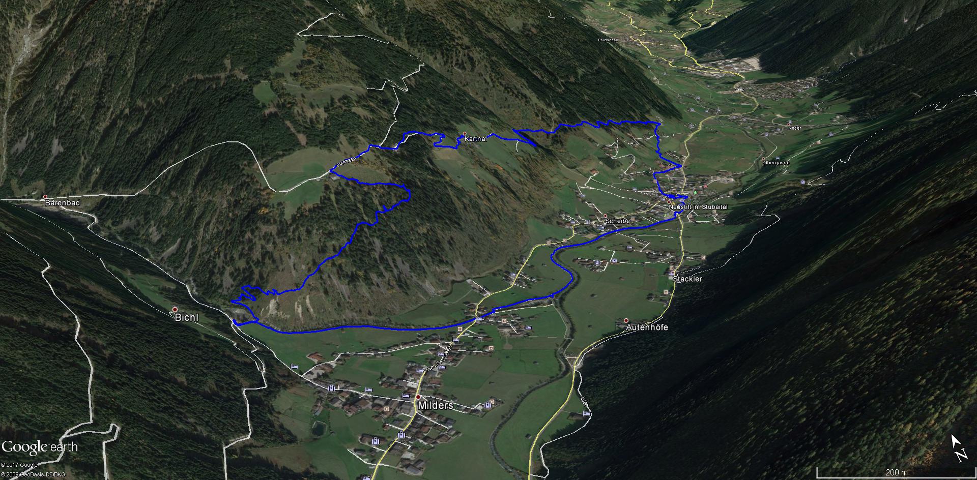 Wir parken nördlich von Milders im Stubaital auf etwa 1110 m. Über Forchach (1384 m) gelangen wir zum Kartnallhof (1284 m). Von hier geht es hinunter nach Neustift und an Ruetz und Oberbergbach zurück zum Ausgangspunkt.