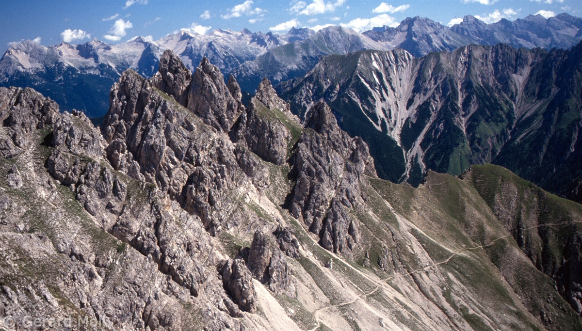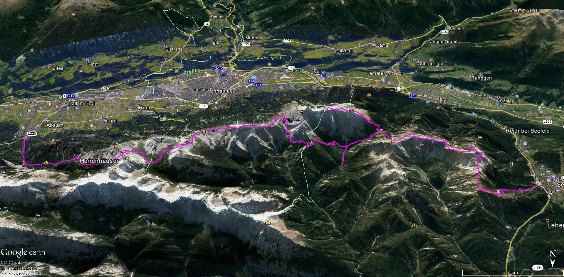 Diese mehrtägige Tour beginnt in Seefeld. Zuerst geht es über Seefelder Joch (2060 m) und Seefelderspitze (2221 m) zum Härmelekopf (2224 m) und zur Reither Spitze (2374 m). Der Weg ist zum Teil mit Drahtseilen gesichert. Nach der Übernachtung auf der Nördlinger Hütte führt der Freiungen-Höhenweg über die Kuhlochspitze (2297 m) zum Solsteinhaus. Mit leichtem Gepäck werden von dort der Grosse Solstein (2541 m) und der Kleine Solstein (2637 m) (höher als der Grosse Solstein !) bestiegen. Nach einer Übernachtung im Solsteinhaus geht es dann über den Gipfelstürmerweg und das Frau Hitt Kar zur Felsformation der Frau Hitt. Über die Seegrube und Hafelkarhaus wird die Hafelekarspitze (2334 m) erreicht. Der Goetheweg leitet über die Mandlscharte zur Pfeishütte. Über das Stempeljoch und St. Magdalena steigt man nach Absam ab und kehrt mit Bus und Bahn zurück nach Seefeld.