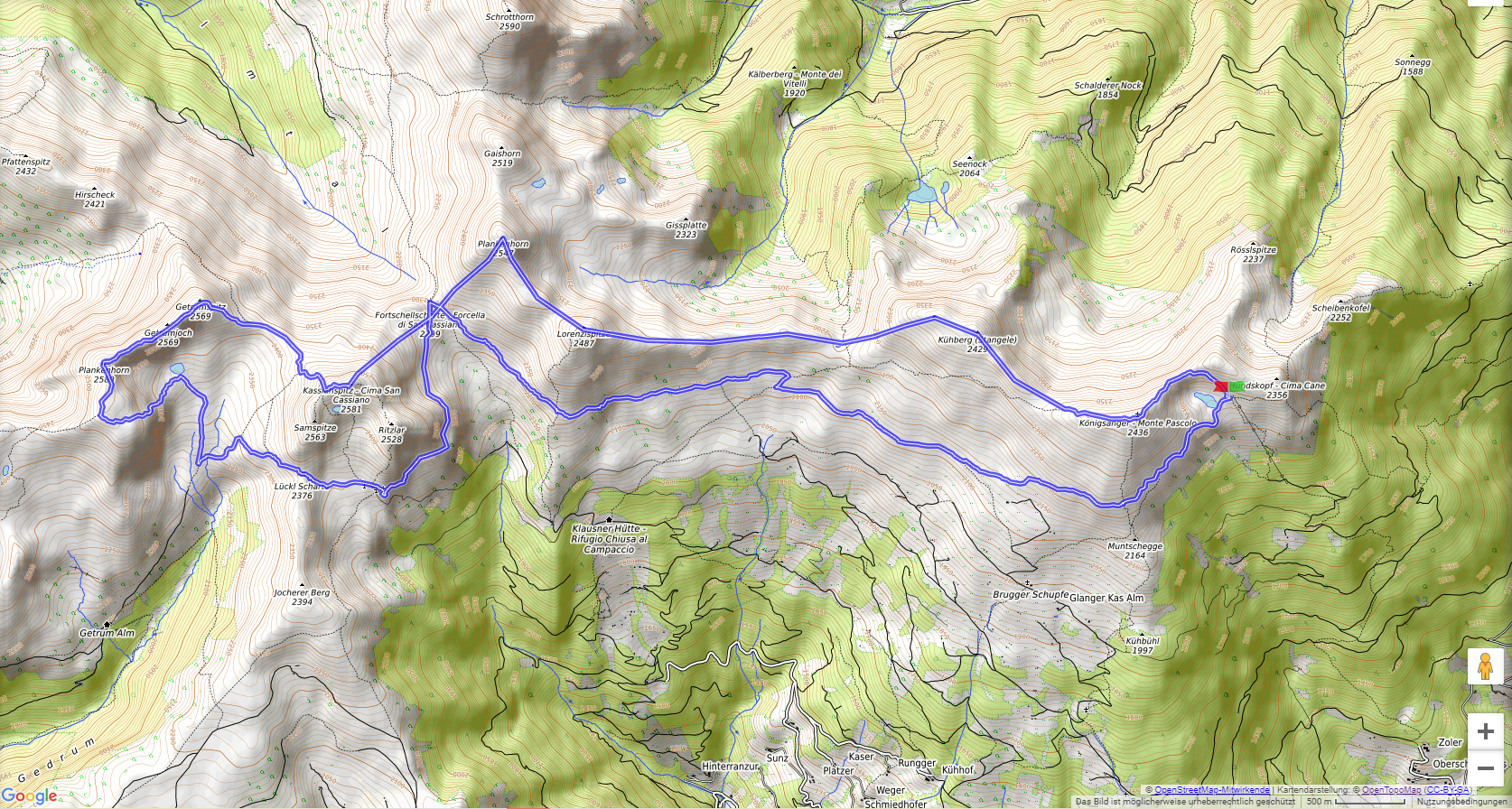 Das Latzfonser Kreuz ist eine der höchstgelegenen Wallfahrten Europas. Normalerweise kann man vom Parkplatz oberhalb von Latzfons über die Klausner Hütte hierher gelangen. Wir haben einen Aufenthalt auf der Radlseehütte genutzt, um eine lange, teils weglose Überschreitung über Königsangerspitze (2436 m), Kühberg (2429 m), Lorenzispitze (2483 m), Plankenhorn (2543 m), Kassianspitze (2581 m) und Ritzlar (2528 m) zum Schutzhaus am Latzfonser Kreuz zu machen. Durch schönes Almgelände ging es dann zurück zur Radlseehütte.